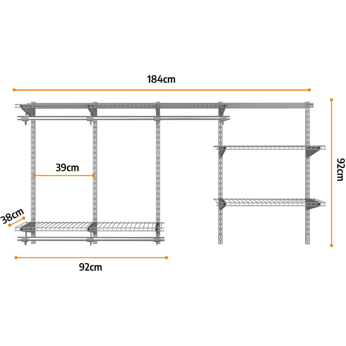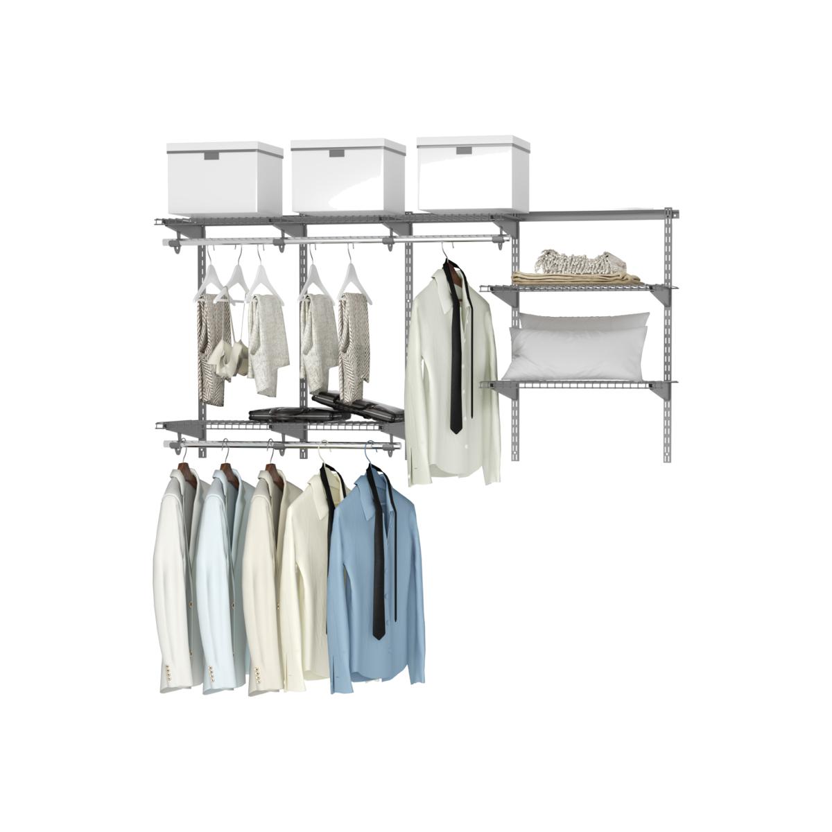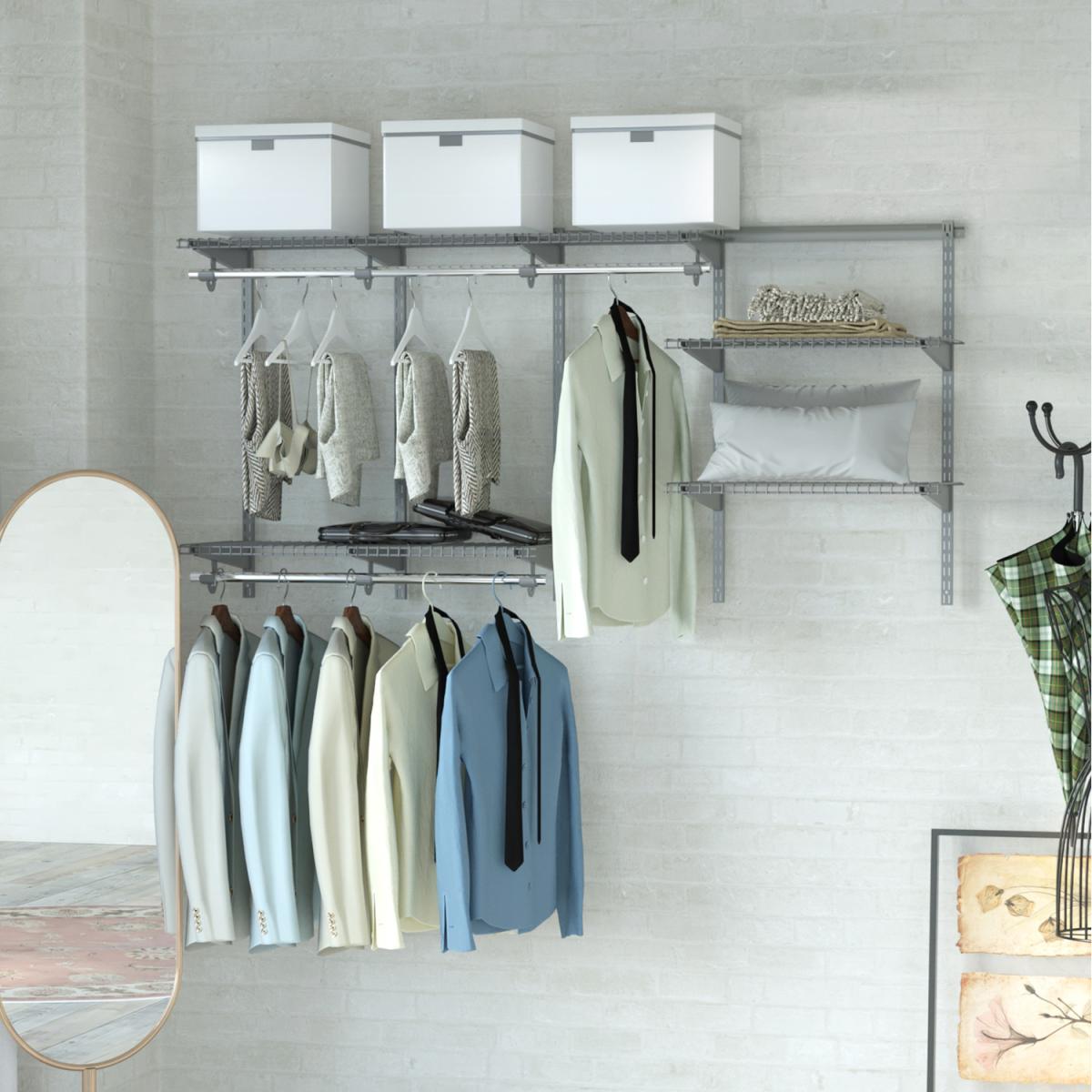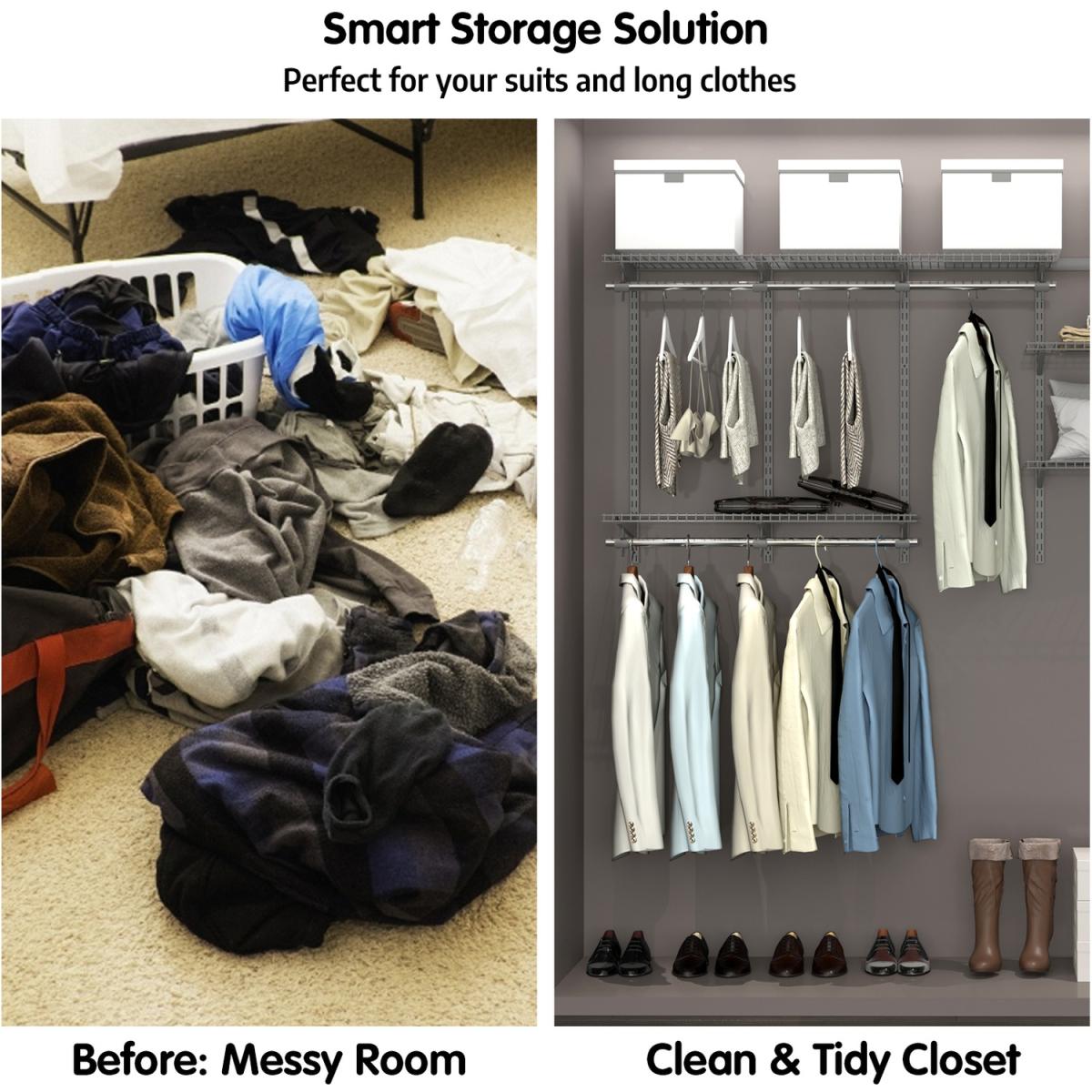 Our adjustable closet organizer kit can facilitate your life! These organizers is designed with adjustable shelves so that you can customize to perfection. It has multiple functions and is widely used in bedrooms, living rooms, kitchen, etc. Multiple organizing shelves help you classify items easily and the sturdy hanging rods also help you find the perfect storage solution according to your requirements. Made of premium steel, this adjustable closet organizer has a stable frame and can stand the test of time. Each rod can hold up to 10kg and each shelve can hold up to 10kg. The kit includes all components. What's more, the surface of the shelves is easy to clean. This simple organizer kit will make your home full of tidy!