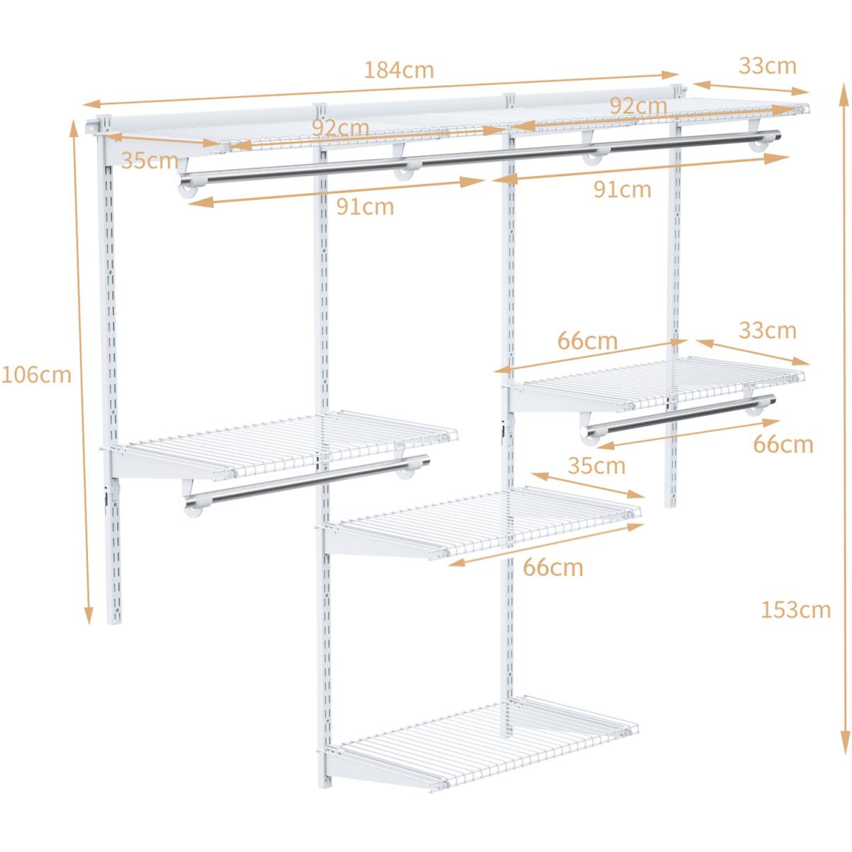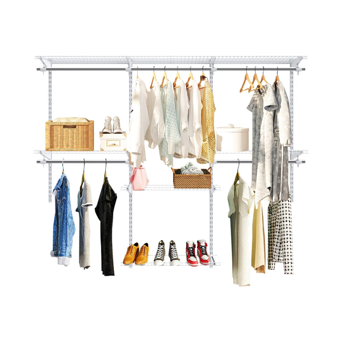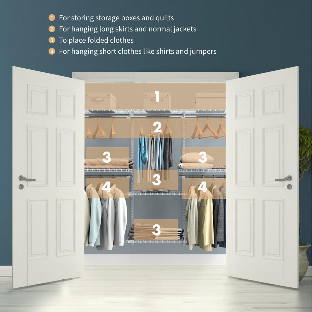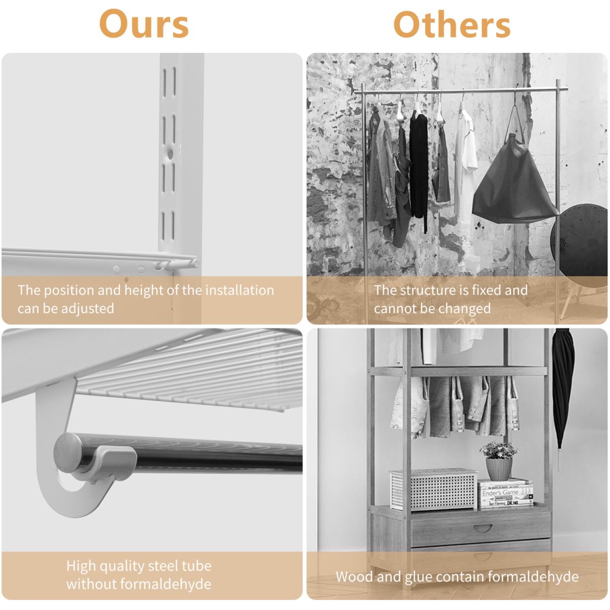 Are you still bothered by the messy clothes and the cramped space? Our custom closet kit will give you a perfect storage solution!Made of selected powder-coated steel, this custom closet is anti-corrosion and rustproof with sleek finish. With fully adjustable shelves and clothes hanging rods, this DIY closet system can give full play to your assembly creativity. It is suitable for bedroom, storage room, living room and other places, which can keep your items in order. Detailed instructions and all accessories are included to make installation a breeze. If you are looking for such a custom closet organizer system, don't hesitate to buy it!