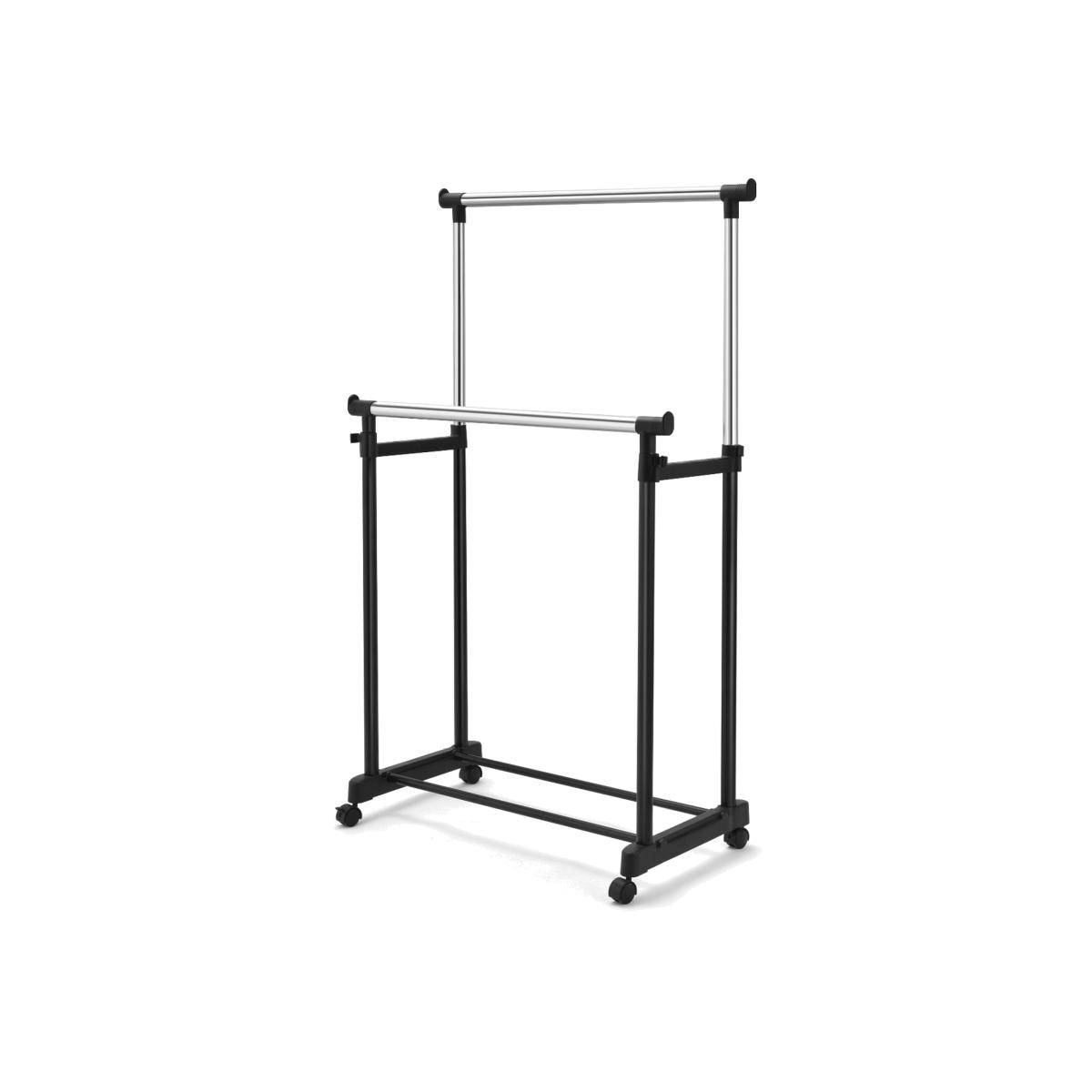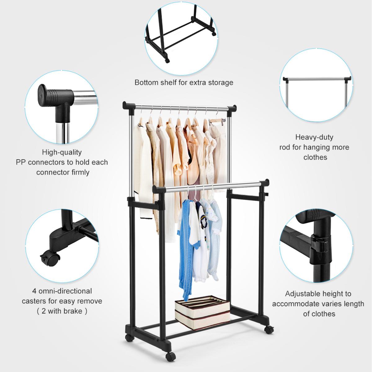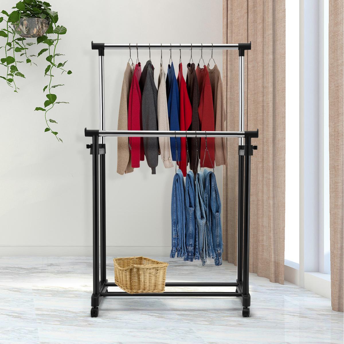One rod is not enough for your collection? Try our double-rail garment rack! You will have your abundant fashion collection organized and upright with this height-adjustable 2-rod cloth hanging rail. It also has a lower shelf for sundries and is a versatile option for home, store, and so on. The strong galvanized rods and a powder-coated frame make sure the whole piece won't easily rust out. And thanks to the easy-sliding wheels with brakes, this cloth hanger is light to move. In addition, it is easy to assemble and disassemble with simple steps.
