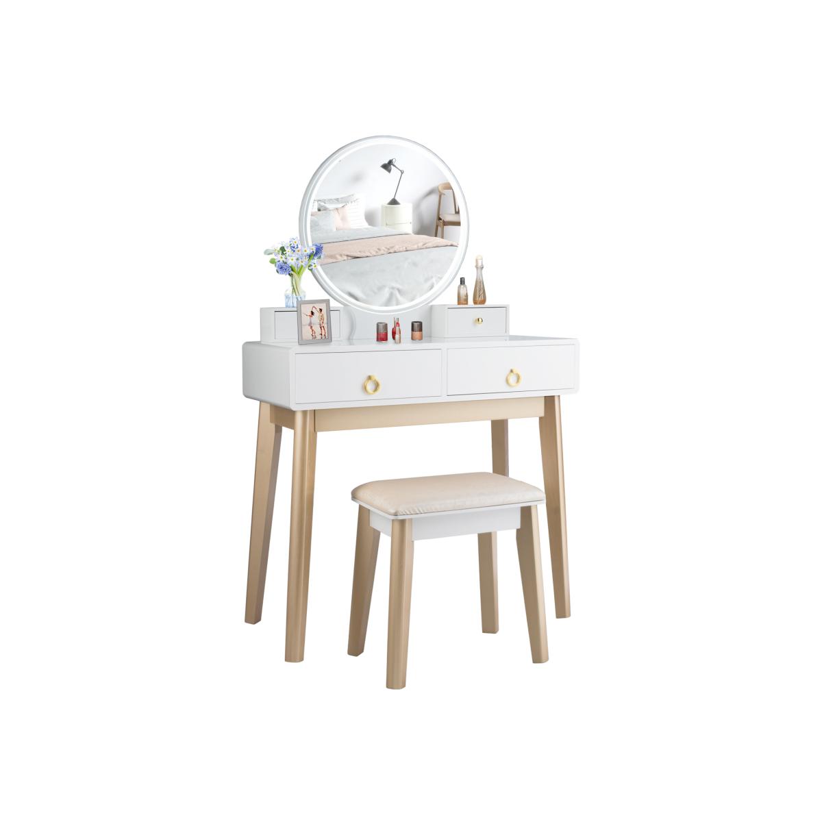 Get your fresh day started from our dressing table set! Made of MDF of solidity and hardwood of durability, our vanity table set will give you a long-time and quality company. 4 drawers have your eyelashes, lipsticks, foundations, and other personal items organized with tidiness while the cushioned stool delivers a comfortable sitting option. The oval mirror with touching dimmer offers you 3 modes of light setting, helping you put on the perfect makeup for your day and it can also be removed along with 2 small drawers to create an ample-desktop writing table.