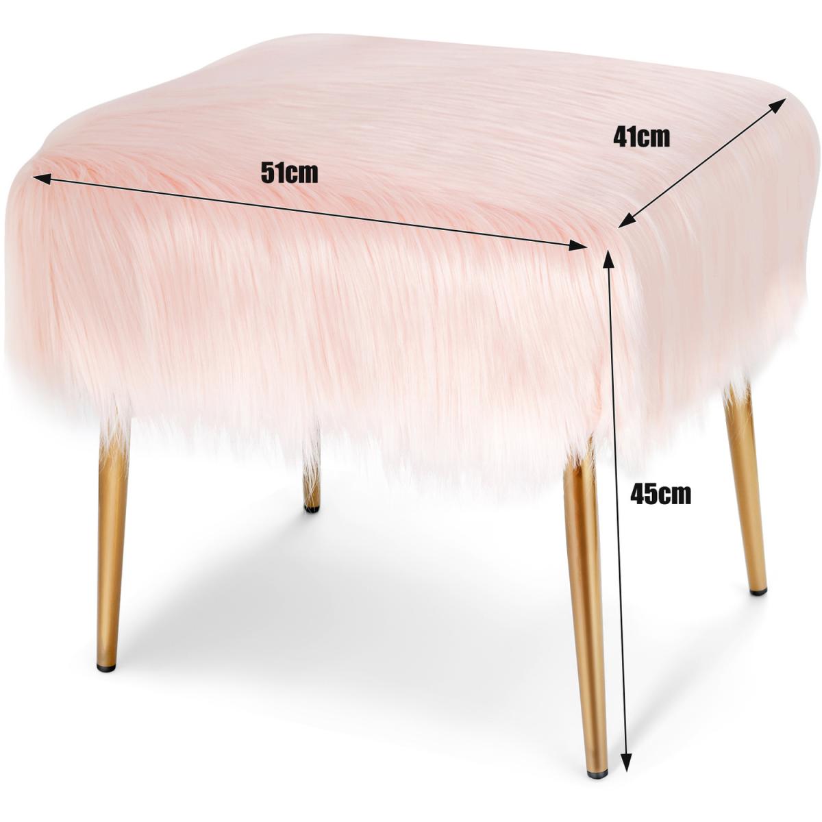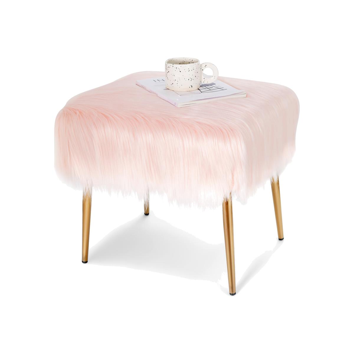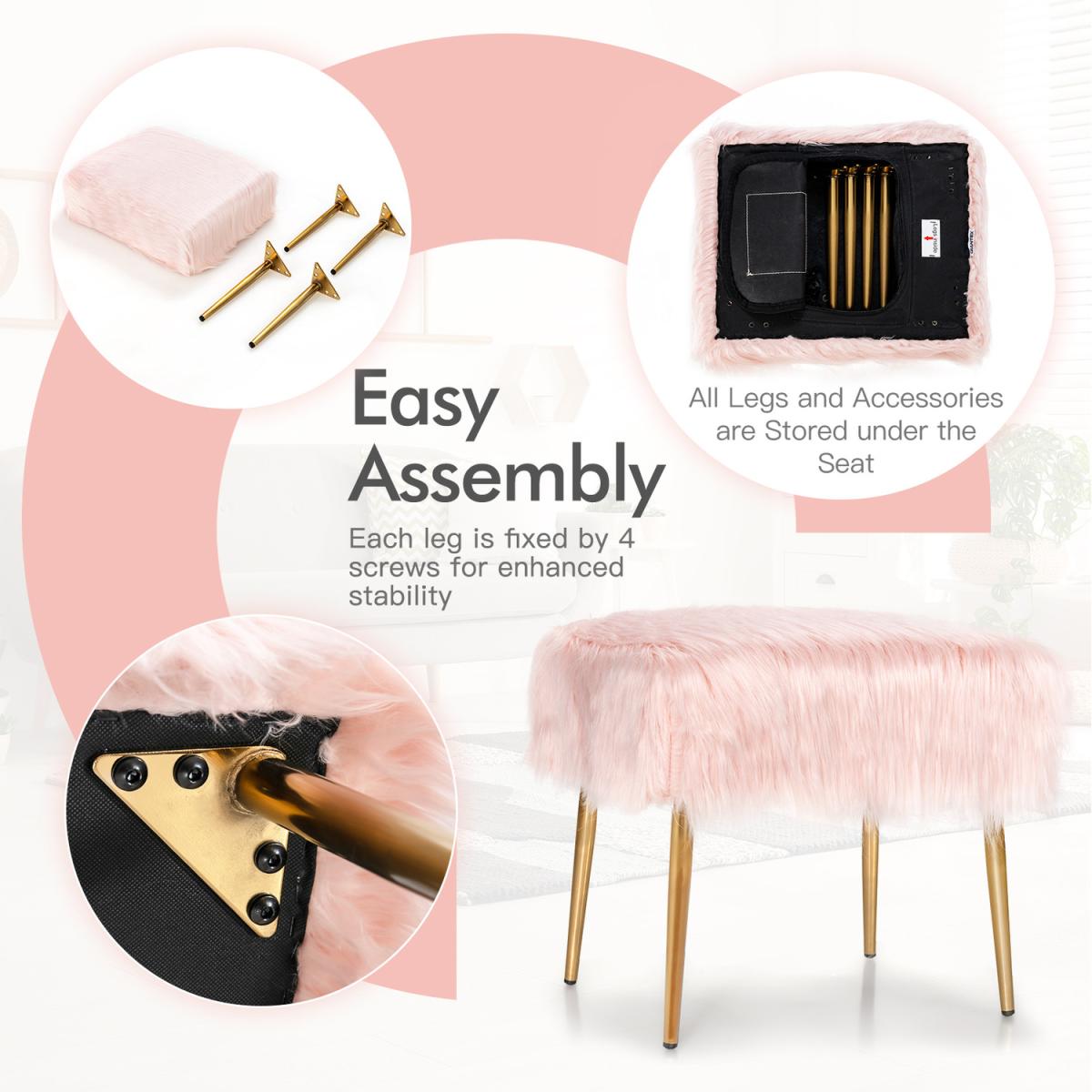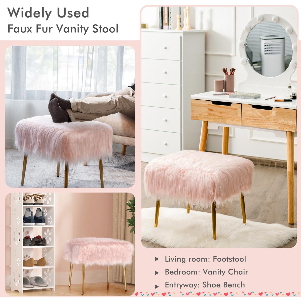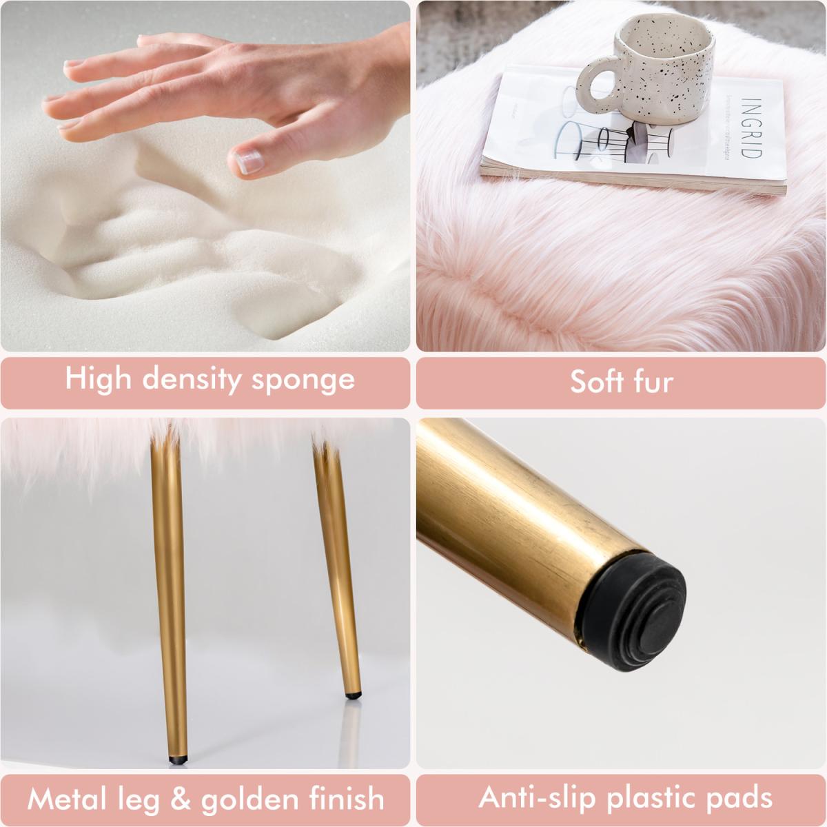 Bring the warm and inviting feeling to your home with our faux fur vanity stool!Featuring plush faux fur and slim golden legs, this vanity chair is quite a sophisticated decoration in your home with actual functionality. The seat base is filled with a high-density sponge to make sure that your buttocks have the uttermost comfort. Each leg is fixed by 4 screws and equipped with anti-scratch pads for enhanced stability. And this vanity chair assembles in 4 steps, which is fast and simple. All legs and accessories are stored under the seat. This vanity chair is widely used for different purposes from living room footstool, bedroom vanity chair to entryway shoe bench.