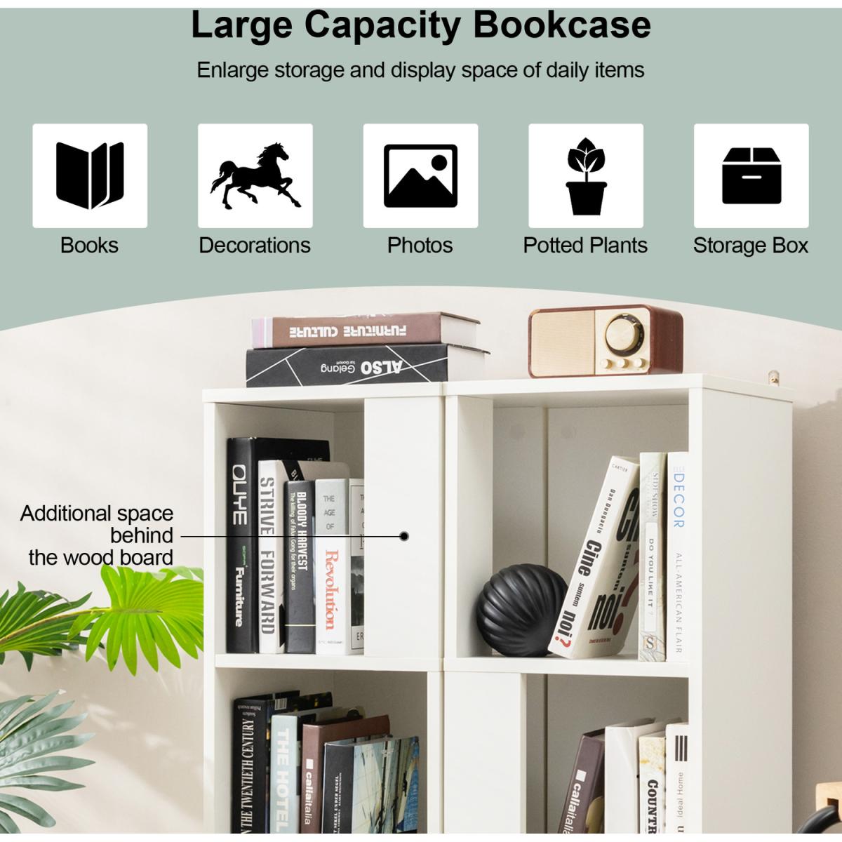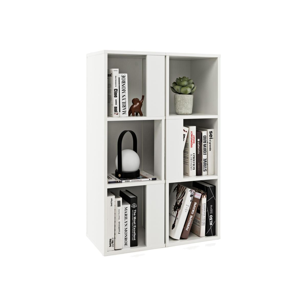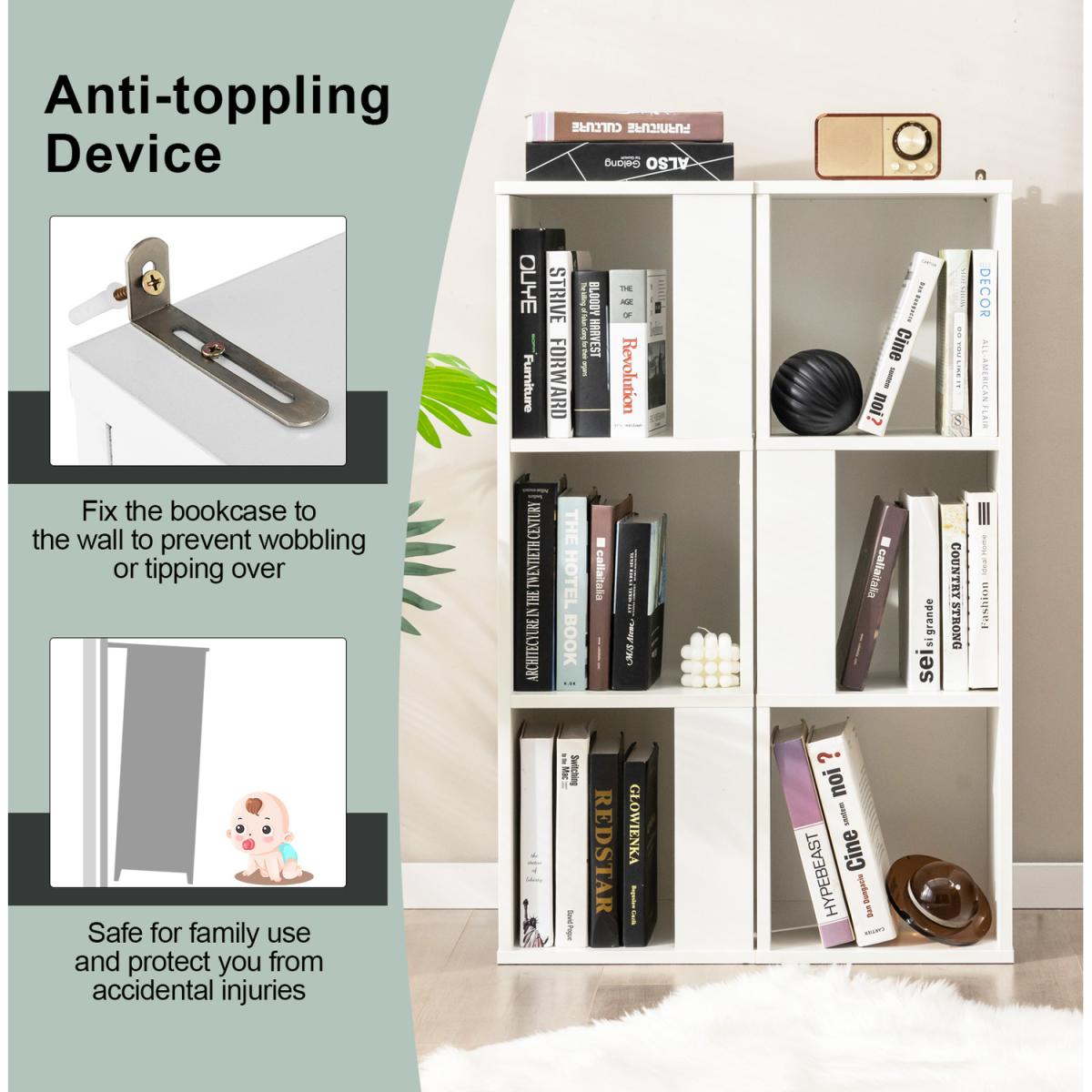 Our bookcase set is an eye-catching piece in your home! 6 open compartments provide ample storage and classified space for a variety of items, which can well suit your storage needs. What's more, the wide cabinet top is a perfect platform to display some decorative items. Crafted of durable engineered wood, our bookcases are sturdy and reliable for long-term use. Equipped with anti-tilting device, the bookcases are not easy to wobble or collapse. With its unique asymmetric design and geometric shape, these bookcases are widely applicable to various occasions, such as living room, bedroom, and kid's room, etc. It is a practical storage solution to your clutter, whether used as bookcase or cube storage organizer.