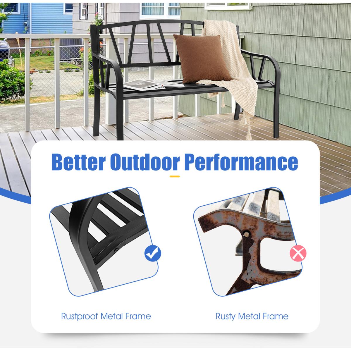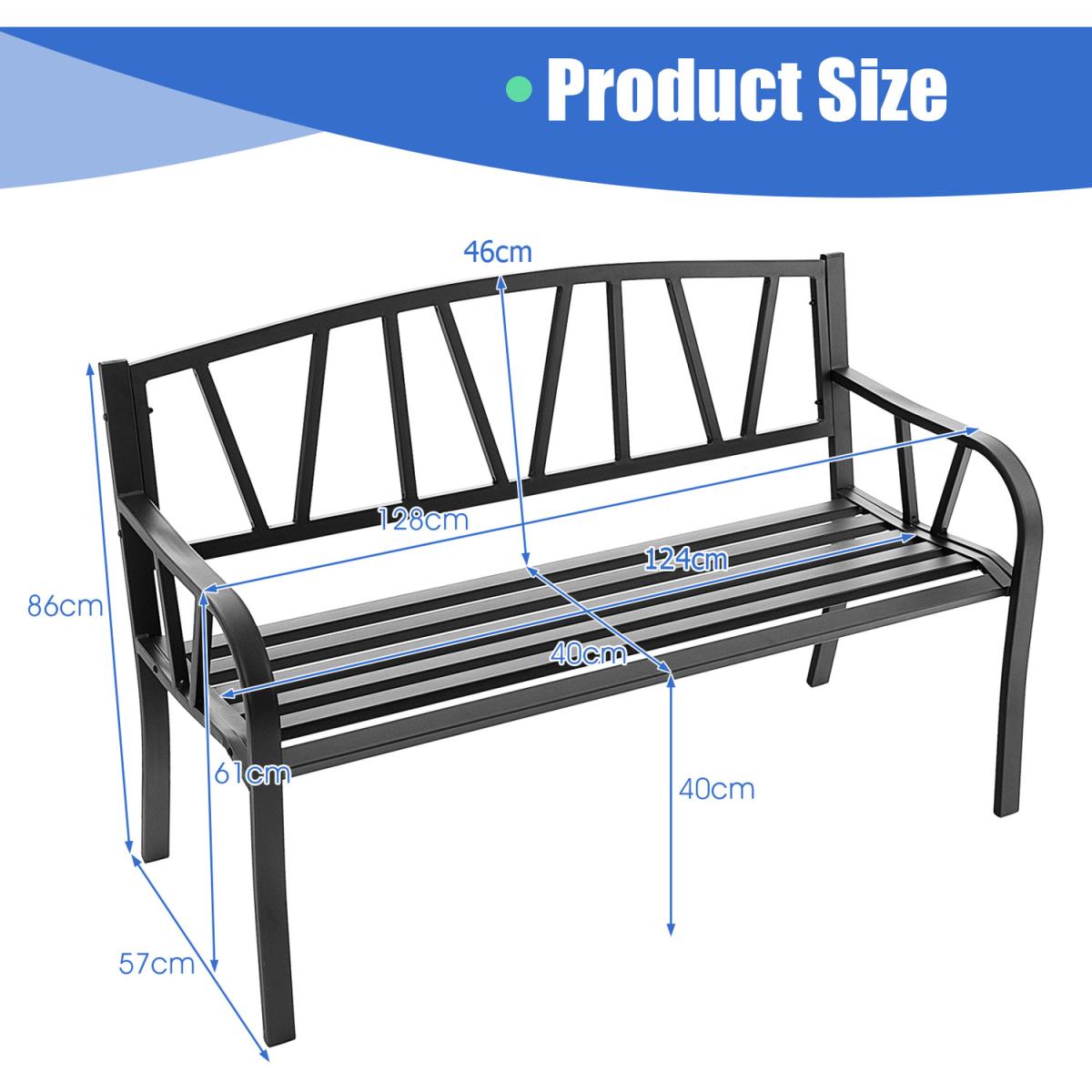 Enjoy outdoor leisure time with your beloved one by sitting on our outdoor garden bench!Made of sturdy and rustproof metal frame, this garden bench is stable and large enough to accommodate 2 people sitting at the same time. What's more, the curved armrests and seat as well as the 105 degree ergonomic angle will make you feel comfortable while sitting on this metal bench. And the slatted design not only facilitates water drainage but ensures a breathable sitting experience. In addition, the simple style and black color add a modern addition to your porch, garden or backyard.