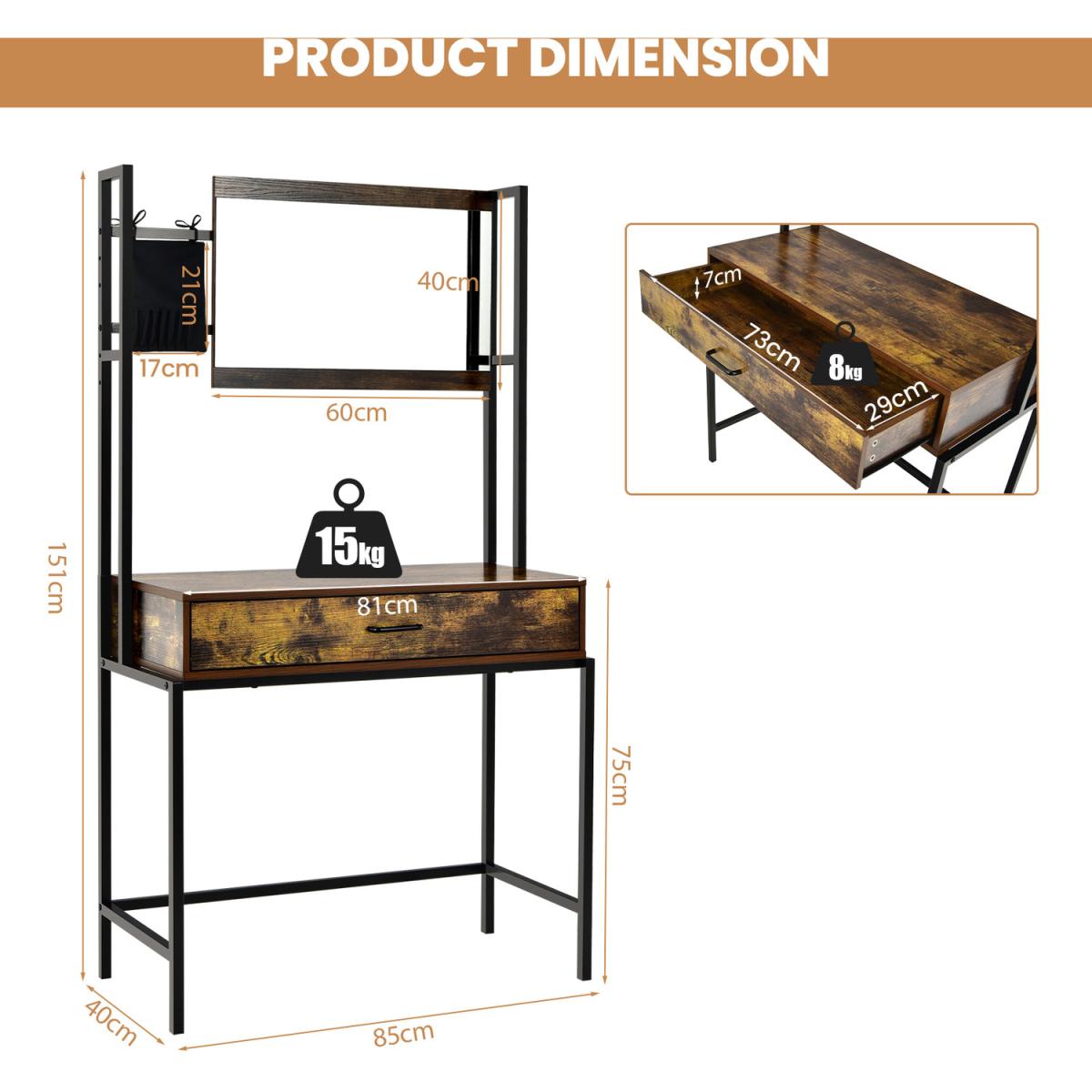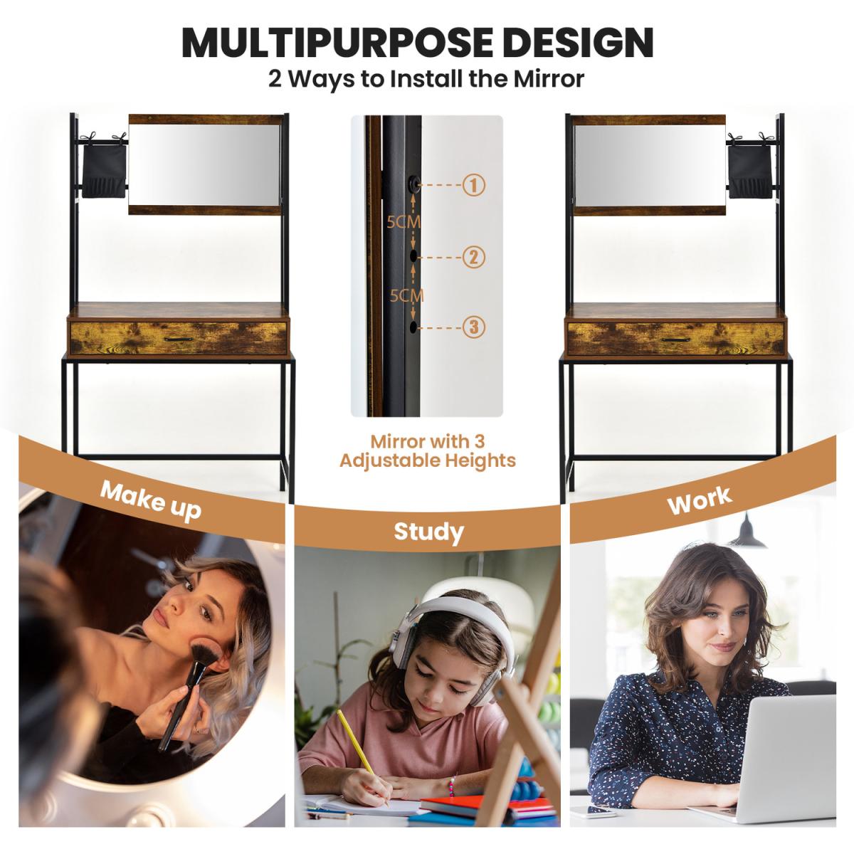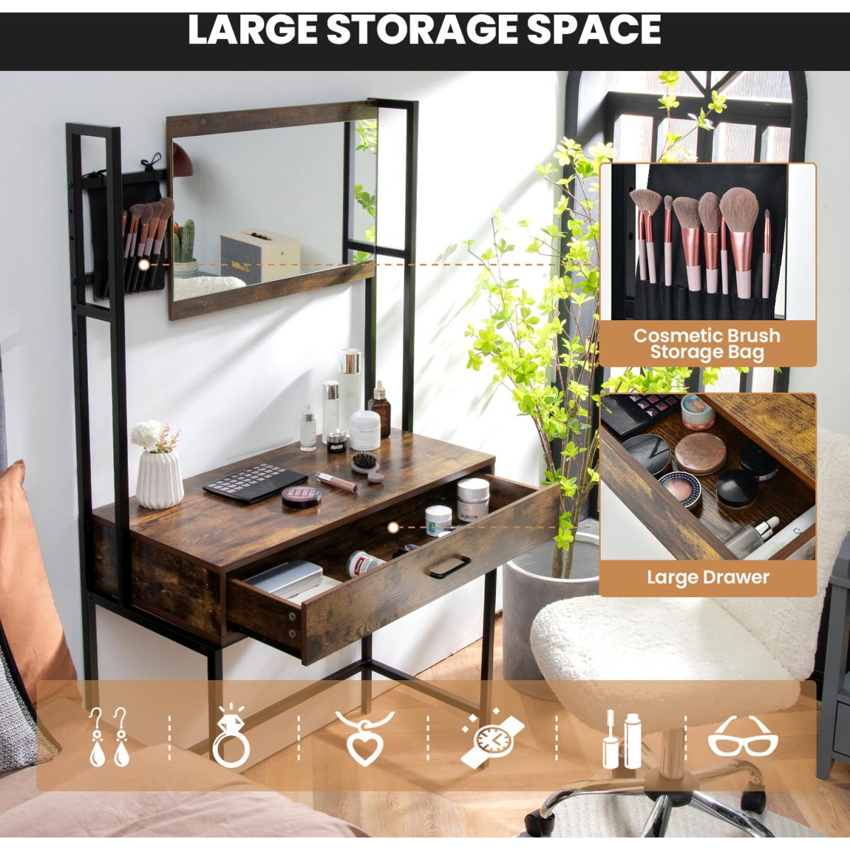 Be the most sparkling heroine in your life with our vanity table with mirror! The dressing table is equipped with a large and clear mirror, which provides a wider view to make your making-up more convenient. It adjustable design meets more vanity needs. All your make up things can be well stored in an order way with multiple storage options. Moreover, the industrial style with iron frame not only adds elegance and charm to your room, but also it ensures excellent durability and stability for long-lasting use. Don't hesitate to buy it home and see how this practical vanity table fits your home and serves as a perfect addition.