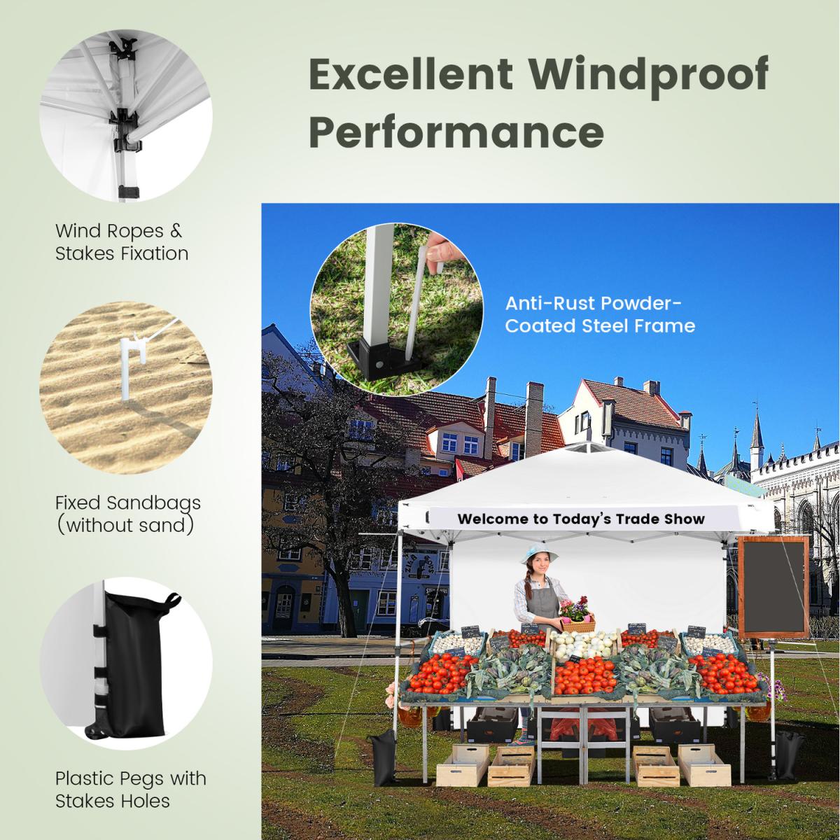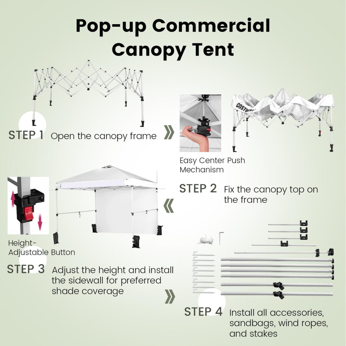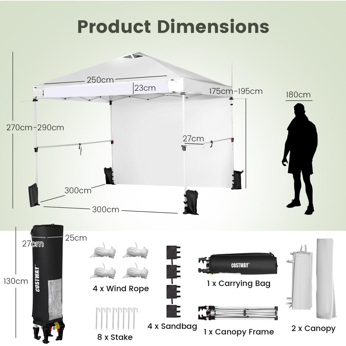 Perfect Canopy for Your Business!Our commercial instant canopy tent with a sidewall measures 300 x 300 x 270-290 cm (L x W x H) and provides 9 sq. m of shade coverage, allowing you to enjoy comfortable outdoor leisure time with your friends or family. Thanks to the central locking system, the pop-up canopy frame can be easily folded and unfolded in seconds, and it requires no tools. More than that, we also provide a carrying bag to store the folding canopy when not in use, so you can easily transport it anywhere you want. There are 2 built-in wheels on the bottom of the canopy, allowing you to move the folding canopy around easier. Most importantly, our canopy is specially designed for your business and promotion. It comes with multiple crossbars and a banner strip for hanging baskets, clothes, flags, blackboards, banners, and more, making your booth more visible and attractive in the market. The canopy is crafted with durable oxford fabric with PU coating, which features excellent UPF 50+ sun protection, and rain resistance. And the supporting frame is constructed of high-strength powder-coated metal, which is not easy to rust, peel, or chip. In addition, there are wind ropes, stakes, and sandbags for fixing the canopy tent on the ground, adding more stability.
