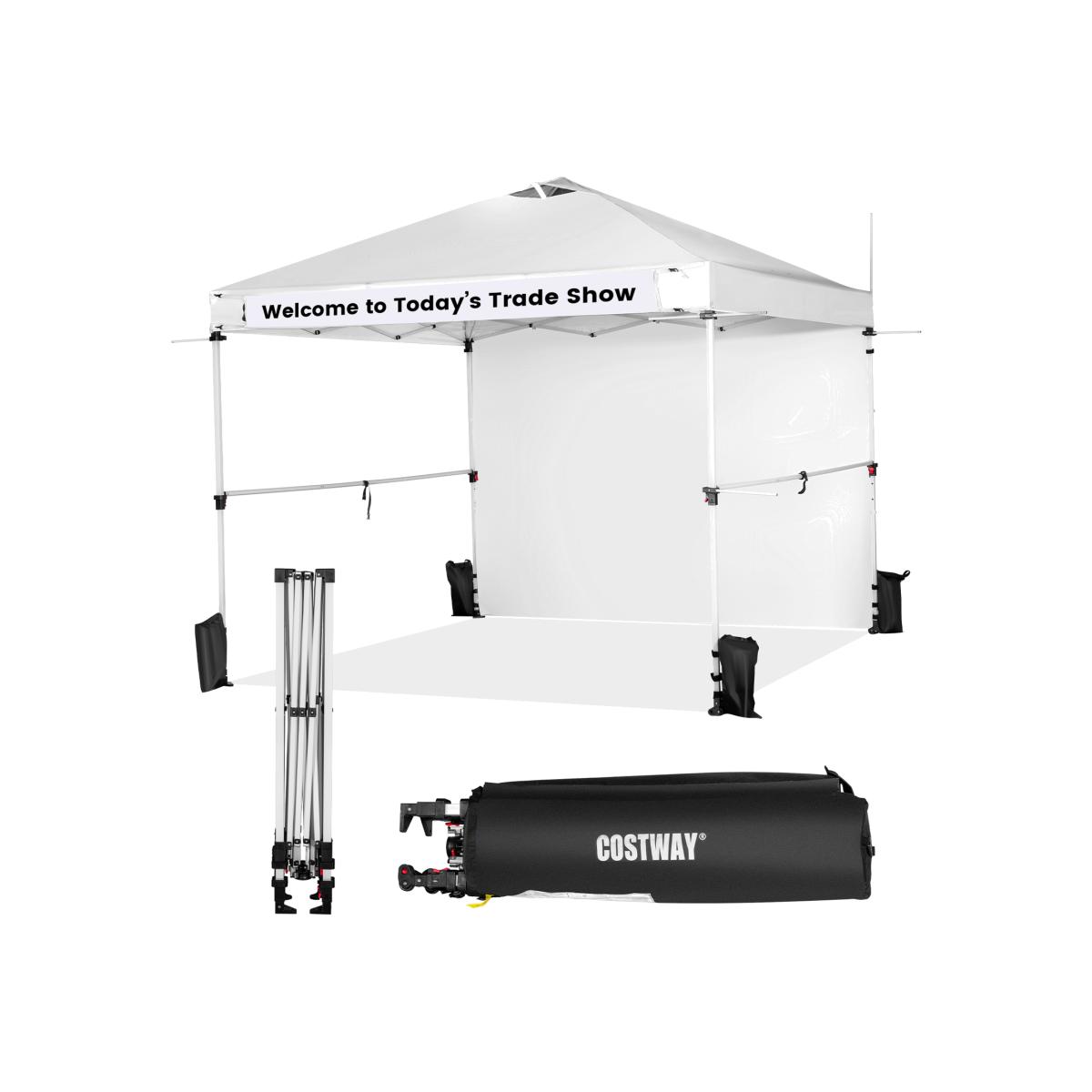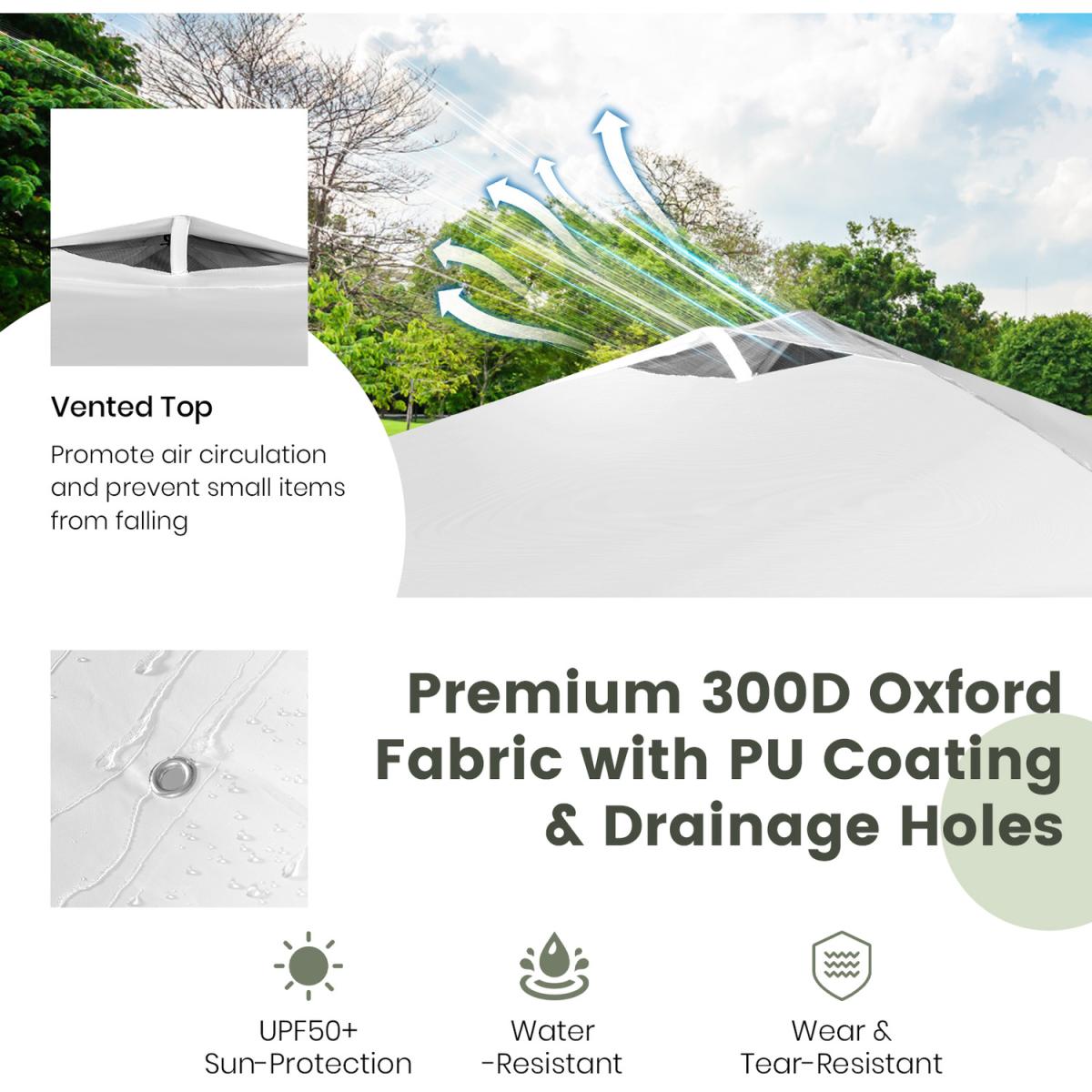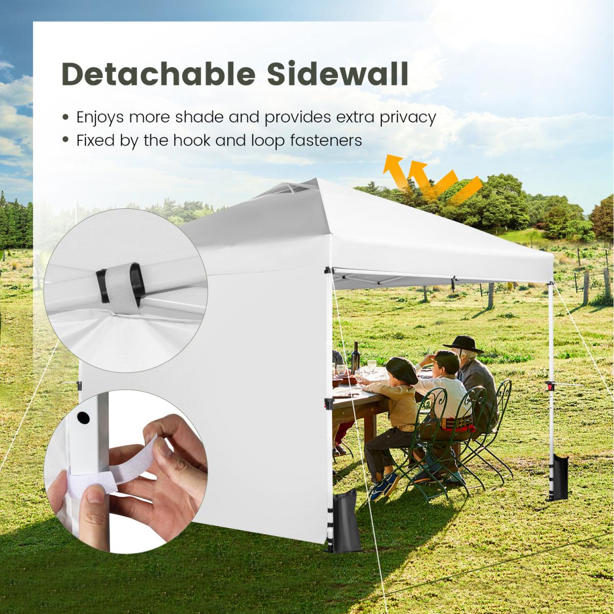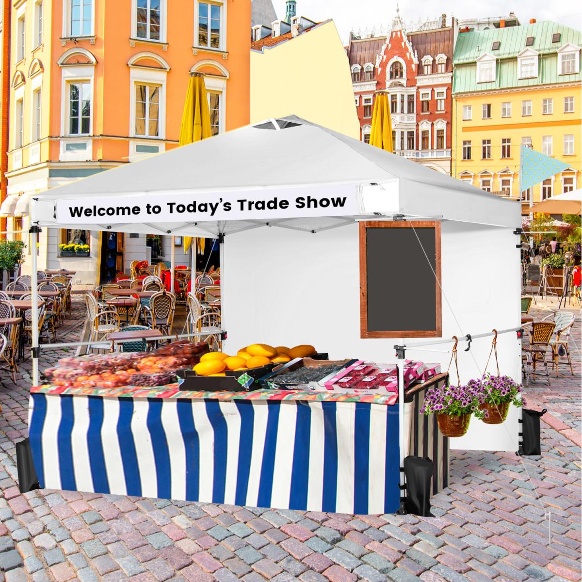 Perfect Canopy for Your Business!Our commercial instant canopy tent with a sidewall measures 300 x 300 x 270-290 cm (L x W x H) and provides 9 sq. m of shade coverage, allowing you to enjoy comfortable outdoor leisure time with your friends or family. Thanks to the central locking system, the pop-up canopy frame can be easily folded and unfolded in seconds, and it requires no tools. More than that, we also provide a carrying bag to store the folding canopy when not in use, so you can easily transport it anywhere you want. There are 2 built-in wheels on the bottom of the canopy, allowing you to move the folding canopy around easier. Most importantly, our canopy is specially designed for your business and promotion. It comes with multiple crossbars and a banner strip for hanging baskets, clothes, flags, blackboards, banners, and more, making your booth more visible and attractive in the market. The canopy is crafted with durable oxford fabric with PU coating, which features excellent UPF 50+ sun protection, and rain resistance. And the supporting frame is constructed of high-strength powder-coated metal, which is not easy to rust, peel, or chip. In addition, there are wind ropes, stakes, and sandbags for fixing the canopy tent on the ground, adding more stability.