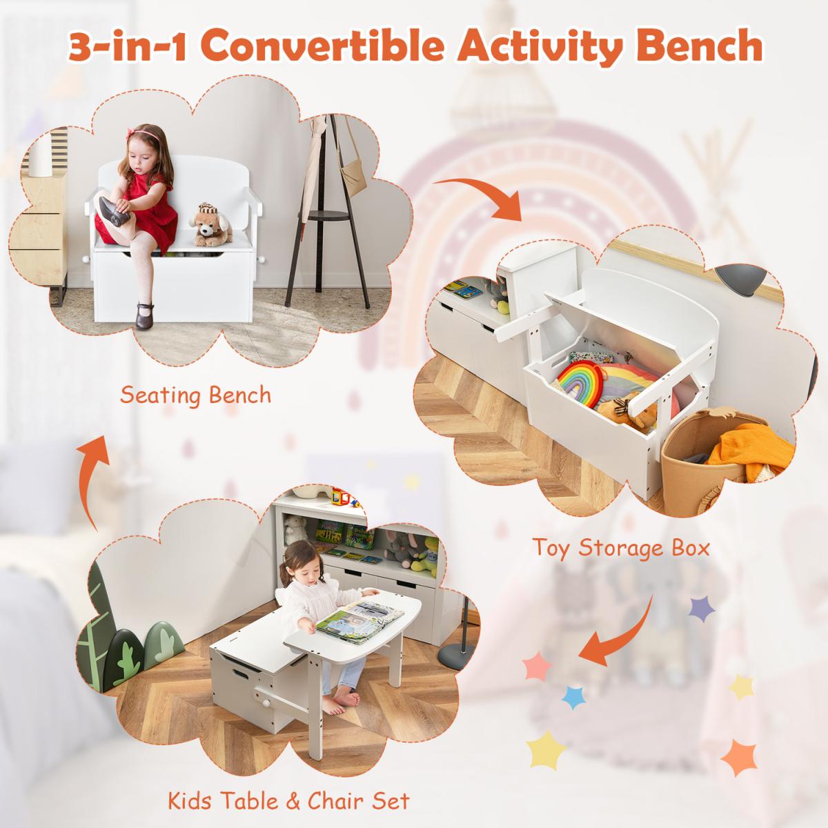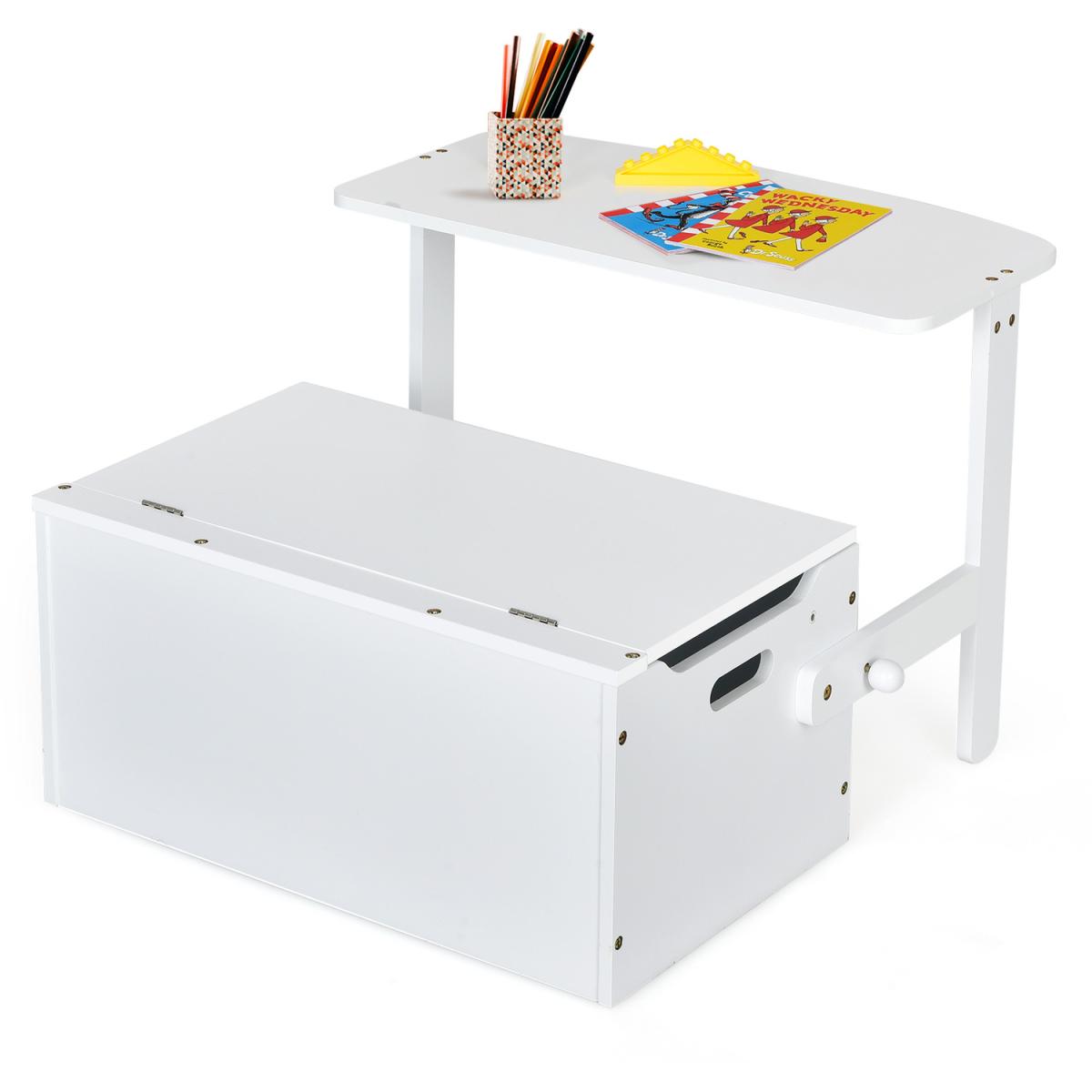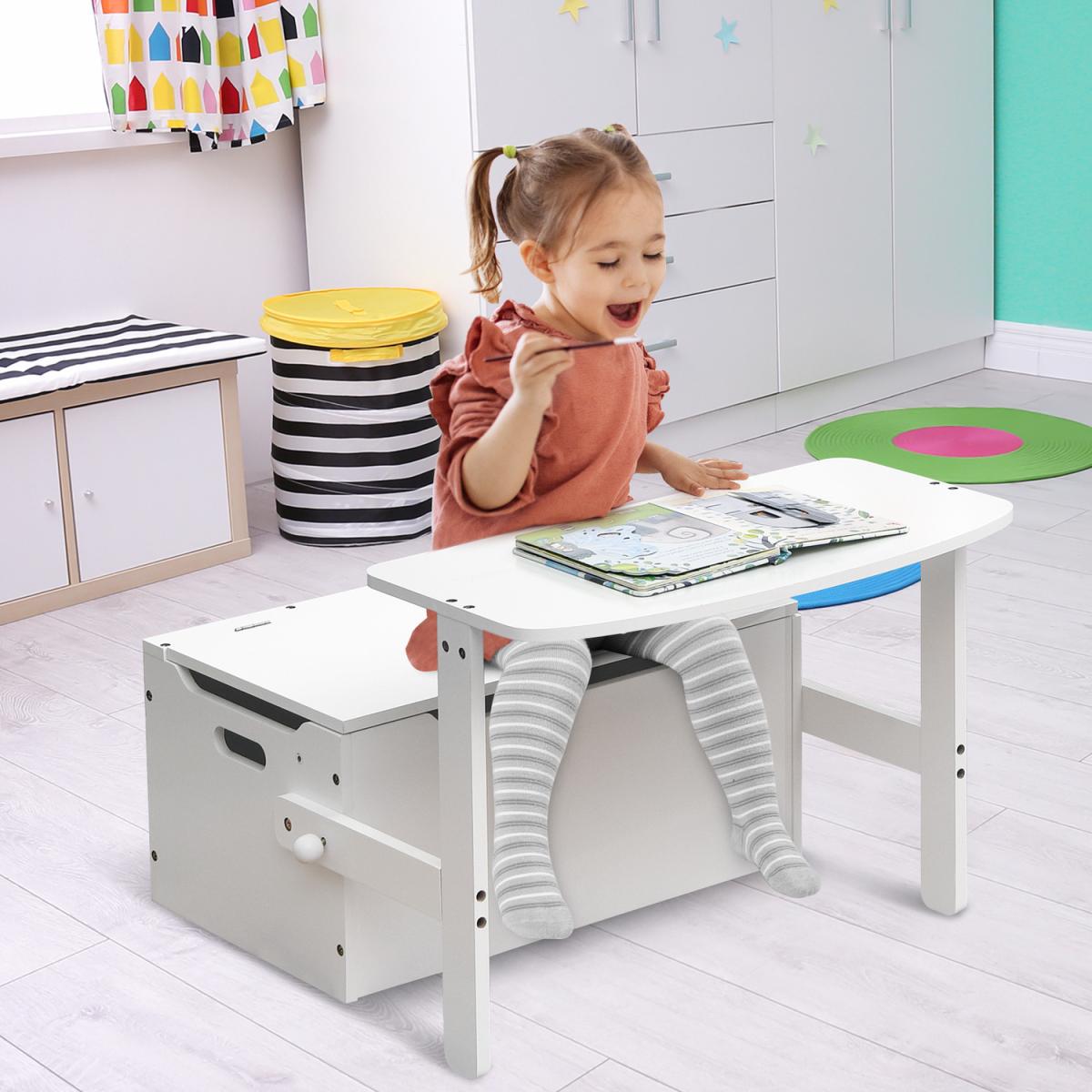 Tired of a toy covered floor? Our kids convertible storage bench is a perfect companion for your growing kids. And the large toy storage space helps to keep your home tidy and clean. This versatile bench with 3-in-1 design can be easily converted from a stool to a desk set, which is ideal for the kids room, kindergarten, art playroom and more. It can be used as a table and chair set for studying, drawing, and eating, or it can be turned into a stool for sitting and changing shoes. In addition, the safety pneumatic rod allows the storage box to open slowly and prevents the lid from shutting suddenly to avoid injury. Besides, the high quality material is stable and can be used for a long time.
