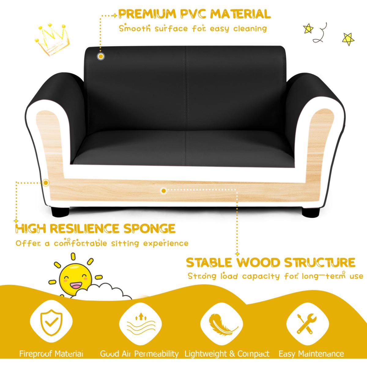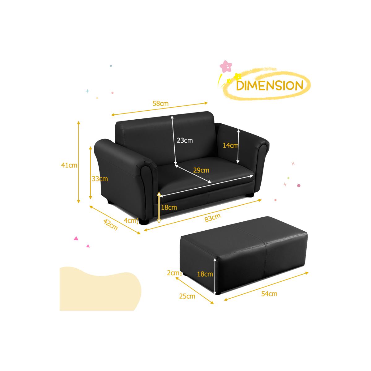 Our elegant 2 seat children sofa with ottoman is a perfect gift for your kids!Made of a solid wooden frame, this armchair is sturdy enough to support up to 60 kg. Both sponge and PVC are fireproof, which can reduce potential safety hazards. The comfortable matching footstool helps to relax your kid's feet after a long day of play. Filled with high-resilience sponge, our sofa provides a cozy place for your children. Kids can sit on to watch TV or read books in complete comfort. 4 high plastic feet provide strong support and protect the sofa from dust and moisture. The lightweight design makes this sofa a perfect decoration for any place and allows your kids to move the sofa with ease. In addition, covered with waterproof PVC, the surface of this sofa is easy to clean.