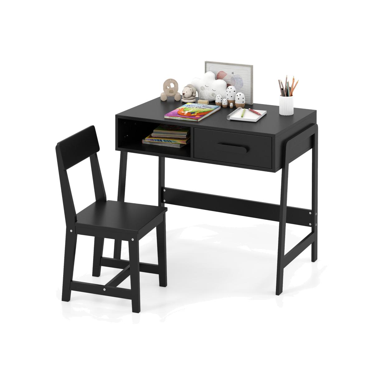 Enhance your child's learning environment with our kid's desk and chair set! This wooden study table set boasts ample storage space with a large tabletop, open compartment, and pull-out drawer, keeping study essentials like books and stationery organized. The ergonomic chair with a high backrest promotes healthy sitting habits. Crafted from solid pine wood, the table and chair legs offer high sturdiness and stability. Whether for writing, reading, drawing, or playing this versatile table and chair set serves great.