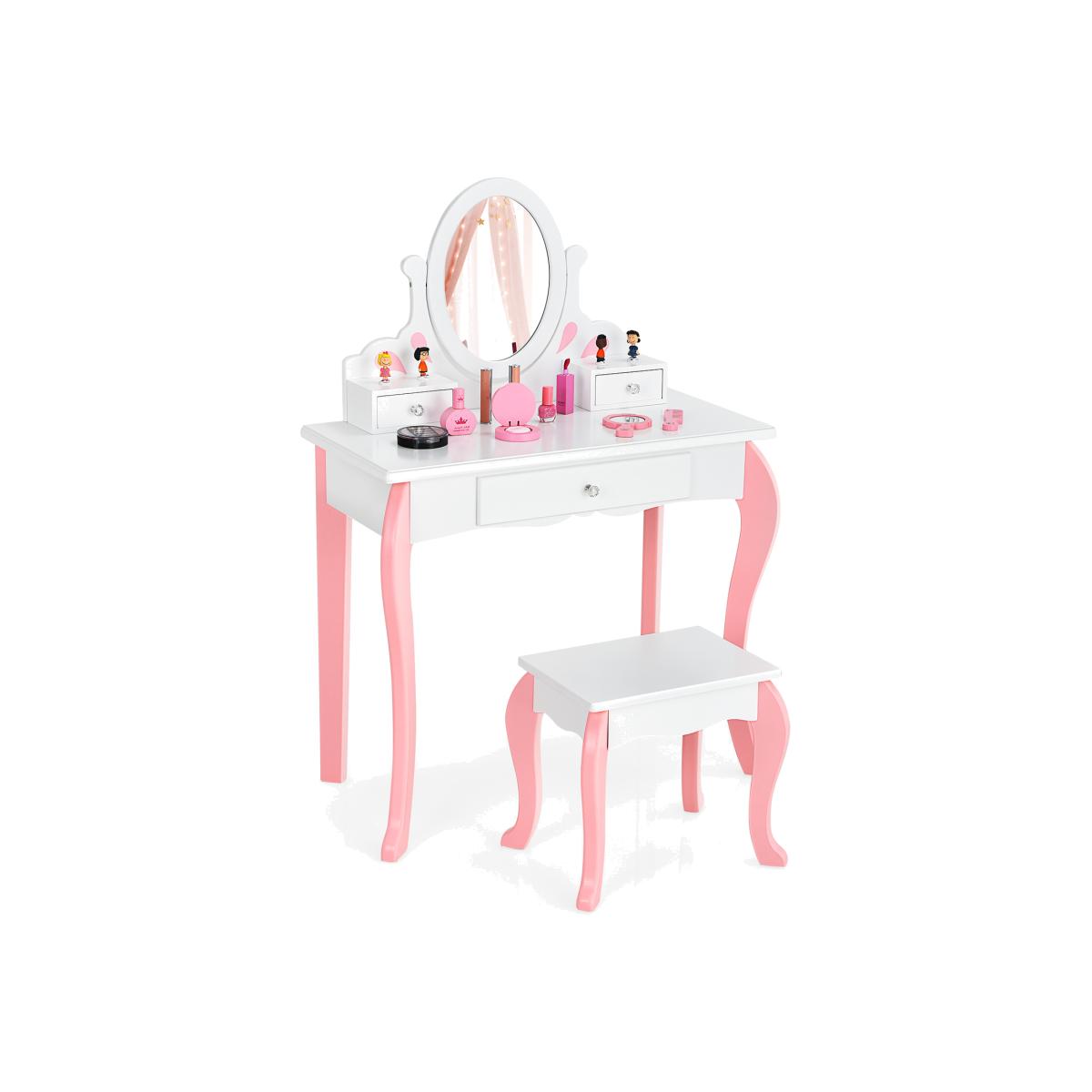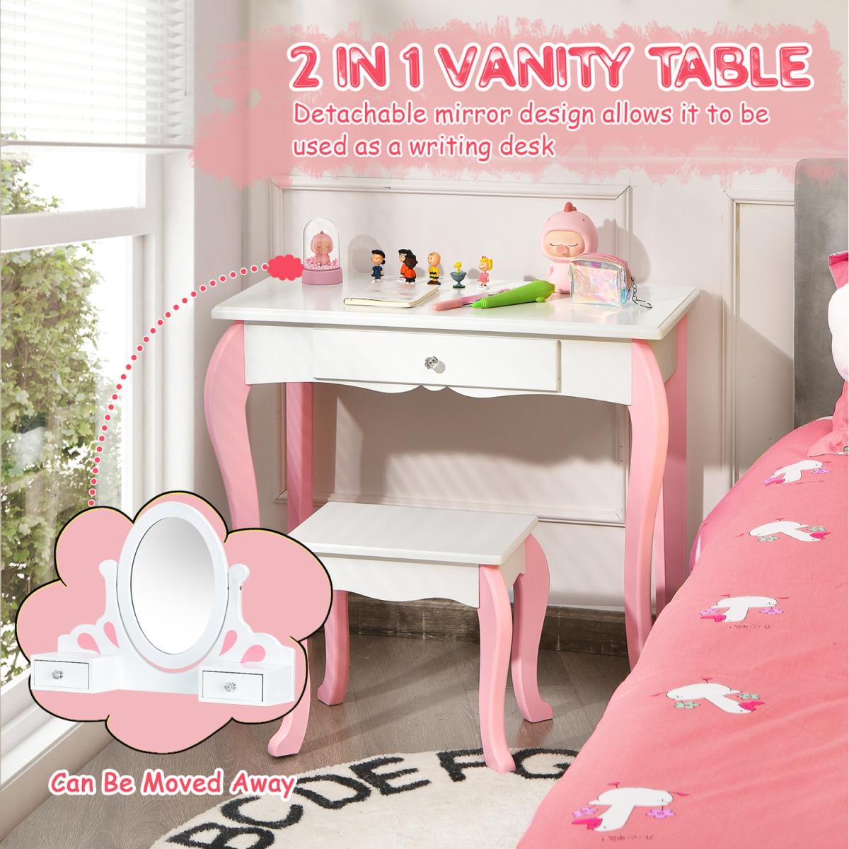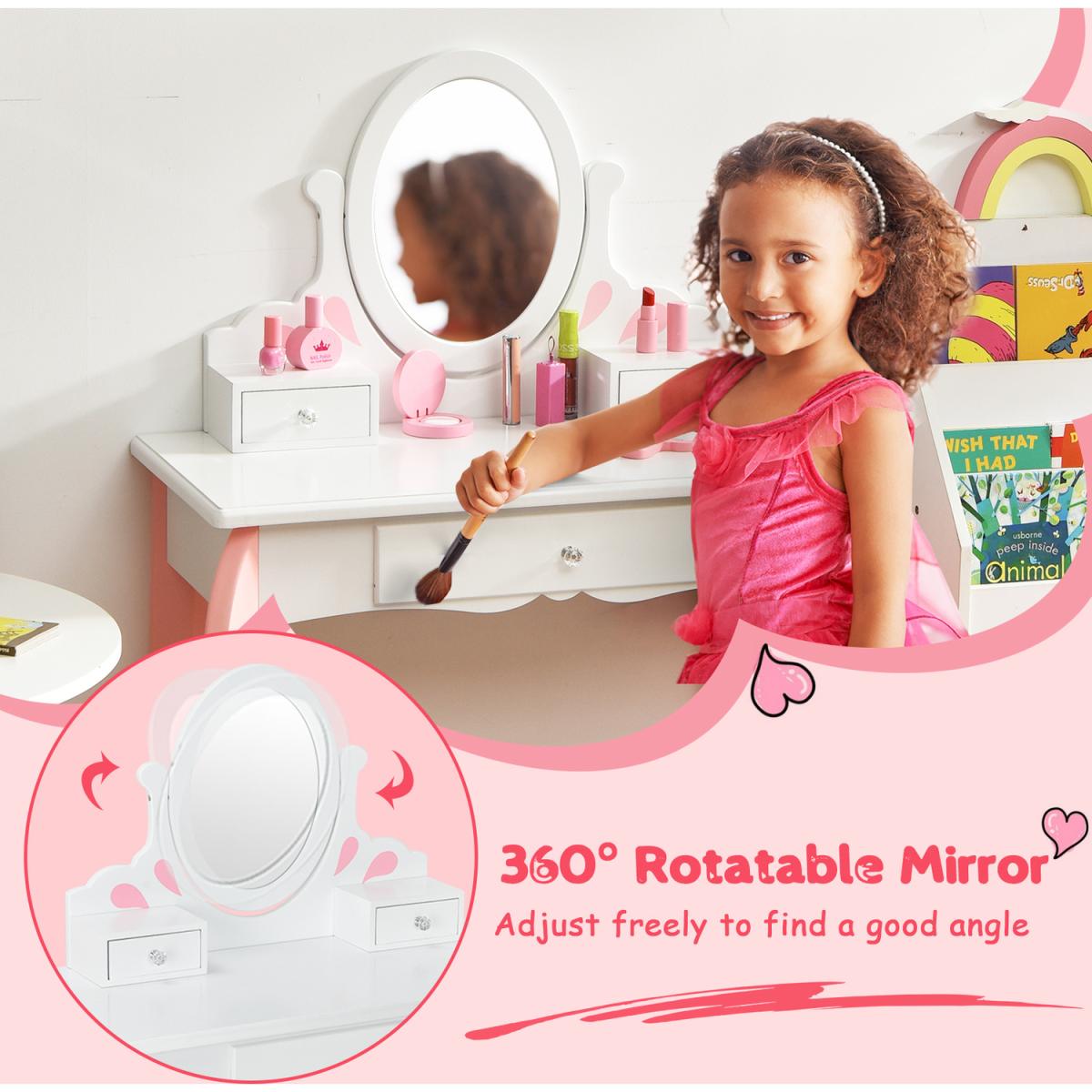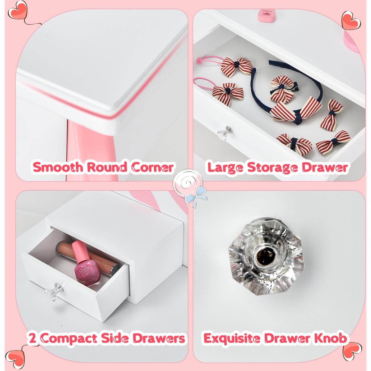 Are you looking for a cute and sturdy vanity set for your little one? Our adorable vanity table and stool set is a perfect choice! Equipped with a large mirror which can rotate 360 degrees, this dressing table enables your child to adjust the angle to achieve a perfect reflection for makeup. And the mirror can be removed to achieve multiple uses. The matching stool provides your child with a stable and comfy place to sit when doing hair or dressing up. Besides, the dressing table comes with 3 sliding drawers, providing ample space to store your kids' makeup, jewellery or other supplies. Made of high-quality MDF, this vanity set ensures a long service life. Both the table and stool are designed with rounded corners and curved legs for safety and stability. Meanwhile, the non-slip foot pads can protect your floor from scratches and the anti-toppling device is designed for added safety. This cute child-sized vanity set will be an appealing decor in your home.