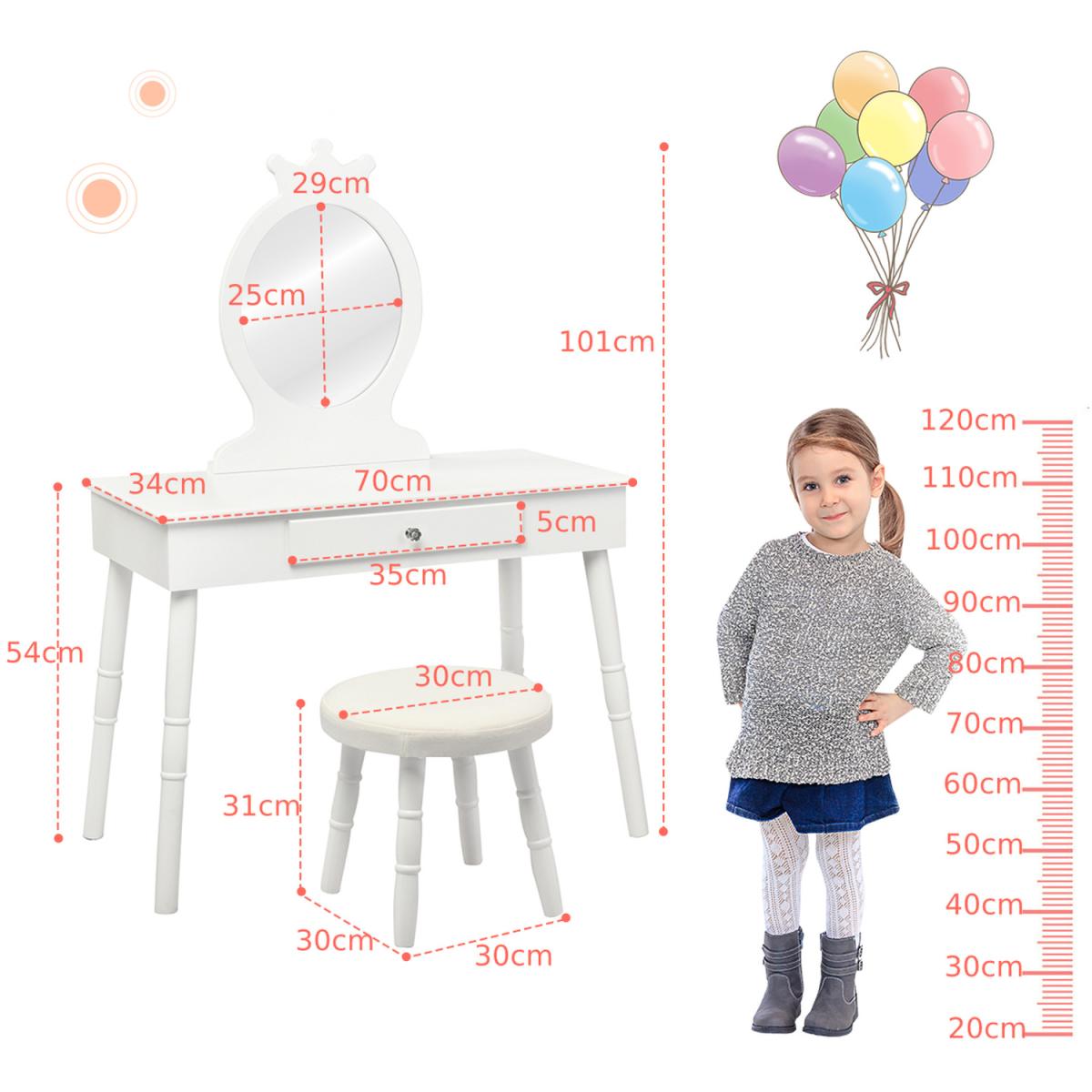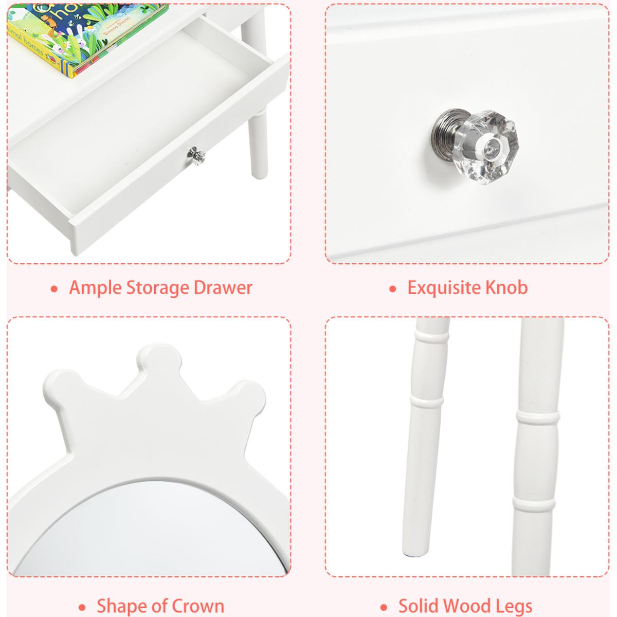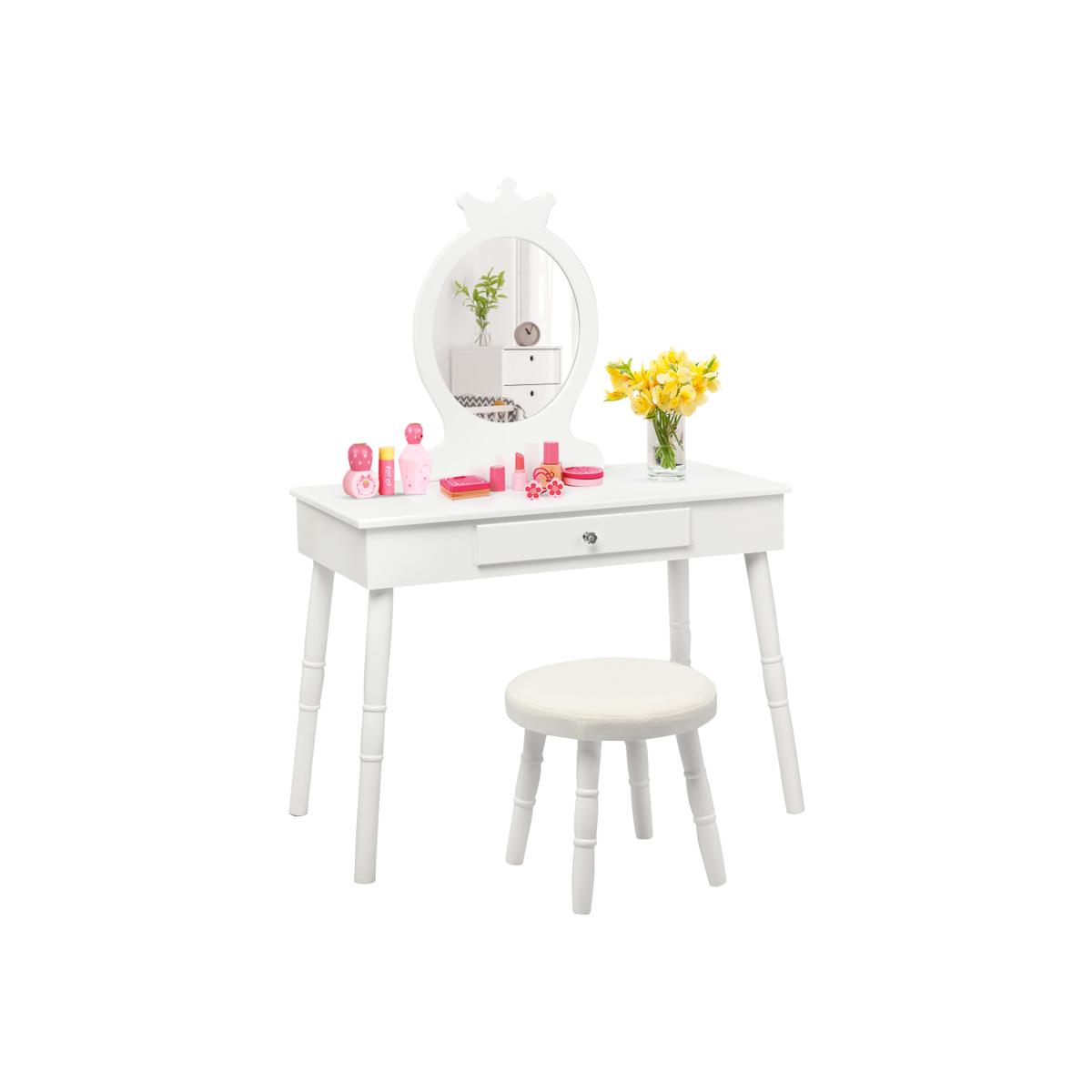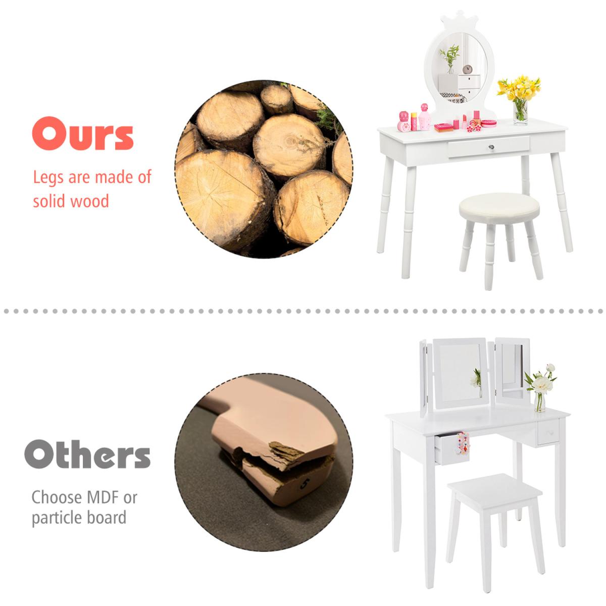Are you wondering what to give your kids as a birthday or Christmas gifts? Our pink vanity set is a perfect present for a little girl. Made of density board and pinewood, the whole set is very stable and can be used for a long time. Also, round corners and anti-slip pads are just some of the ways that we made our vanity set safe for your kids. Painted with lead-free coating, the set has no peculiar smell, and it will not affect the child's health. The dresser also has a drawer to help store small items such as hair ties, brushes, makeup, nail polish, and other fun trinkets. What is more, the stool of the set with a soft and thick cushion can provide a comfortable sitting experience for your little one. Bring our set today and give your little one a big surprise!