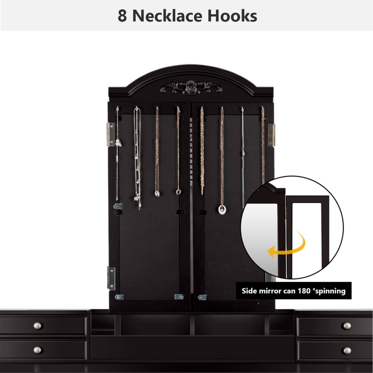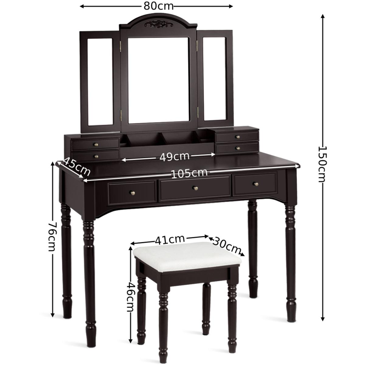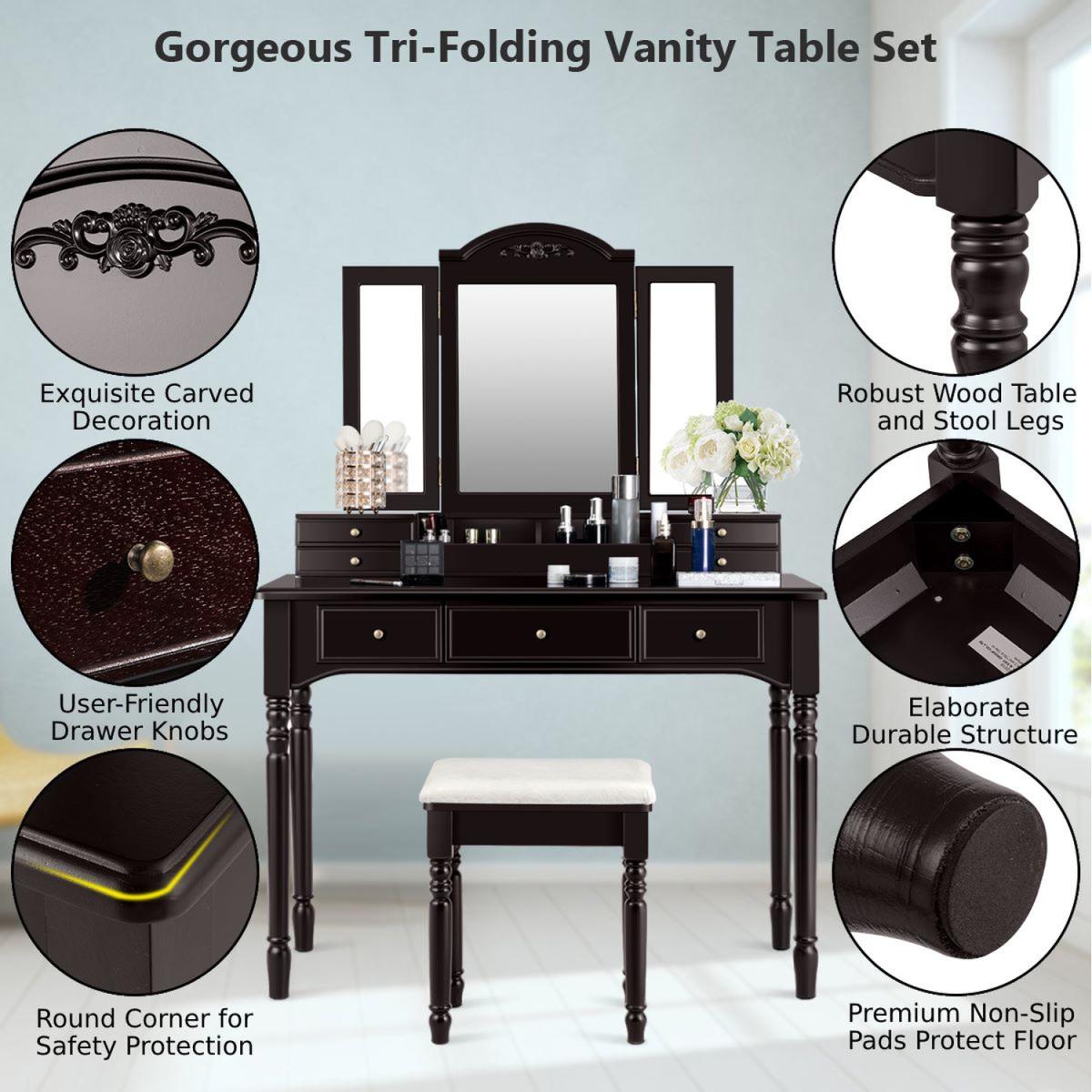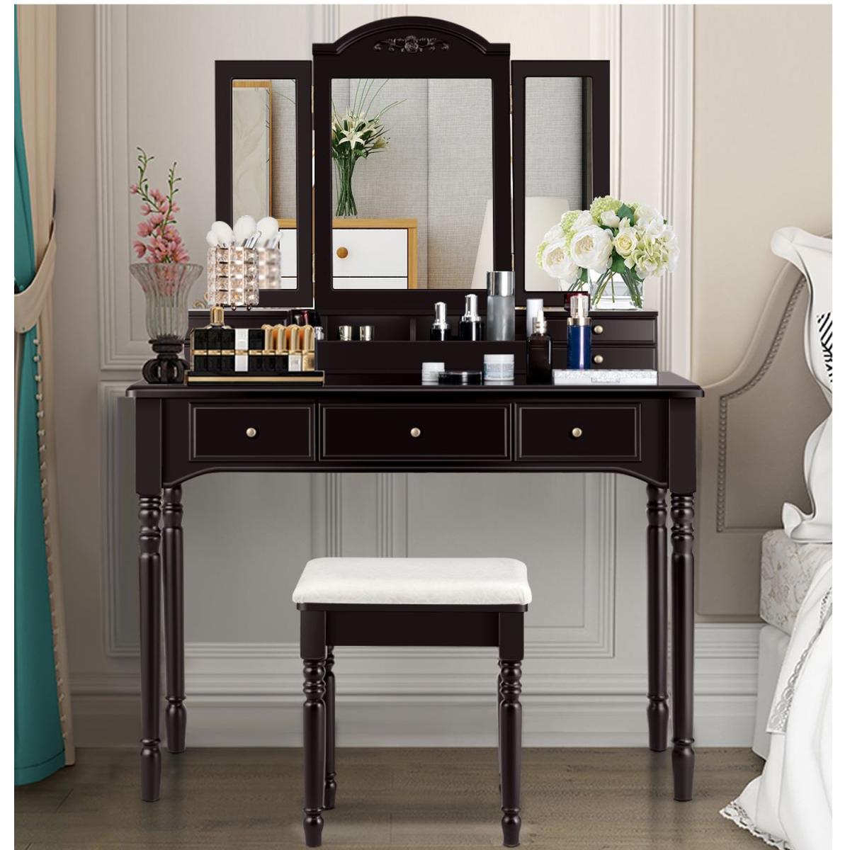 Are you finding a unique and elegant dressing table set? This vanity table set with a tri-folding mirror is definitely an ideal option for you. It will never let you down with practical functions as well as charming appearance. On the back of the mirror, there are 8 hooks to store different necklaces. Featuring 7 drawers and an open storage box, most of your cosmetics and brushes for make-up can be kept in order. Additionally, detachable top mirror stand making it easy to move for the dual usage as a spacious writing or studying desk. The table top is made of thick board and legs of table and stool are made of solid wood to ensure stability and can be used for many years. With modern and concise style, this desk will go really well with any style of decoration. Give yourself or loved one a perfect gift.