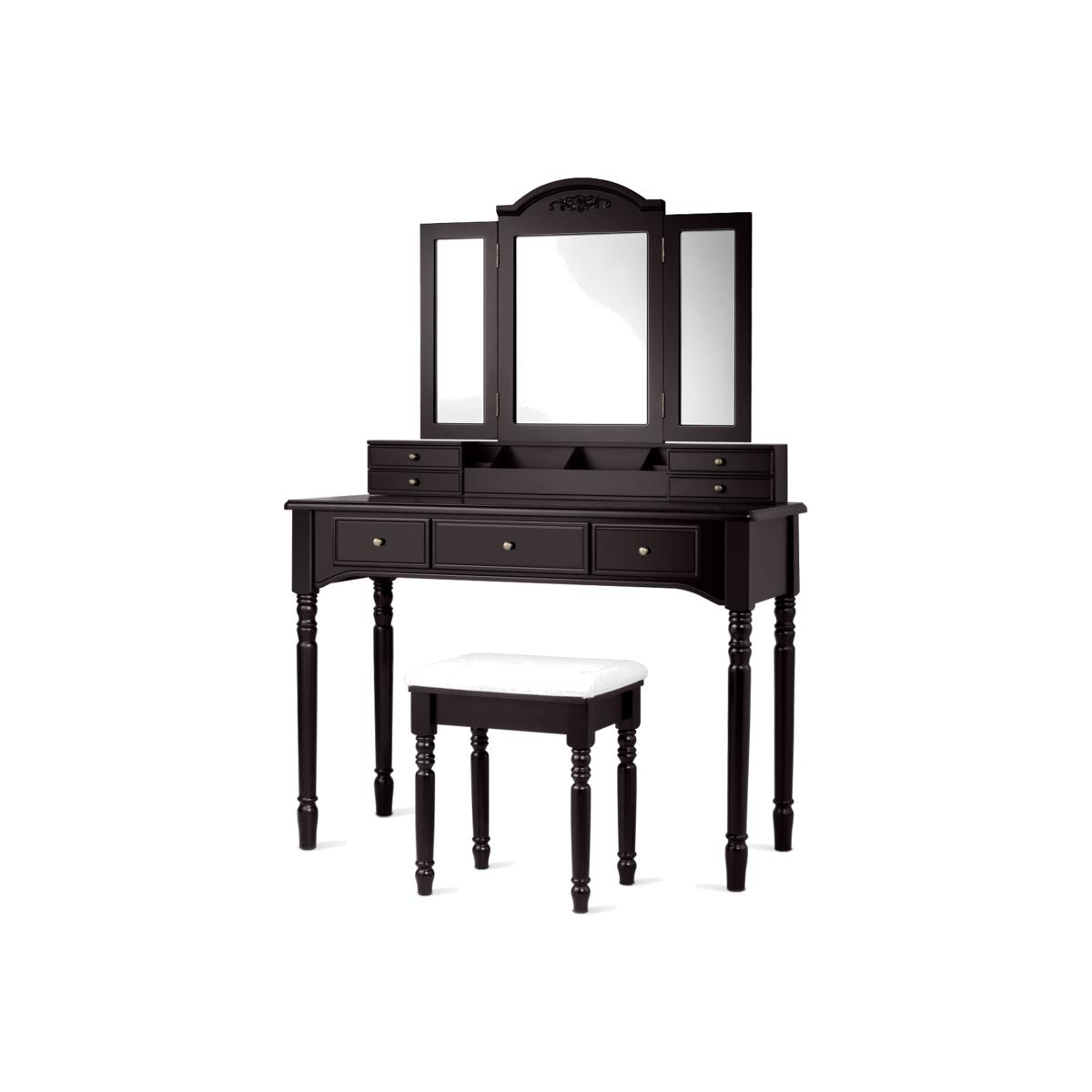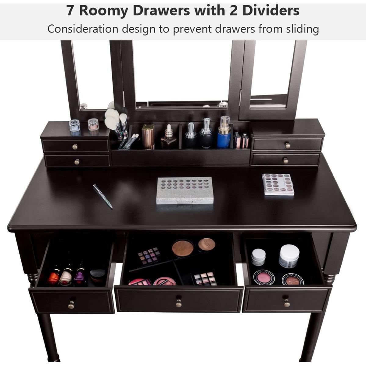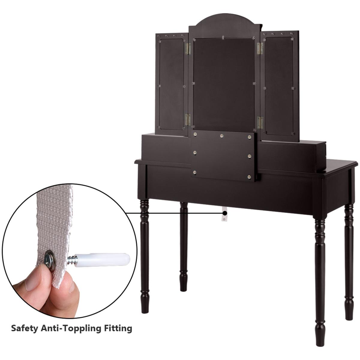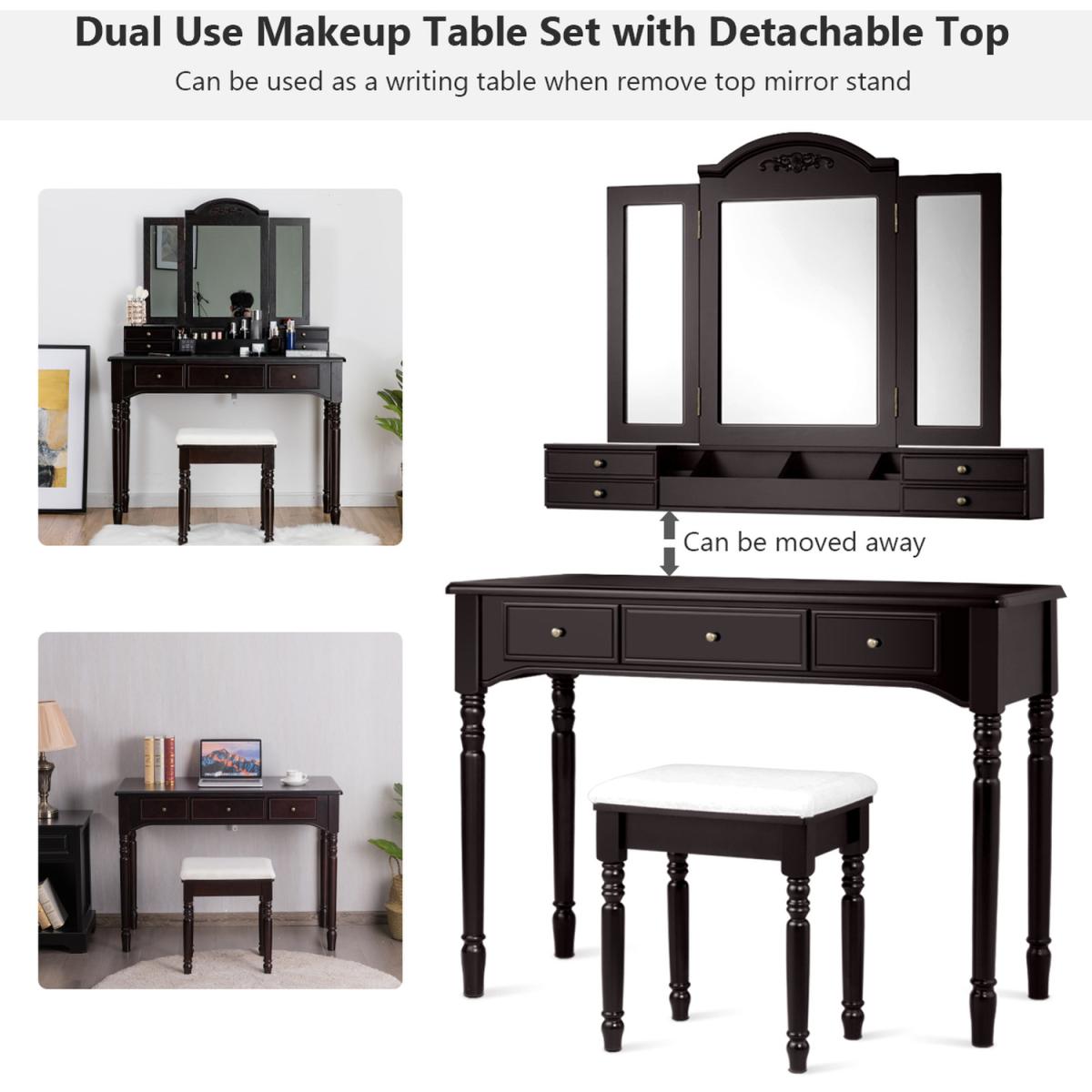 Are you finding a unique and elegant dressing table set? This vanity table set with a tri-folding mirror is definitely an ideal option for you. It will never let you down with practical functions as well as charming appearance. On the back of the mirror, there are 8 hooks to store different necklaces. Featuring 7 drawers and an open storage box, most of your cosmetics and brushes for make-up can be kept in order. Additionally, detachable top mirror stand making it easy to move for the dual usage as a spacious writing or studying desk. The table top is made of thick board and legs of table and stool are made of solid wood to ensure stability and can be used for many years. With modern and concise style, this desk will go really well with any style of decoration. Give yourself or loved one a perfect gift.