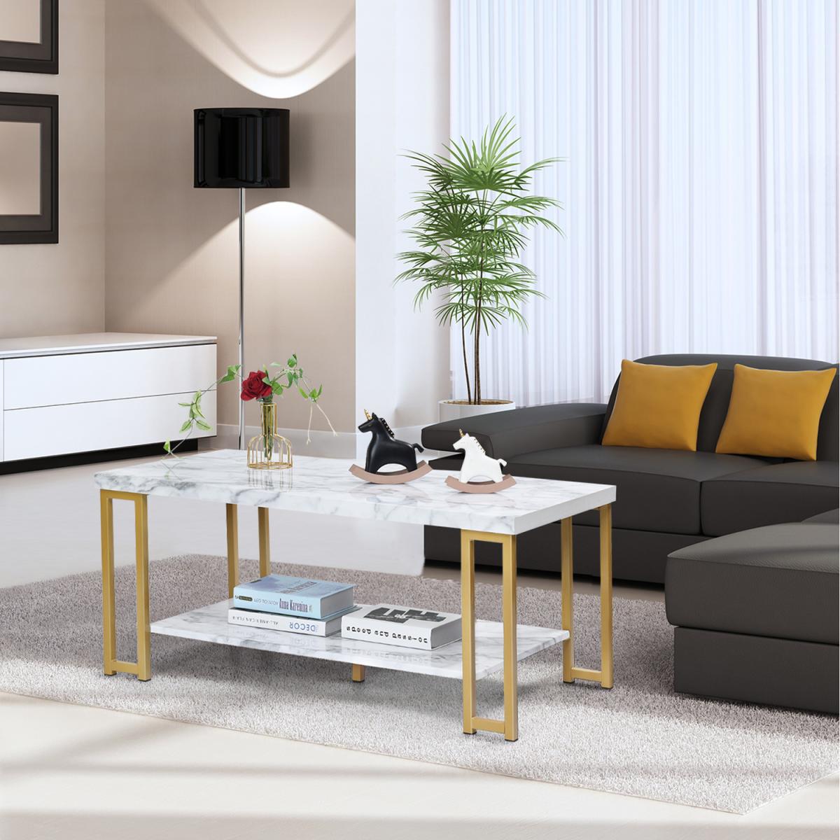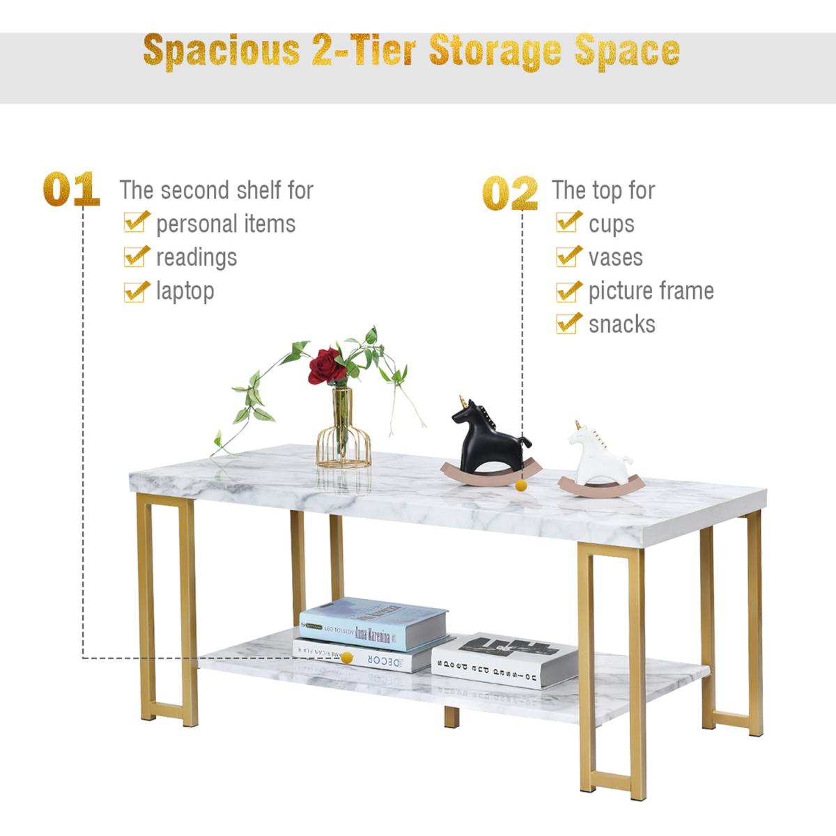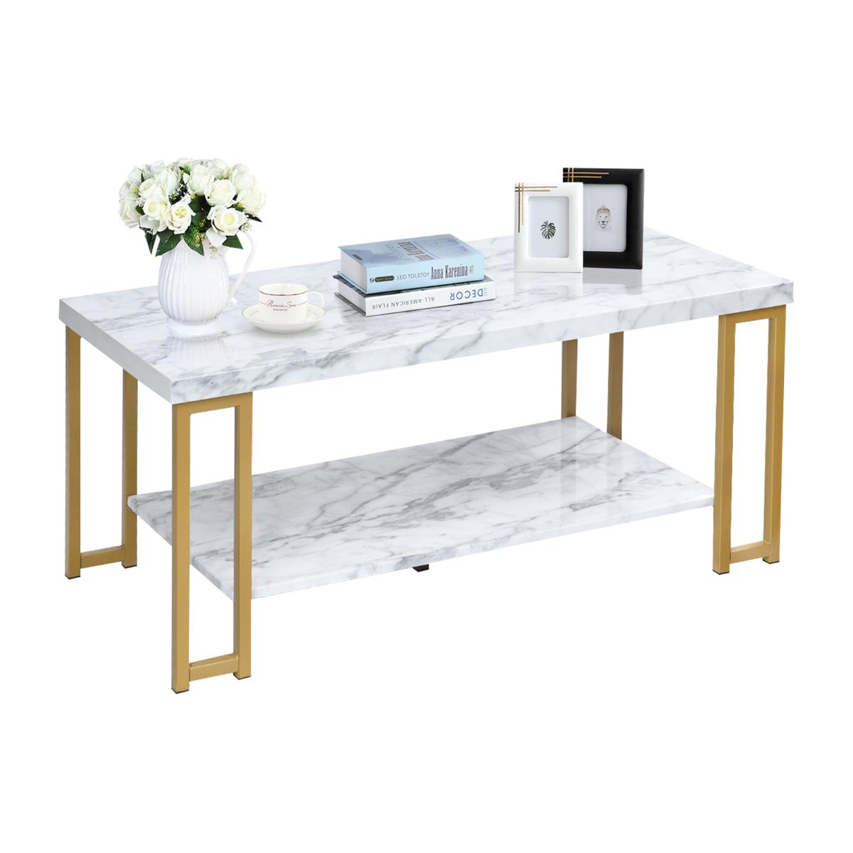 This is our new coffee table, which is a perfect complement to be placed in your home, especially for the small space. Made of high quality MDF, the top is so smooth and anti-scratch that it is easy to clean. The unique hollow legs make this table unique and attractive. Four metal feet are completely coated to keep anti-rust and stable. Besides, the pads at the bottom of feet protect your floor from being scratching. With our detailed instruction and pre-punched holes on this table, you have no trouble assembling it. Two-tier design with a strong bearing capacity of 60kg allows you to put the laptop, books, magazines, coffee, snacks, or other items on it.