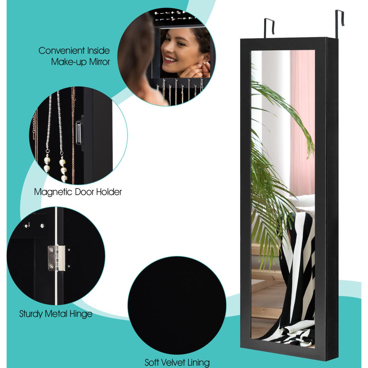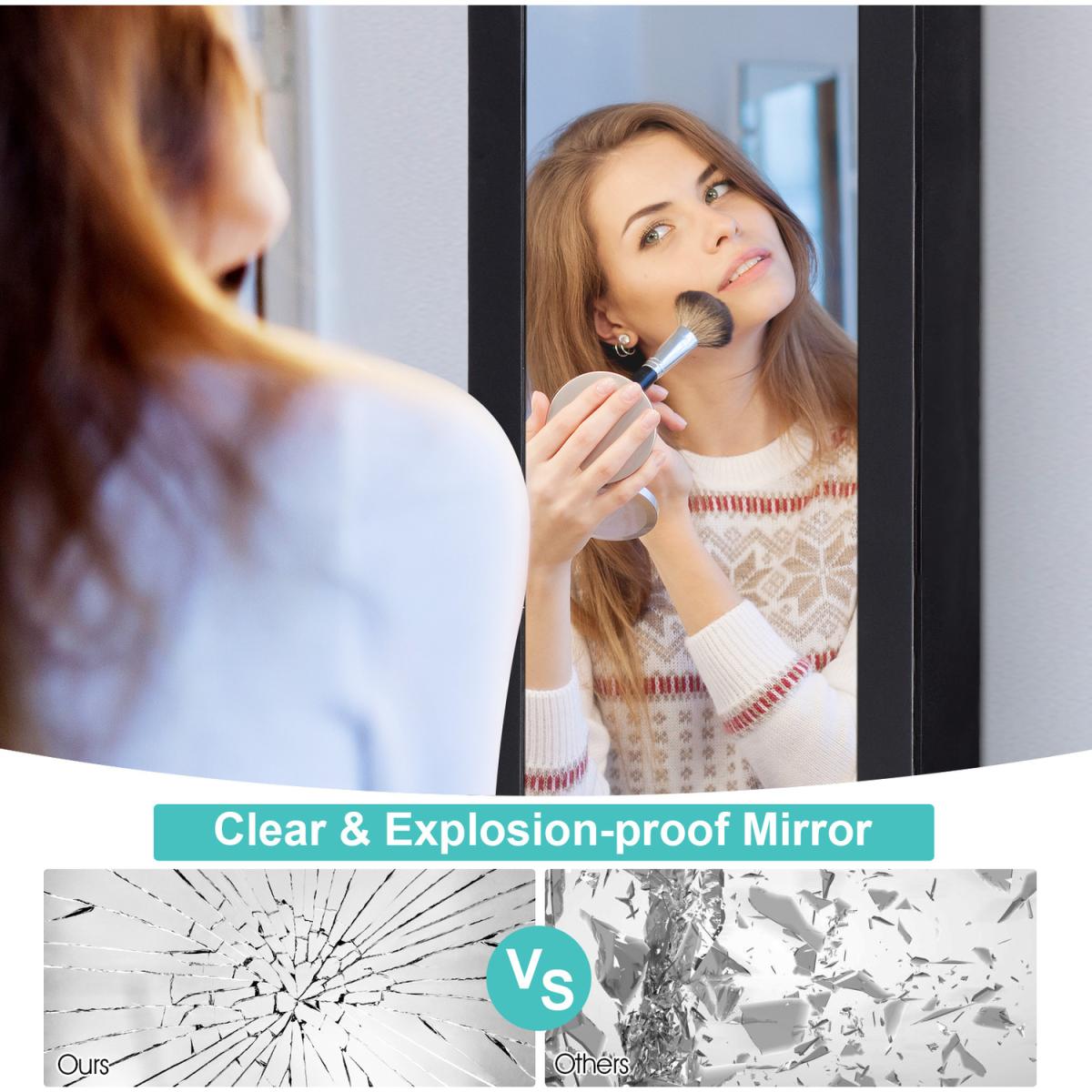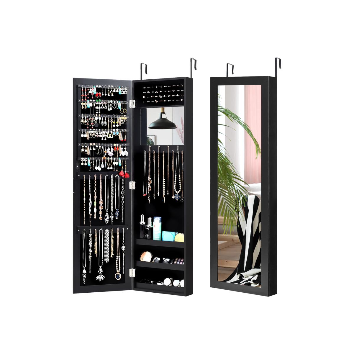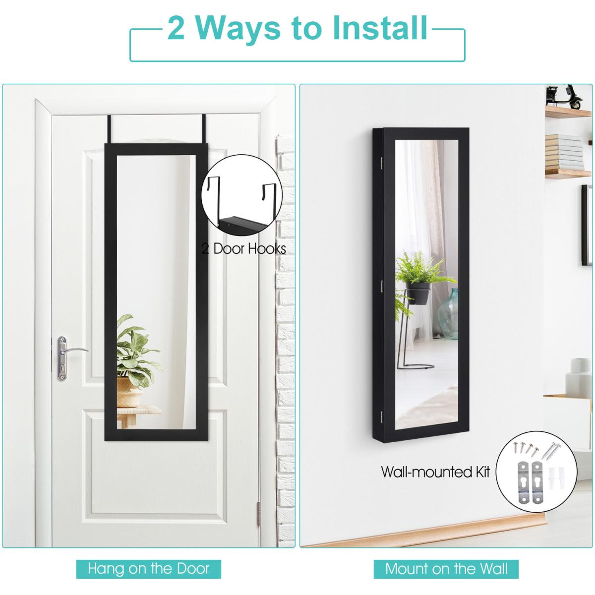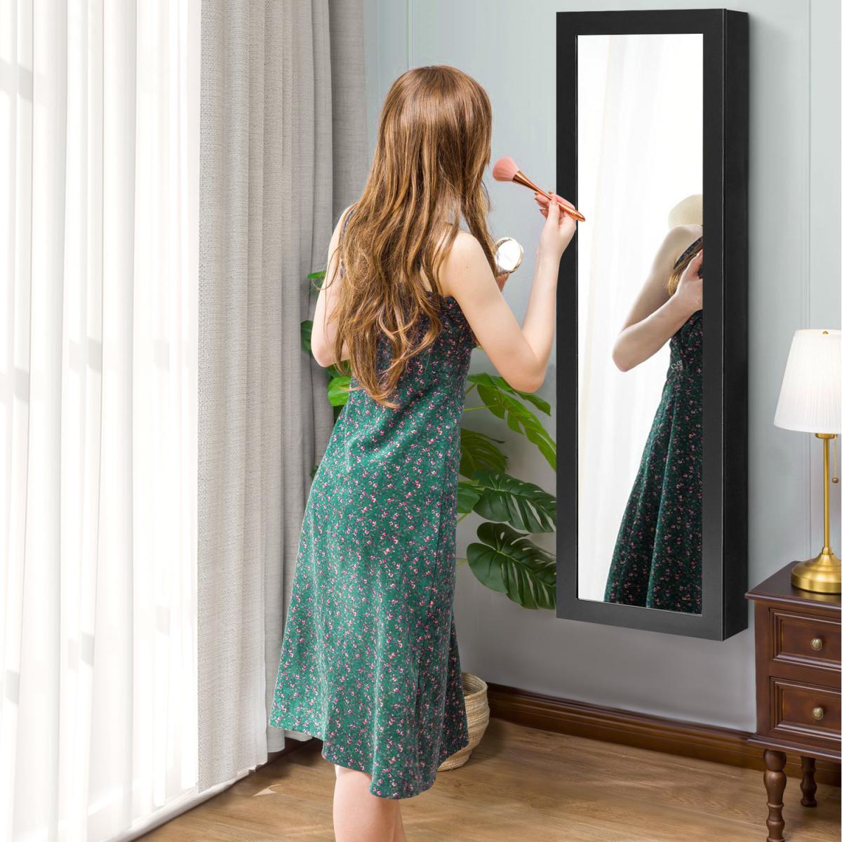 This 2-in-1 luxurious and functional mirror jewelry armoire will be a perfect addition to your home! Equipped with multiple compartments, this jewelry cabinet can organize all your jewelry and cosmetics in one place, including necklaces, rings, earrings, bracelets, sunglasses, watches, lipsticks, etc. The full-length mirror offers you a head-to-toe view of your outfit, while the built-in small mirror is convenient for you to make up and select jewelry. Moreover, made of real glass, the mirrors both have high definition imaging without distortion. The thick and durable MDF frame ensures stability and long-lasting use. What's more, this mirror jewelry cabinet can be easily hung on the door with 2 hooks or fixed on the wall with screws based on your preference.