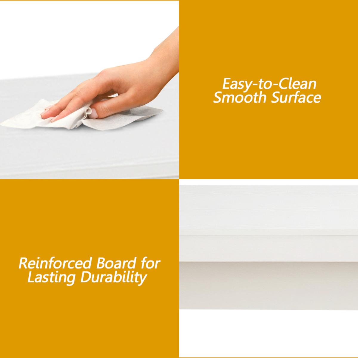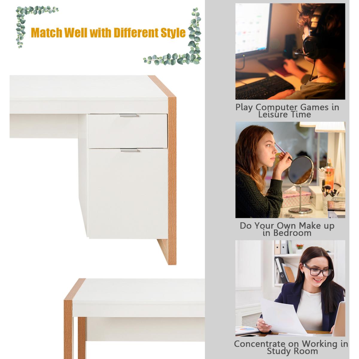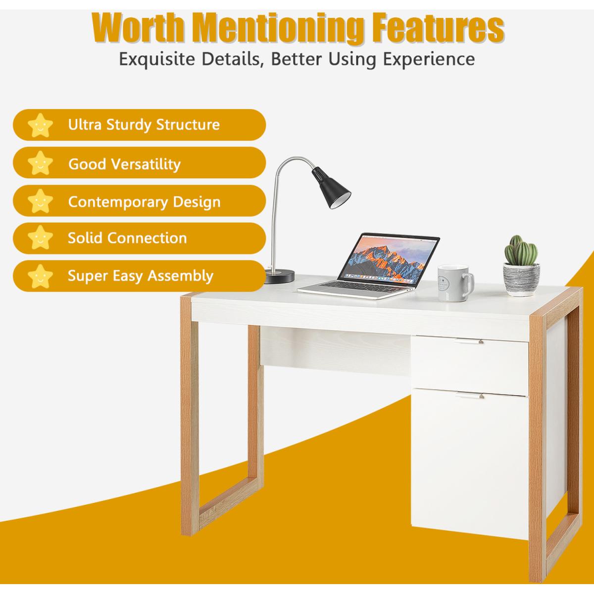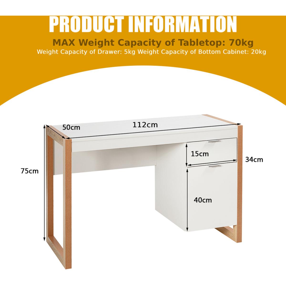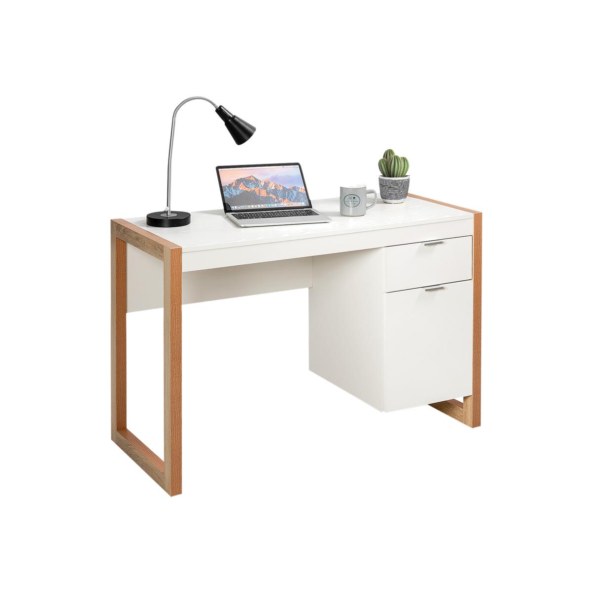 Get all your work done in home and enhance the aesthetics of your home with this modern writing desk. Whether you need a spot to study, make up or just finish important work, anyway you wish to use it, it will fulfill your requirement. Featuring a large drawer and cabinet on the right side, it provides ample storage spaced for your files and other office supplies, so as to free up more tabletop space. Still be easy to get what you want within arm's reach. Plus, it takes up less floor area while ensuring maximum working area. As you can see, wide table top can perfectly accommodate your office essentials, such as laptop, keyboard and lamp. It sturdy enough structure leaves you no worry about load bearing capacity and using reliability. Bring this work table home which strikes perfect balance between functionality and stylish design.