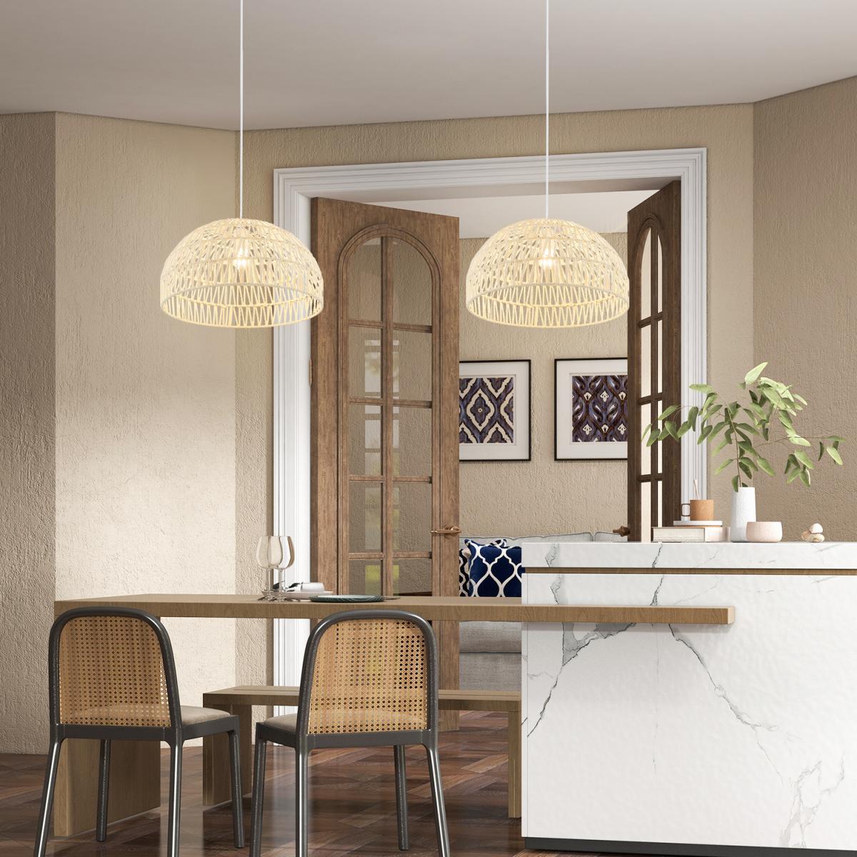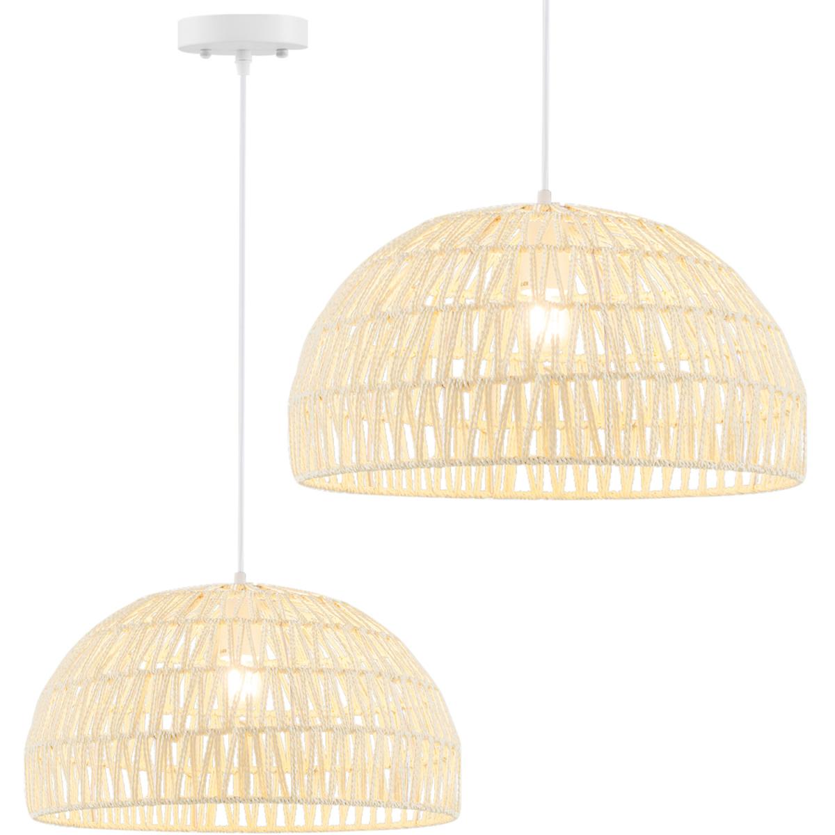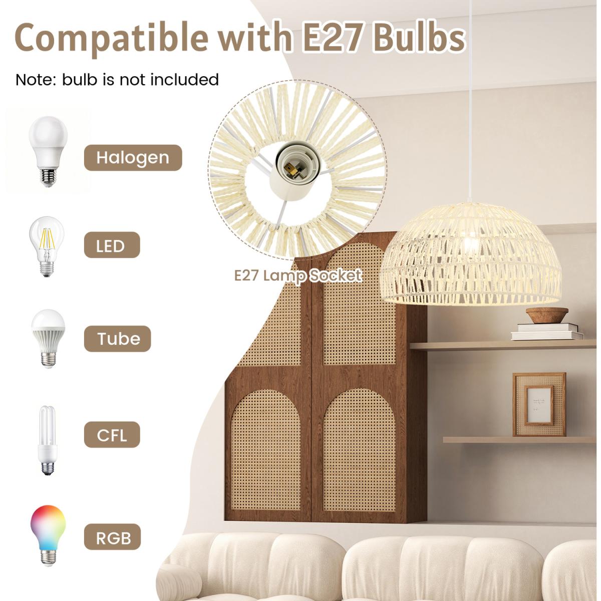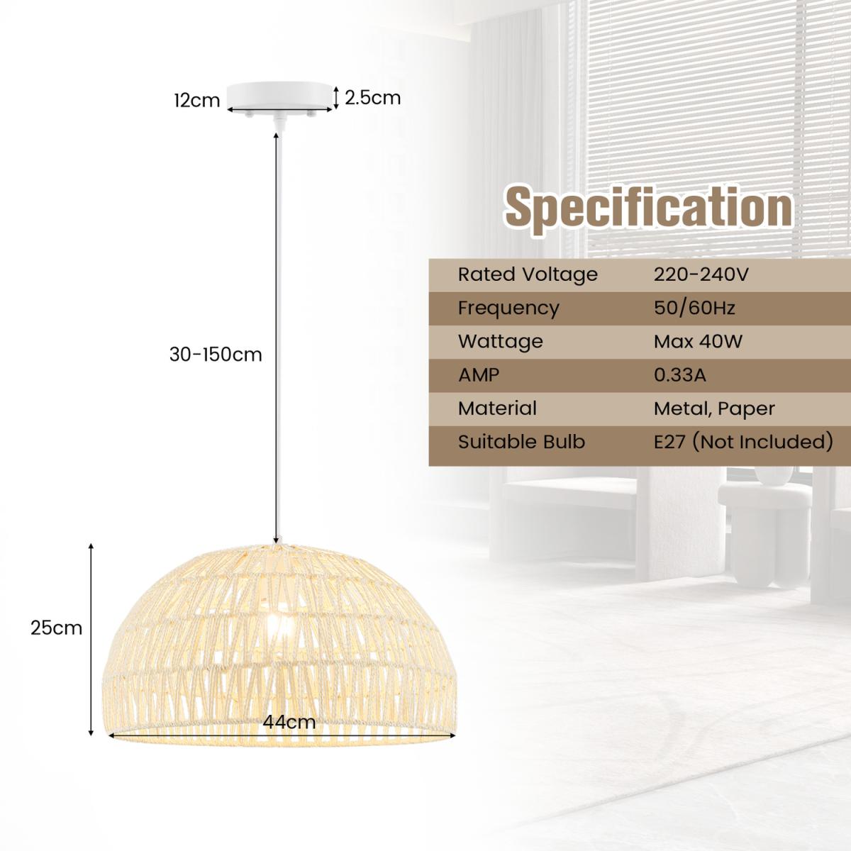 This pendant light fixture not only emits enough brightness for you, but also decorates your living space. The lampshade wrapped with well-woven paper ropes makes the whole hanging lamp elegant and appealing. And the hanging rope can be adjusted from 30cm to 150cm as you want. The bulb base fits most E27 bulbs (not included) with maximum 40. W. It will be a perfect addition to your kitchen, living room, bedroom and so on. This chic hanging light will make your daily life better.