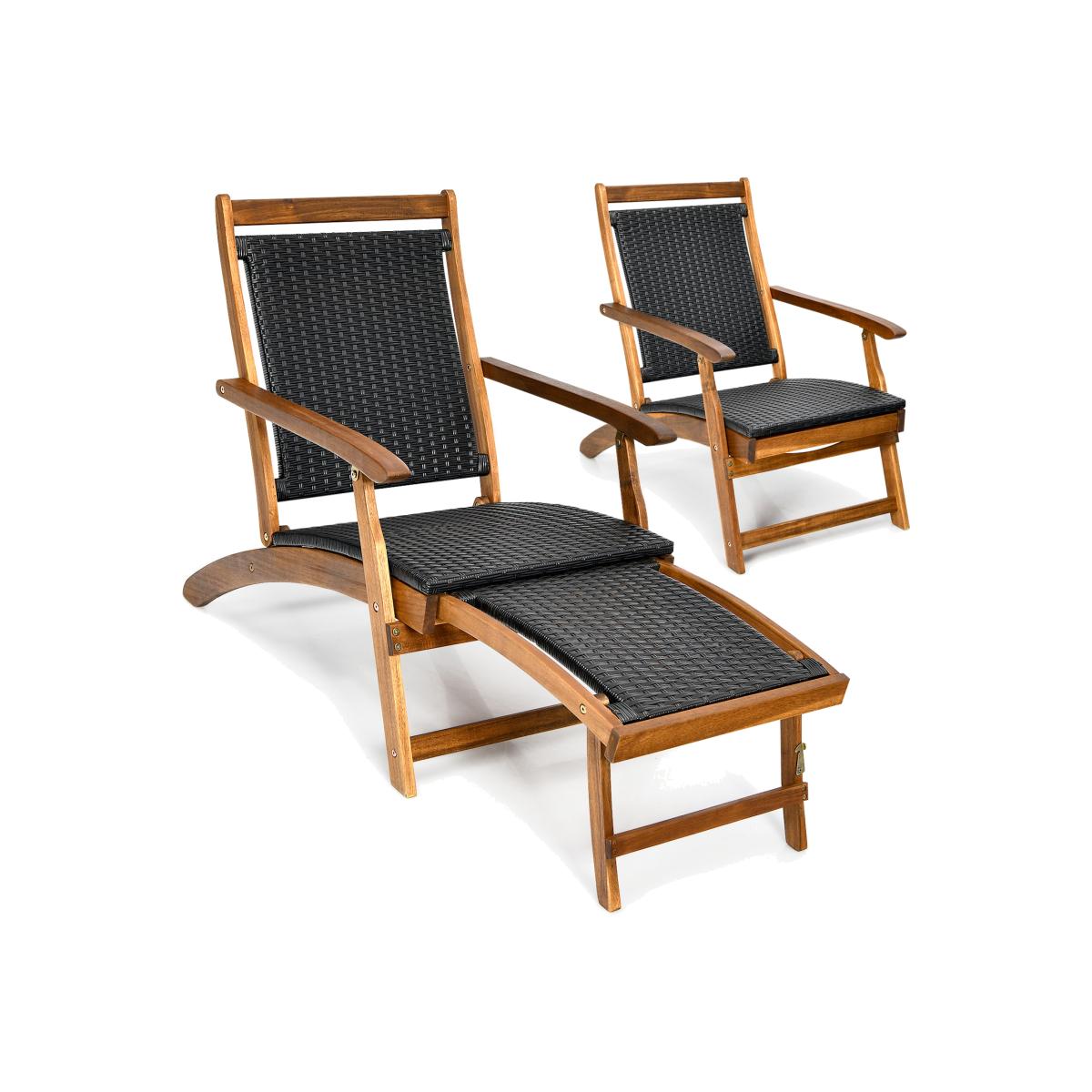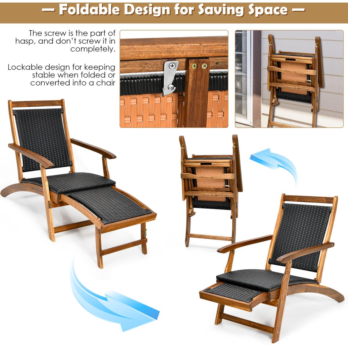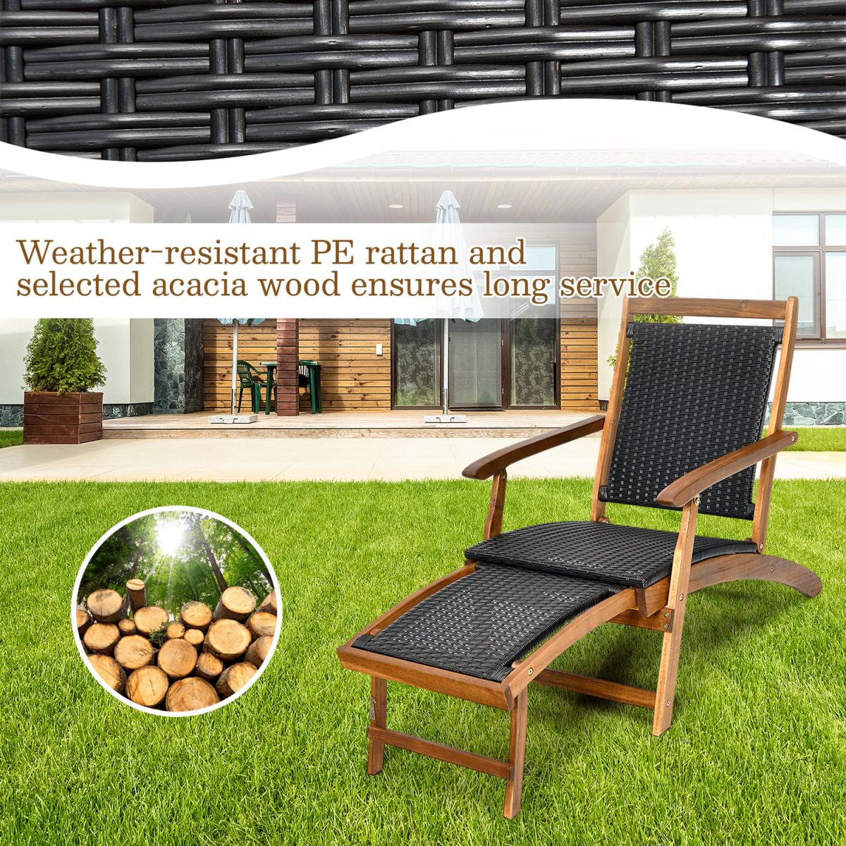 Our patio deck chair brings pleasure and comfort to your outdoor & indoor activity! Crafted of solid acacia wood frame and durable PE rattan, this lounge chair is strong and durable enough to ensure long service life. This deck chair adopts ergonomic design for comfortable seating experience. It can be folded with several steps when not in use. Plus, the outdoor lounge chair is fixed with hasp during storage and transportation. The foot rest can be easily folded under the seat, if you just want to sit a chair. With simple and rustic design, the lounge chair adds harmonious and nature accent to outdoor or indoor occasions, such as porch, backyard and garden. Note: It's better to keep the furniture set in a dry place for prolonging its using life.