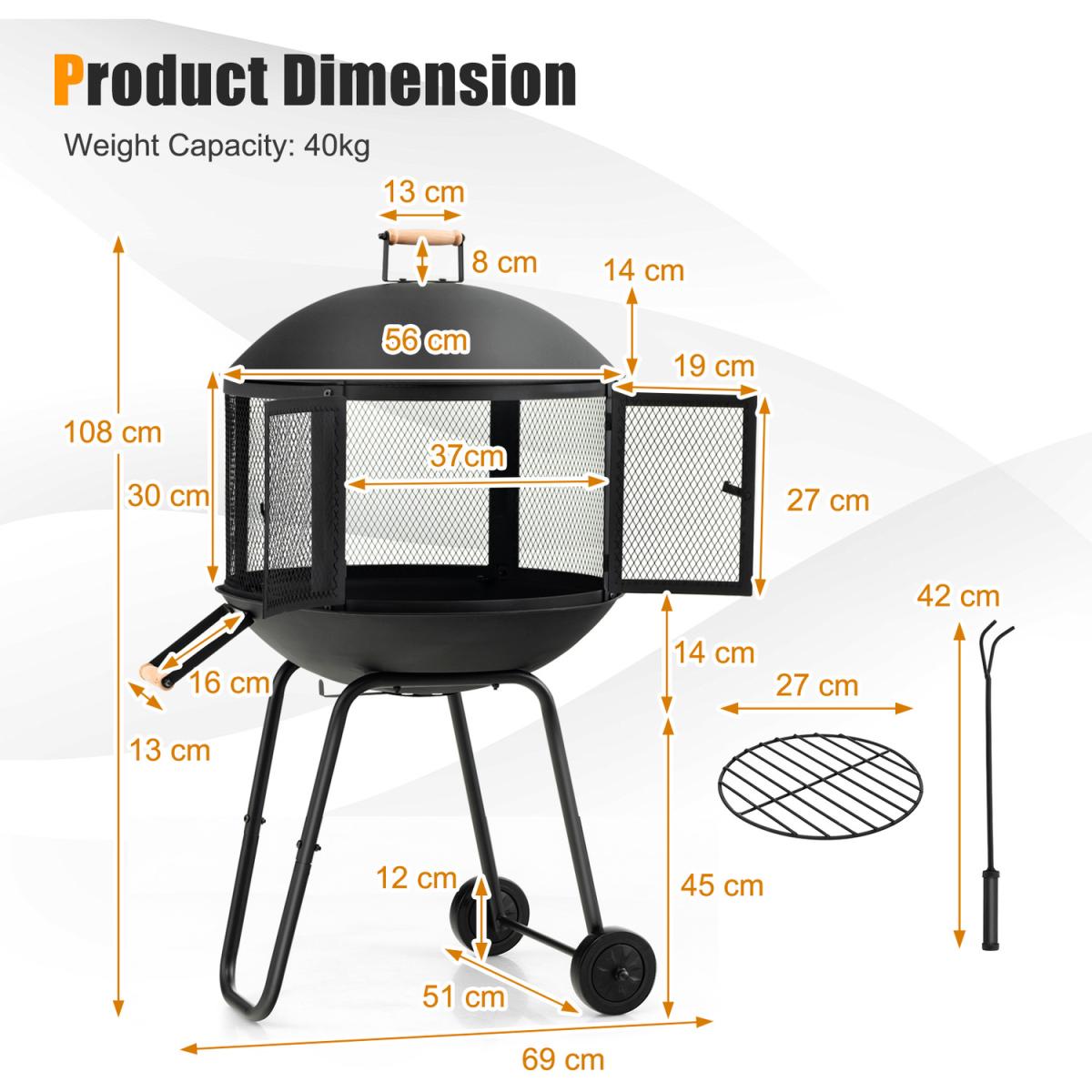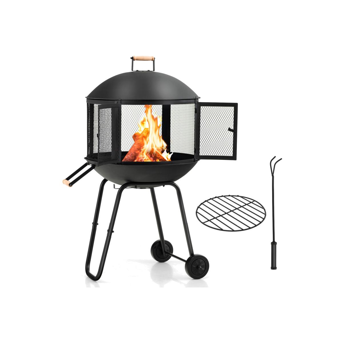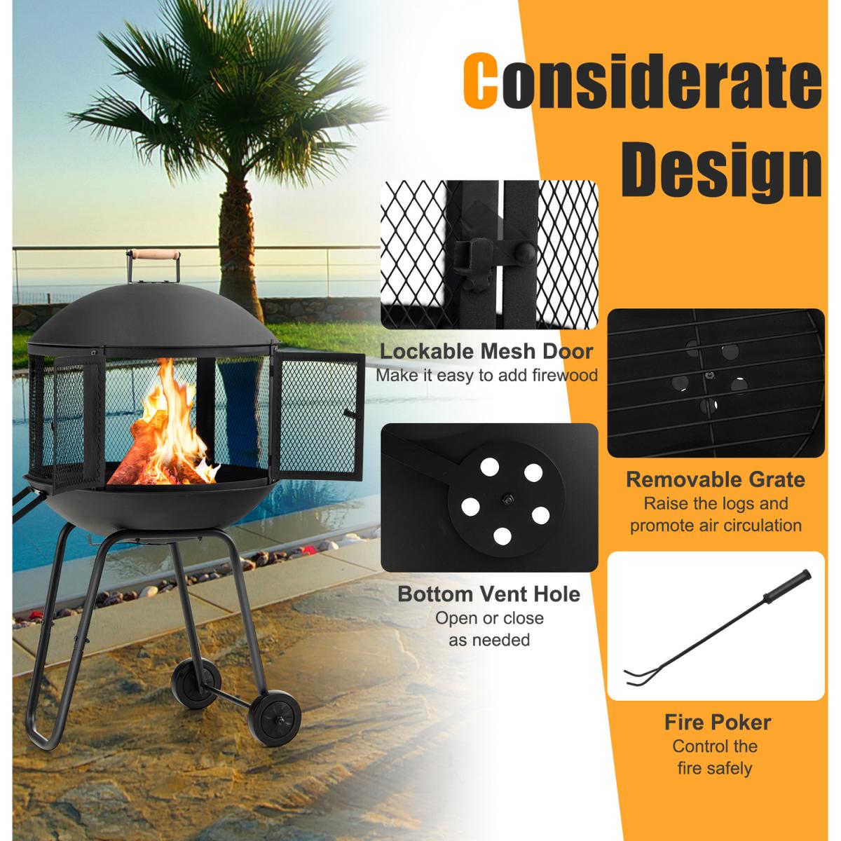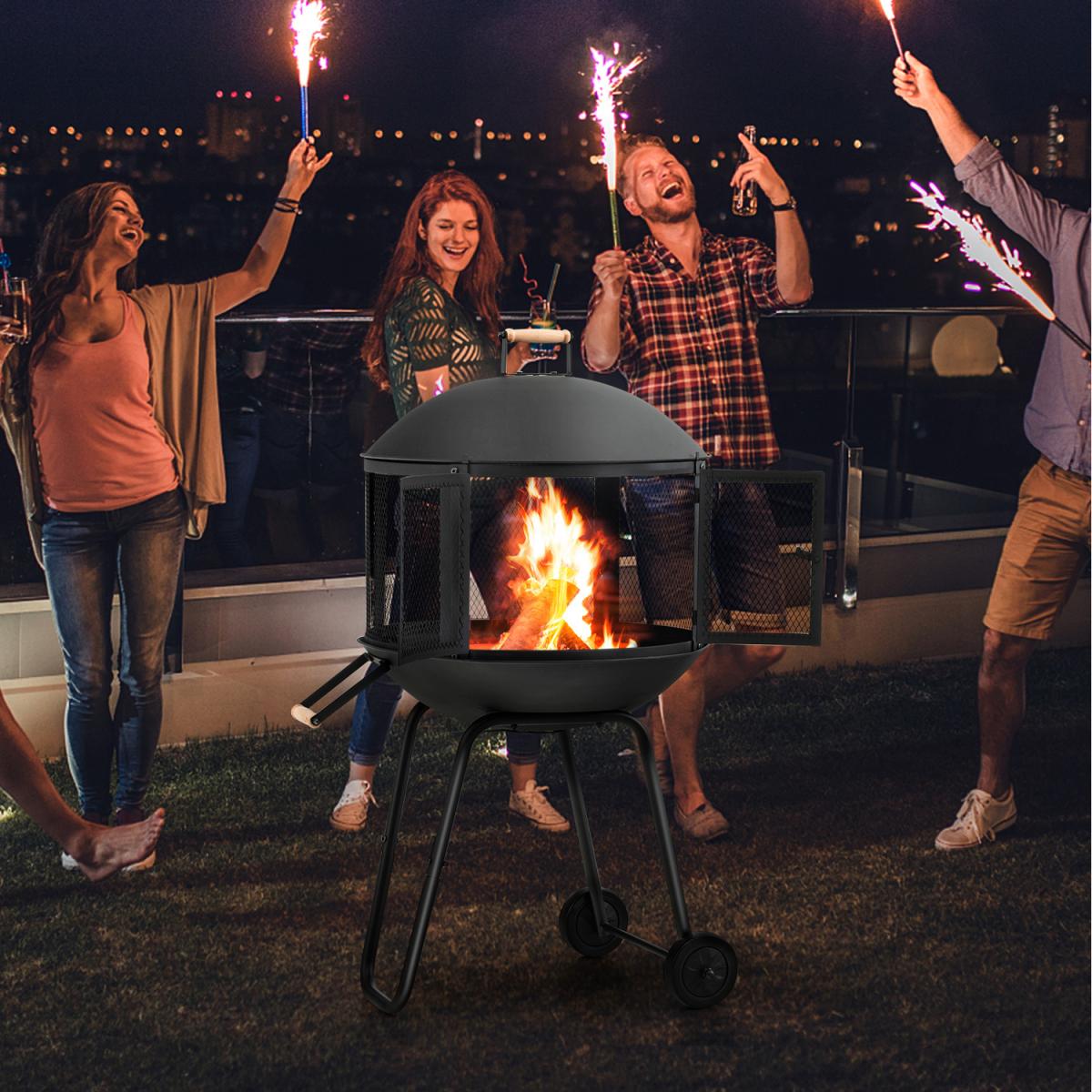 Whether for camping, party, gathering, fire building or any other outdoor activities, this patio fire pit with wheels is always a perfect choice!Made of heavy-duty steel with plastic-sprayed surface, the fire pit is solid, rustproof and heat resistant. And the mesh design effectively promotes air circulation. With this outdoor firepit, you and your friends or family will enjoy an unforgettable outdoor time. Besides, our fire pit is equipped with 2 rolling wheels and a convenient side handle, so you can move the pit anywhere as you like. Apart from that, double doors give you easy access for adding wood and cleaning ashes. The ventilation hole with rotatable base also further helps better maintenance. All in all, this patio fire pit is an awesome addition for outdoor places in winter.