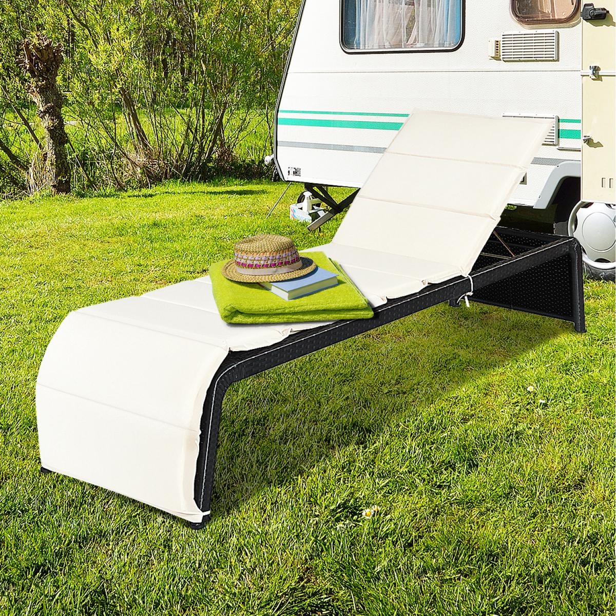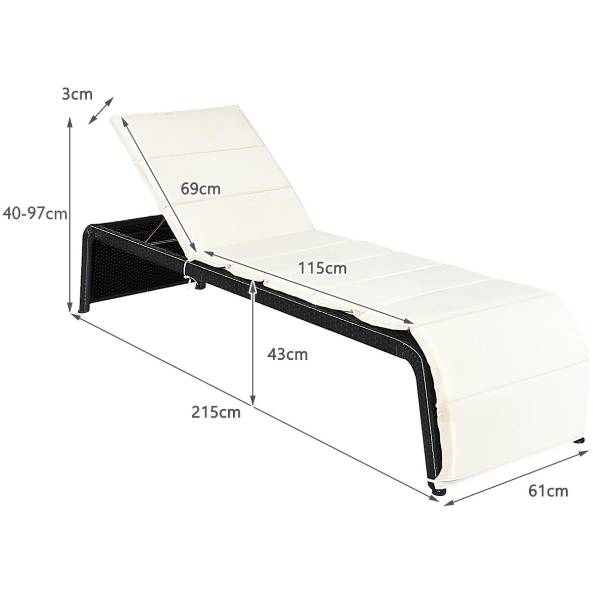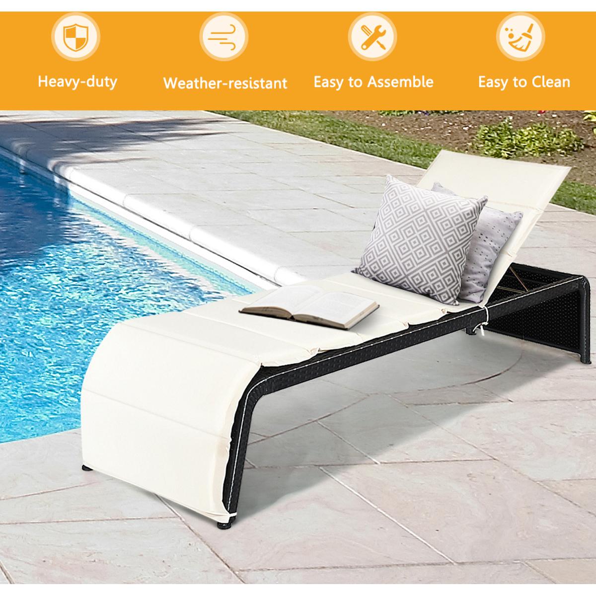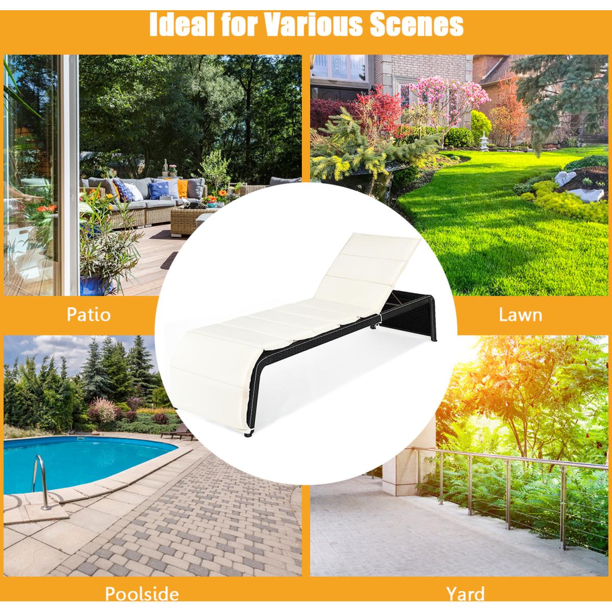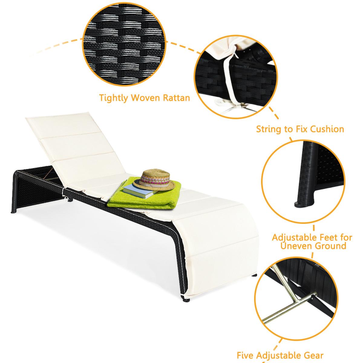 Our lounge chair can let you enjoy the sunshine while taking a nap in the patio. The heavy duty frame and durable material offers a long term use. There are 5 adjustable positions of the backrest to bring you the most comfortable experience. And the thick cushion is soft and skin-friendly for relaxation. The wicker rattan chaise lounge is suitable for various occasions both serving as a decoration and a practical furniture. Moreover, with weather-resistant feature, the chaise lounge is easy to maintain.