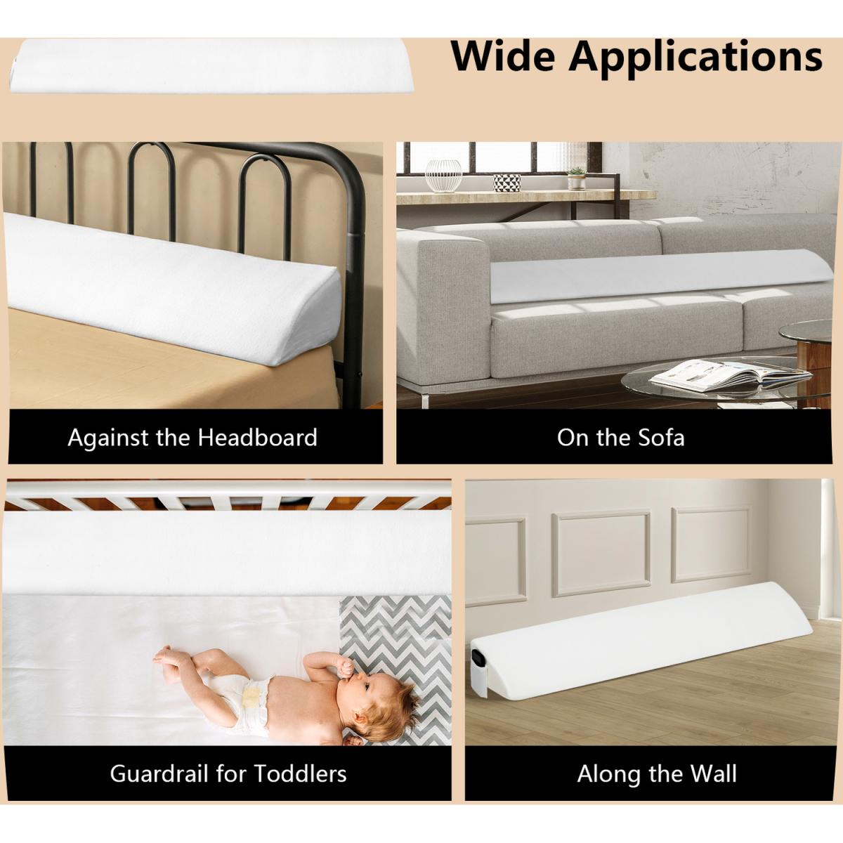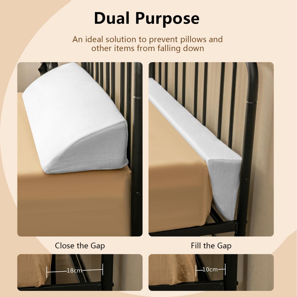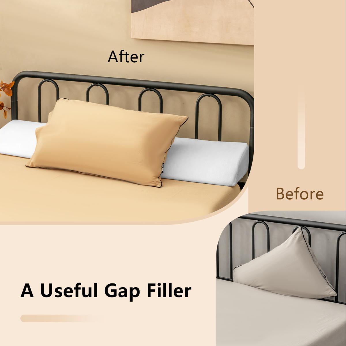 The full/queen size bed wedge pillow is perfect for people who often encounter the situation where items slipping off into a gap. Superior comfort is well ensured by the 25. D sponge and breathable polyester. Also, the bed pillow becomes very elastic to perfectly fill the gap with a max length of 18cm, while its arched surface is ideal to support your neck in an ergonomic manner. By the way, a side storage pocket is offered to hold your remote controls, eyeglasses and smart phones. As for the cleaning, the zippered cover is detachable, allowing for convenient hand washing and machine washing. Finally, the rolled-up gap filler requires no assembly but 72-hour expansion period.