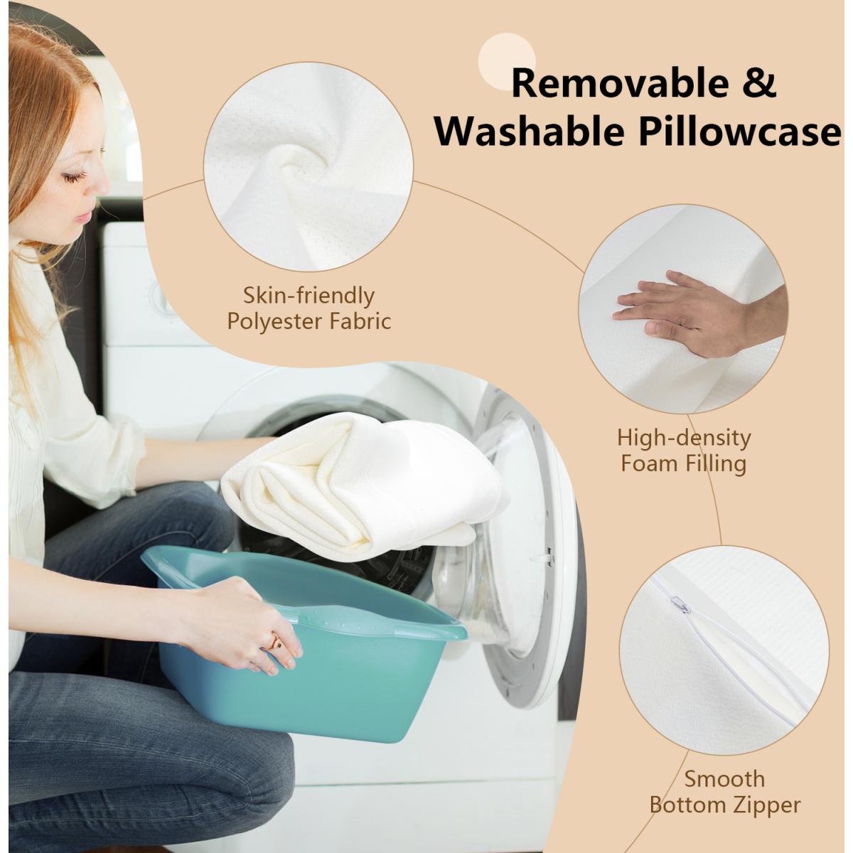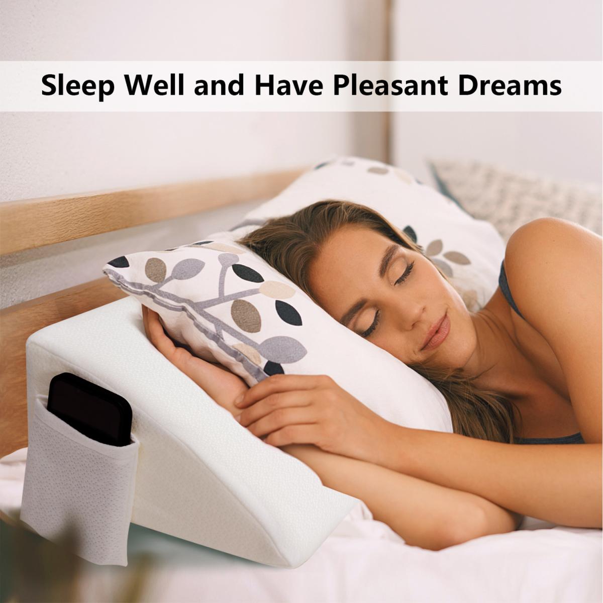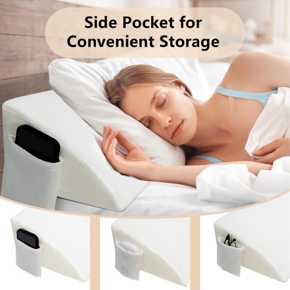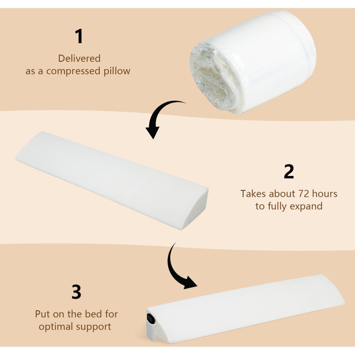 The full/queen size bed wedge pillow is perfect for people who often encounter the situation where items slipping off into a gap. Superior comfort is well ensured by the 25. D sponge and breathable polyester. Also, the bed pillow becomes very elastic to perfectly fill the gap with a max length of 18cm, while its arched surface is ideal to support your neck in an ergonomic manner. By the way, a side storage pocket is offered to hold your remote controls, eyeglasses and smart phones. As for the cleaning, the zippered cover is detachable, allowing for convenient hand washing and machine washing. Finally, the rolled-up gap filler requires no assembly but 72-hour expansion period.