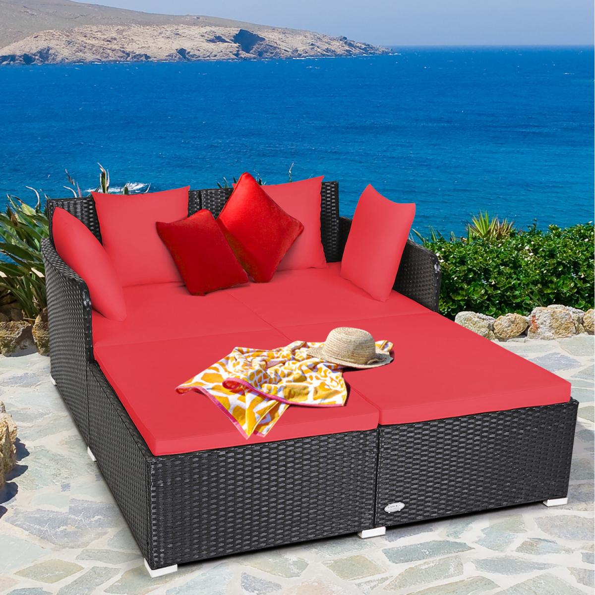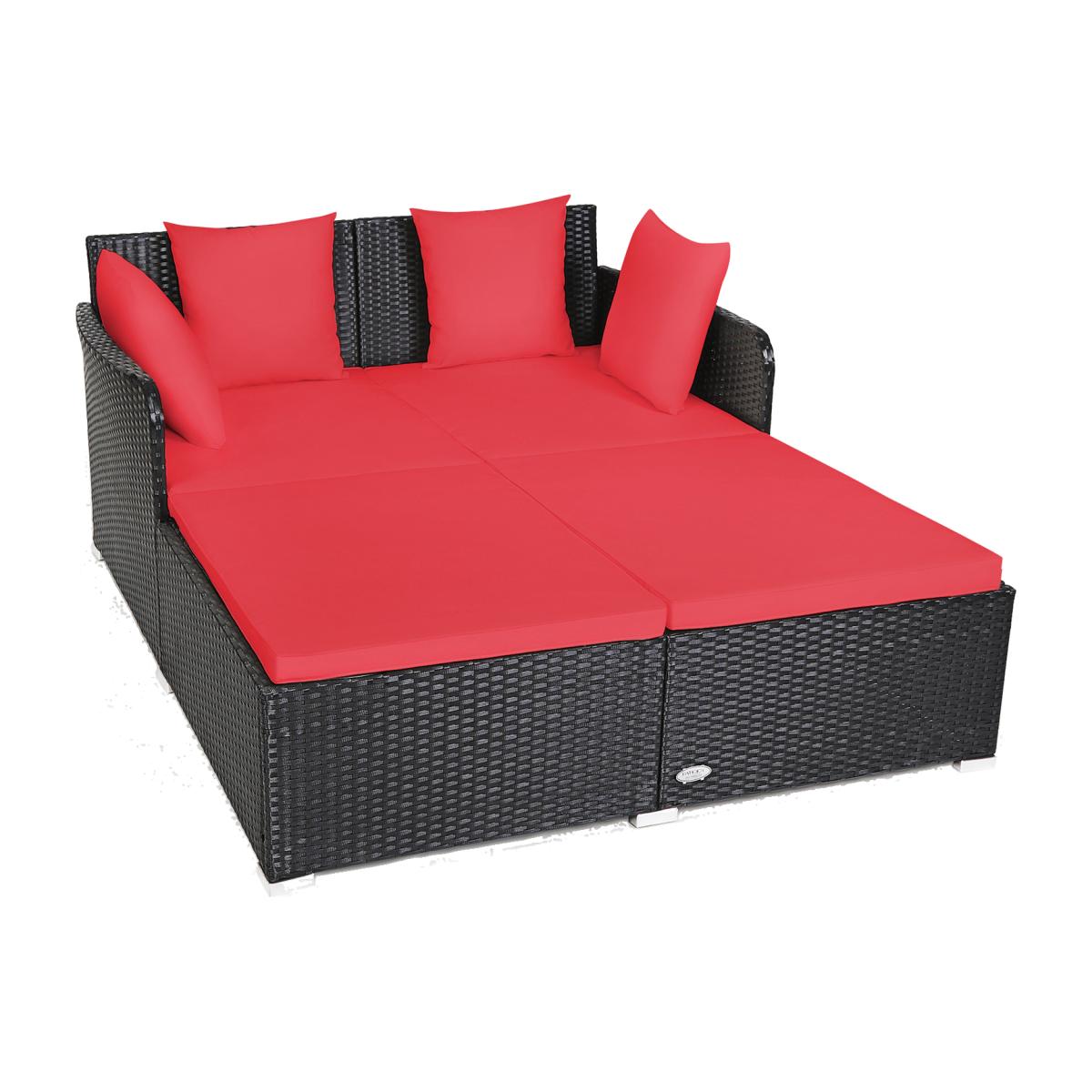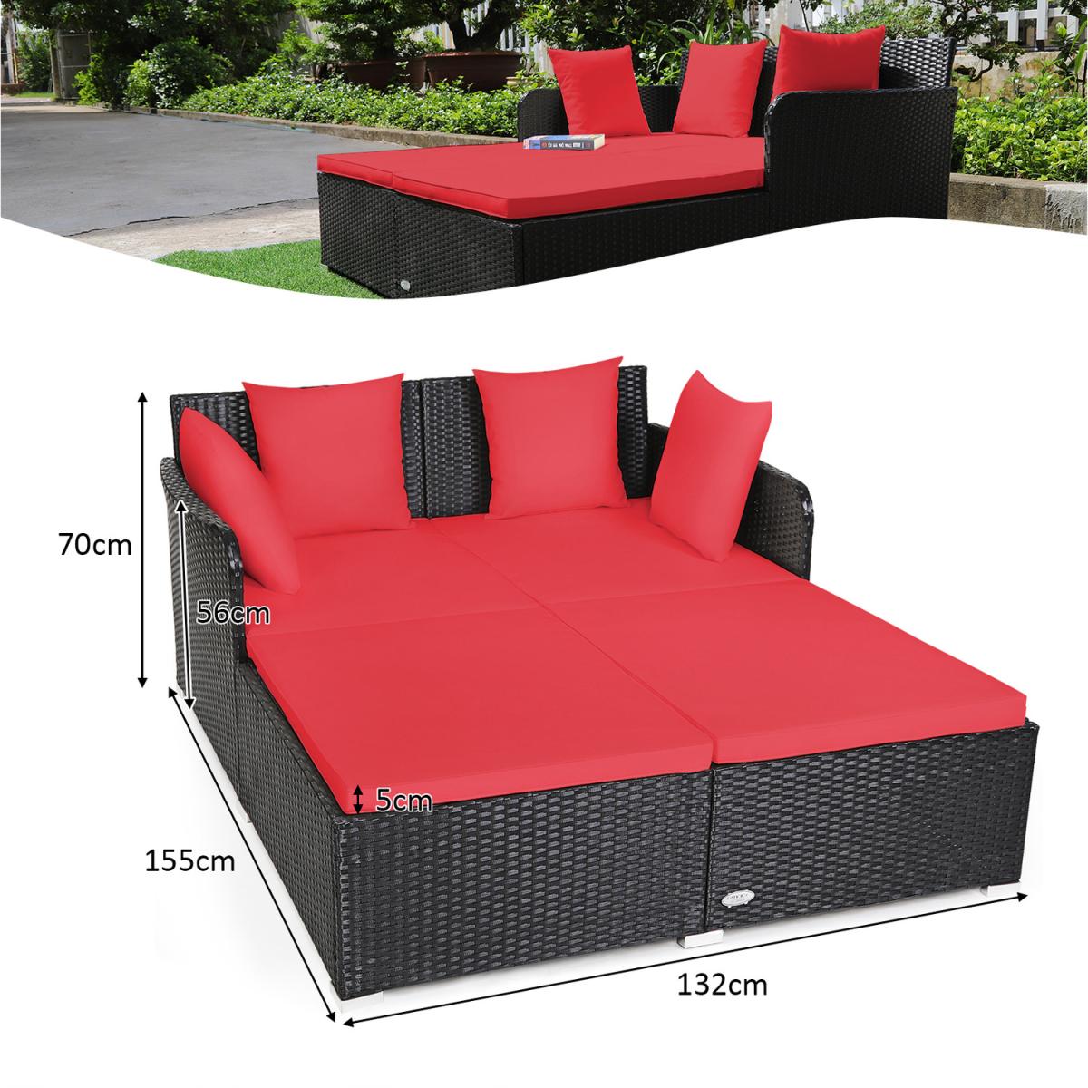 Our rattan daybed is the perfect companion for outdoor relaxation. The spacious space eliminates the worry that tall people will be uncomfortable due to crowding. Armrests and curved backrests add safety while providing strong support to keep you from falling off. The additional 4 throw pillows can be used not only as a headrest but also as a backrest to meet your different needs. Thick cushions are filled with high-density sponges designed to provide long-term comfort. The waterproof cushion with zippers offers great convenience when you want to clean. The selected rattan is weather resistant, which always perform well even outdoors. Besides, aluminum foot pads are durable enough to provide better load bearing of 360kg.