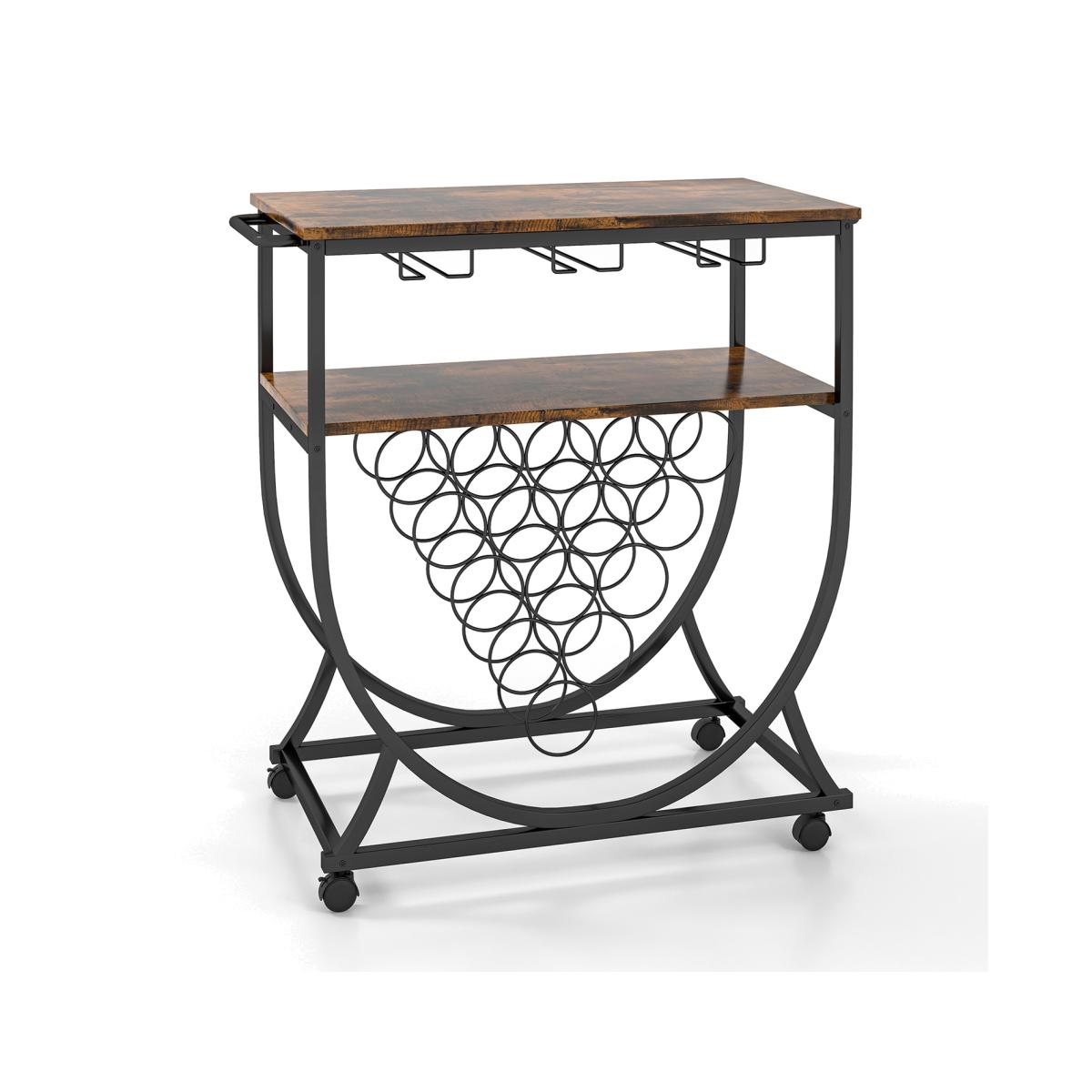 Enjoy wine anytime, anywhere with our industrial bar cart!Whether you want to place it in the kitchen, dining room or living room, this serving cart will make movement easier thanks to its 2 metal handles and 4 universal wheels. Then, you can put tableware, coffee machine and other items on the 2-tier open shelves. And the glasses can be hung on the 3 rows glass holder. The wine rack is ready to hold up to 15 bottles. Based on your preference, the wine bottles can be stored in angle for better flavor.