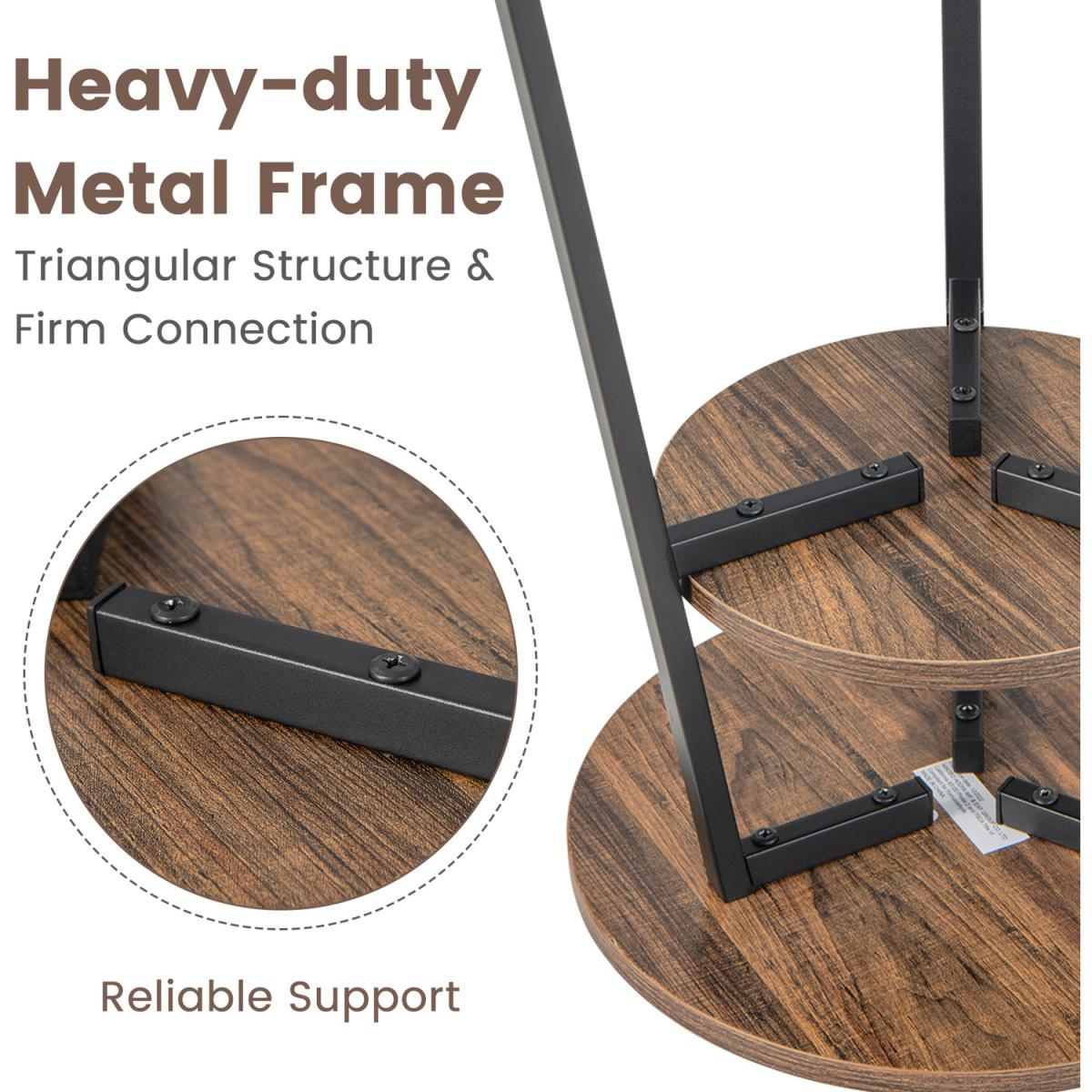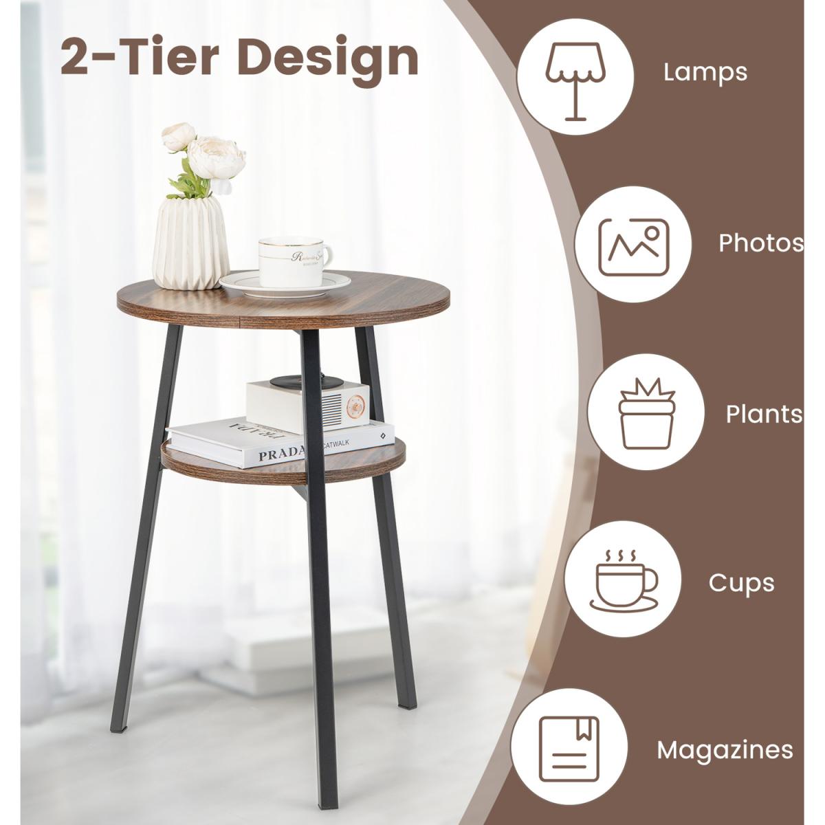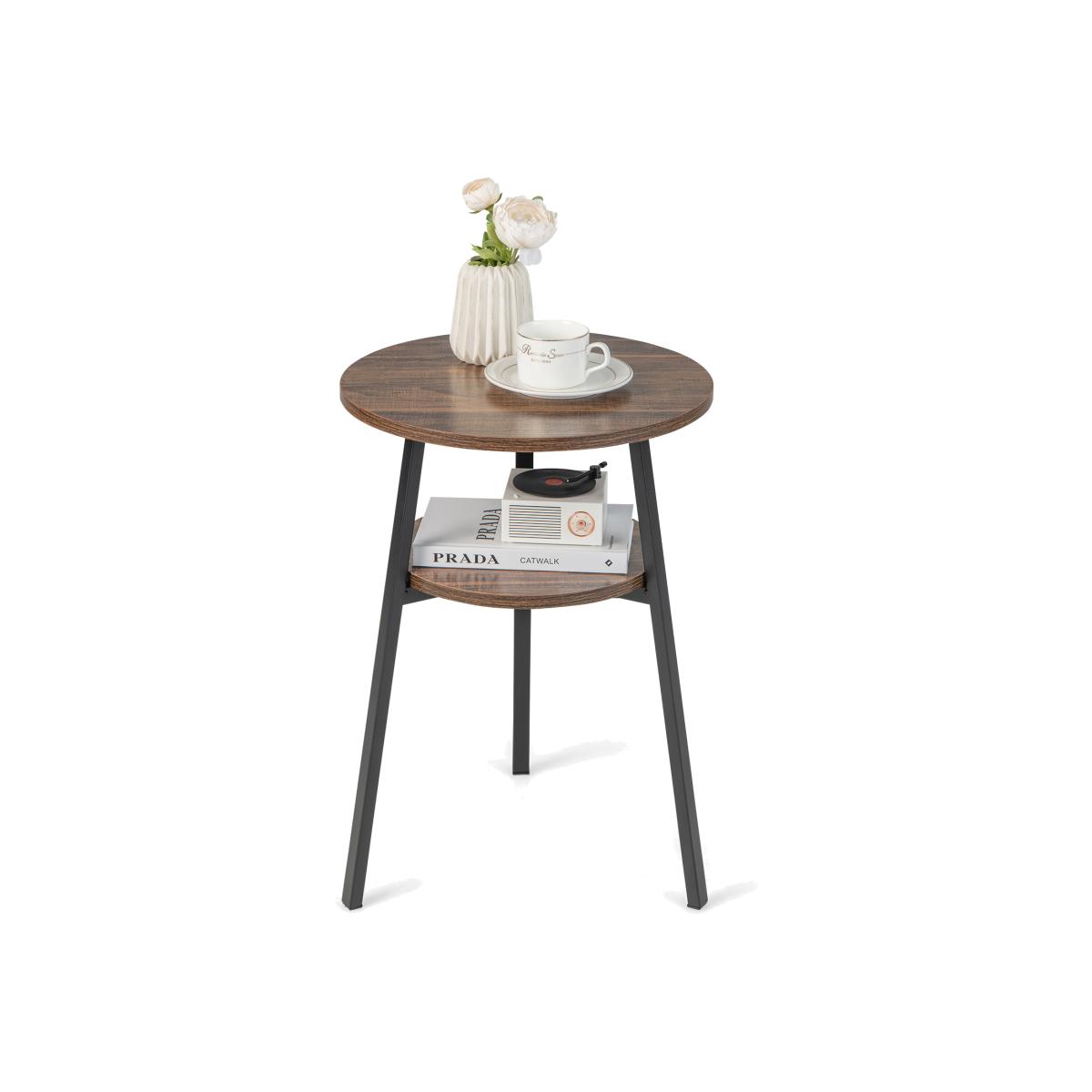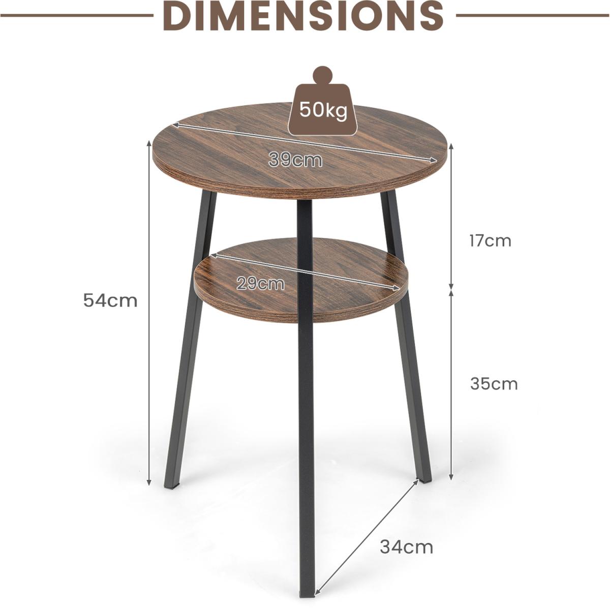 The design of the side table conforms to modern minimalism without compromising of functionality. With beautiful wood grain finish, the accent table breathes a rustic appeal to modern living space. There is a 39cm diameter round tabletop and an open storage shelves to offer ample storage space for living room sundries or bedtime essentials. And the sturdy construction made of high-strength metal pipes allows the end table to hold a great weight. What's more, the rustproof metal frame offers a longer service life. More details, like the sleek edge and non-slip foot pads, will give you a better experience.