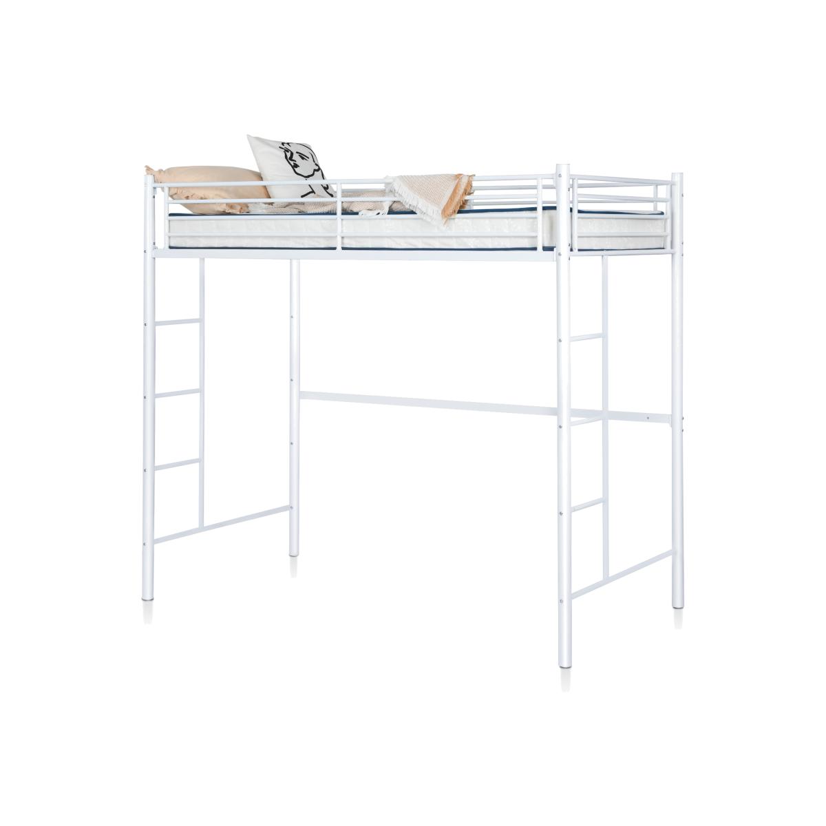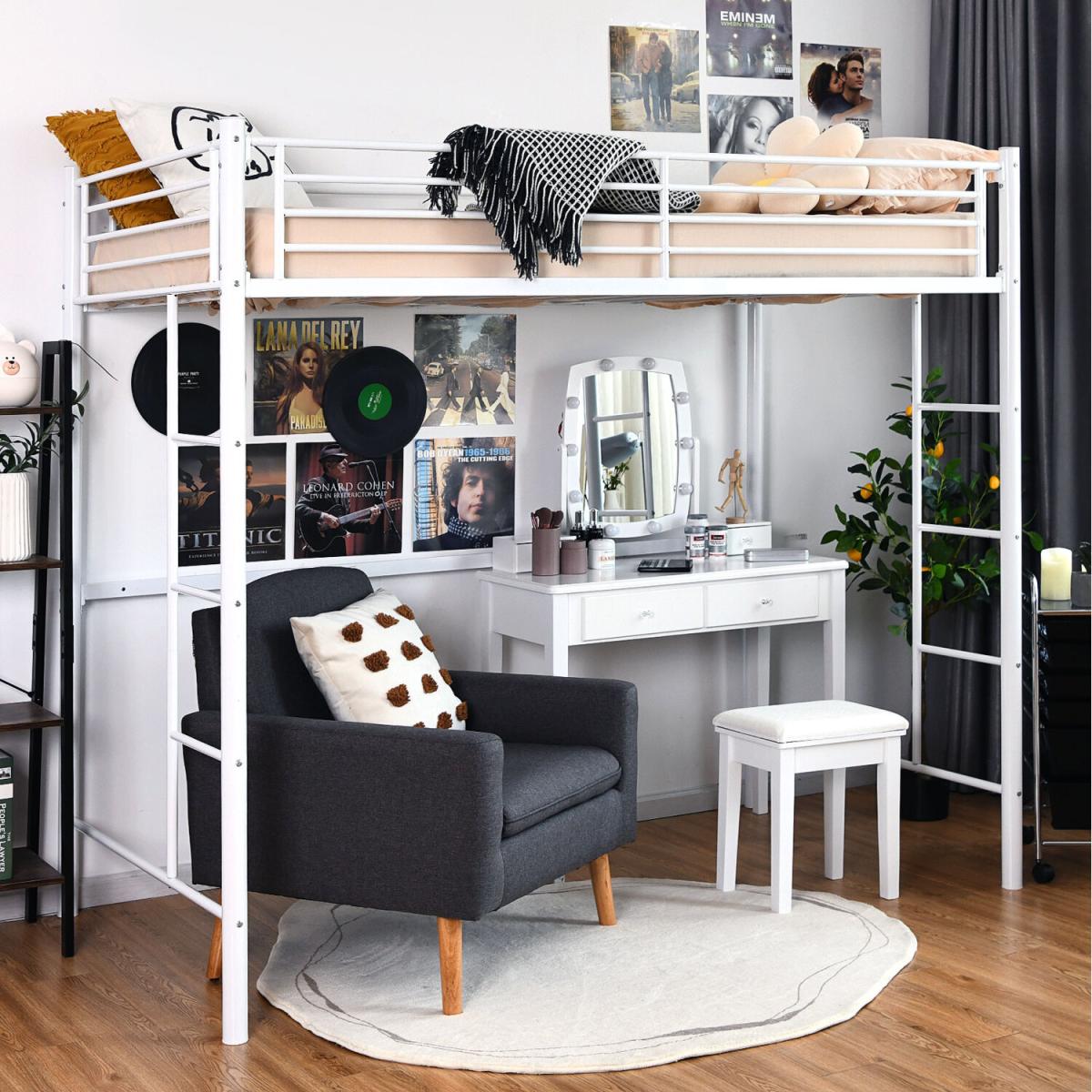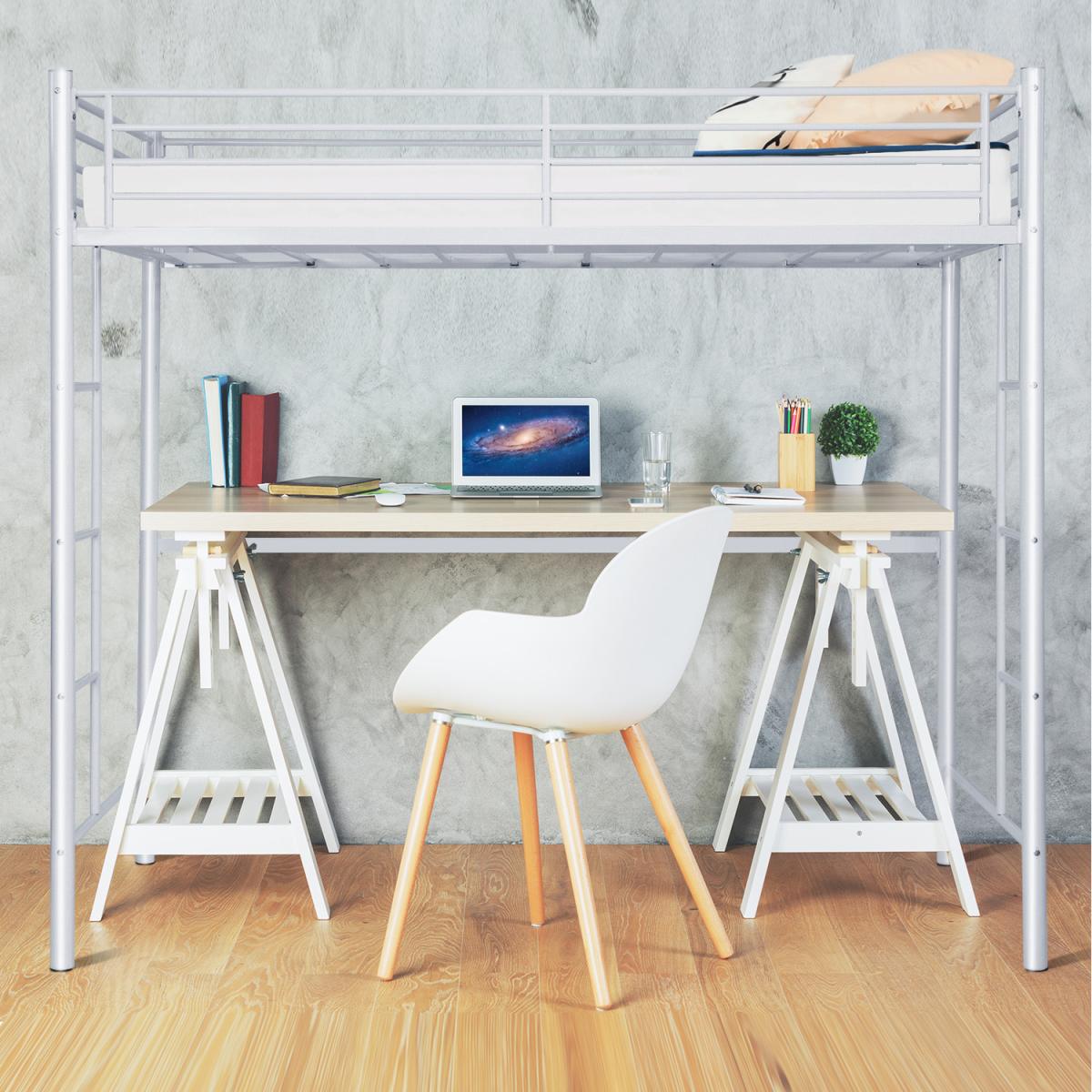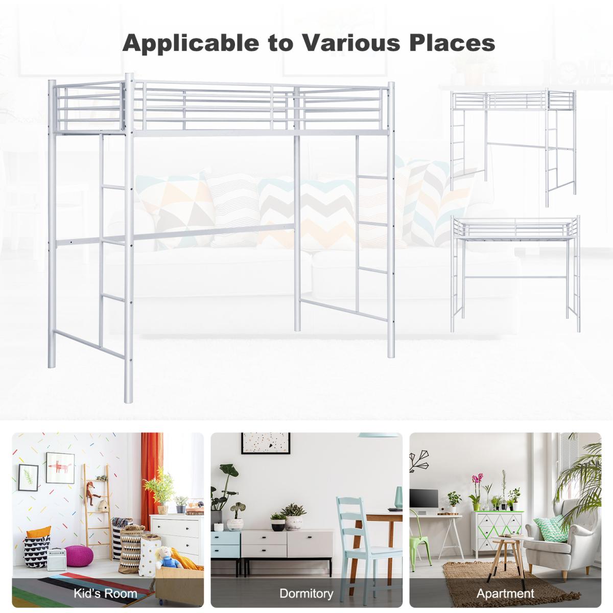 Enjoy comfortable night's sleep with our loft bed! Our bed frame is made of powder-coated steel slats, ensuring good toughness and high strength for long-term use. Moreover, the reinforced guardrails bring full sense of security and wide ladders make children climb up or down safely and easily. The under-bed space is spacious enough for you to store belongings or create a area for studying, leisure, working, etc. This stylish loft bed adds highlight to any place, making it ideal for kid's room, apartment, etc.