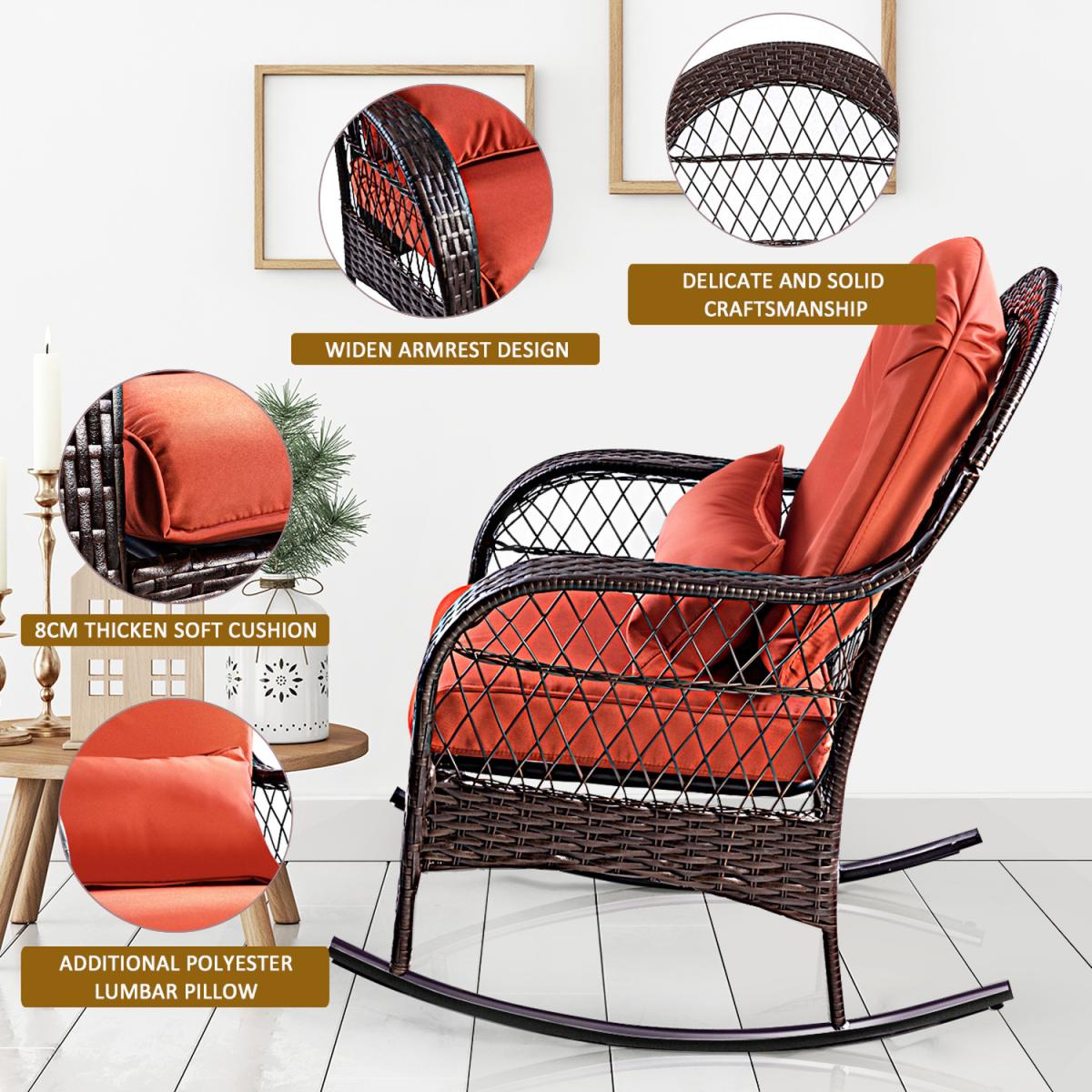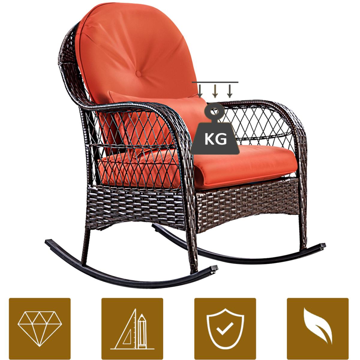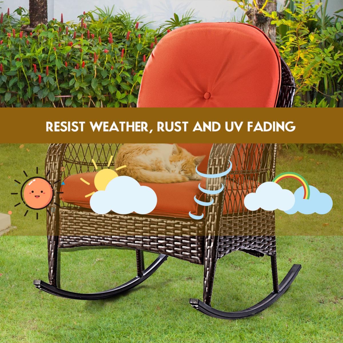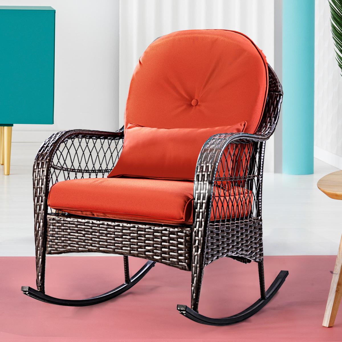 Our wicker rocking chair enjoys ergonomic streaming and soft cushioned back that appalled comfort. There's nothing more relaxing than kicking back on an ingeniously designed and ultra-comfortable rocking chair after a hard day's work. The specialized back angle construction designed at a prime degree for optimal rocking, which allowing for unassisted smooth and balanced deep or light rocking without the need for constant pushing. The 8cm thicken cushion and PP backrest are comfortable that will offer excellent sitting experience to you. All materials are treated to resist weather, rust and UV fading. It is an ideal choice for outdoor spaces, such as the garden, porch or yard. Don't hesitate to buy it home.