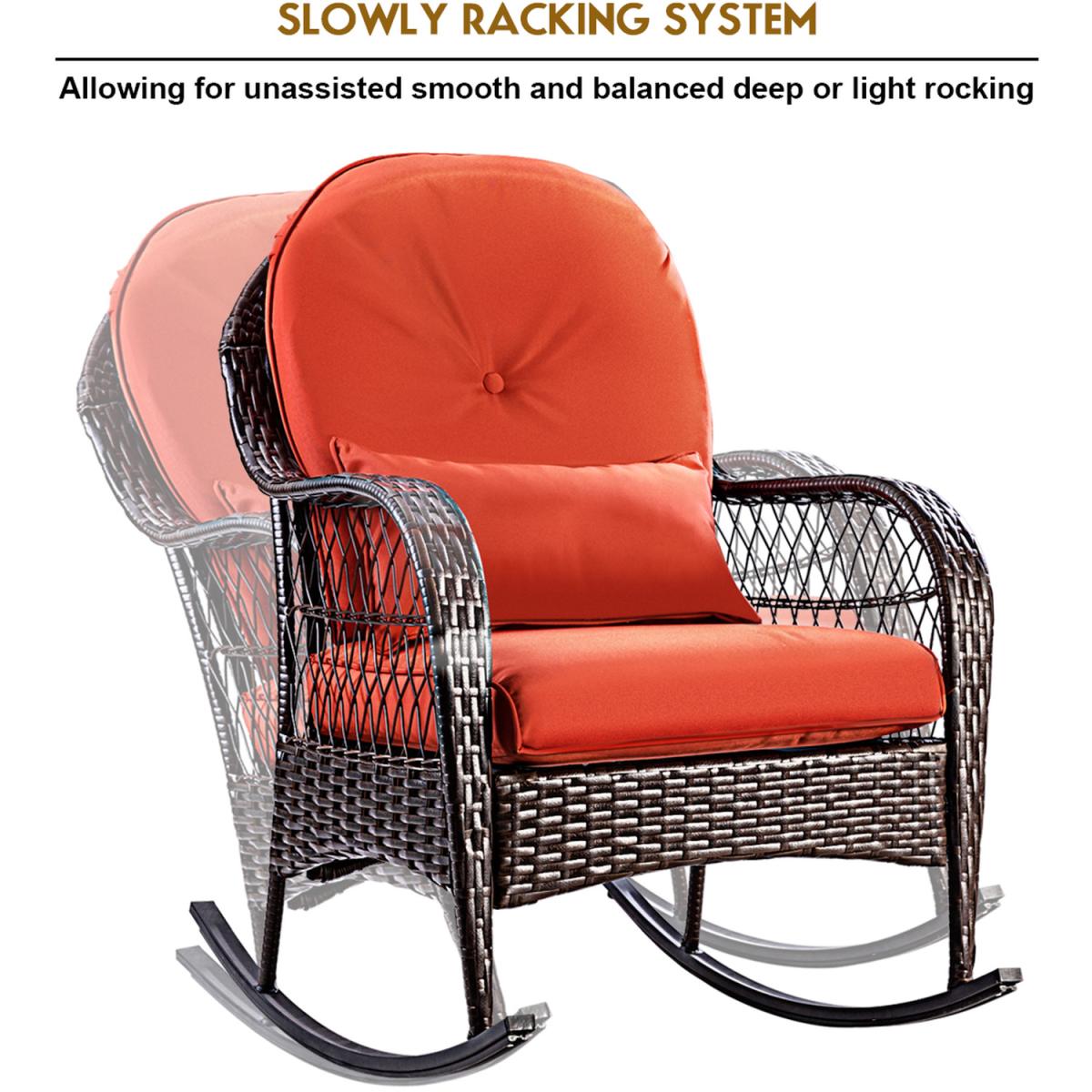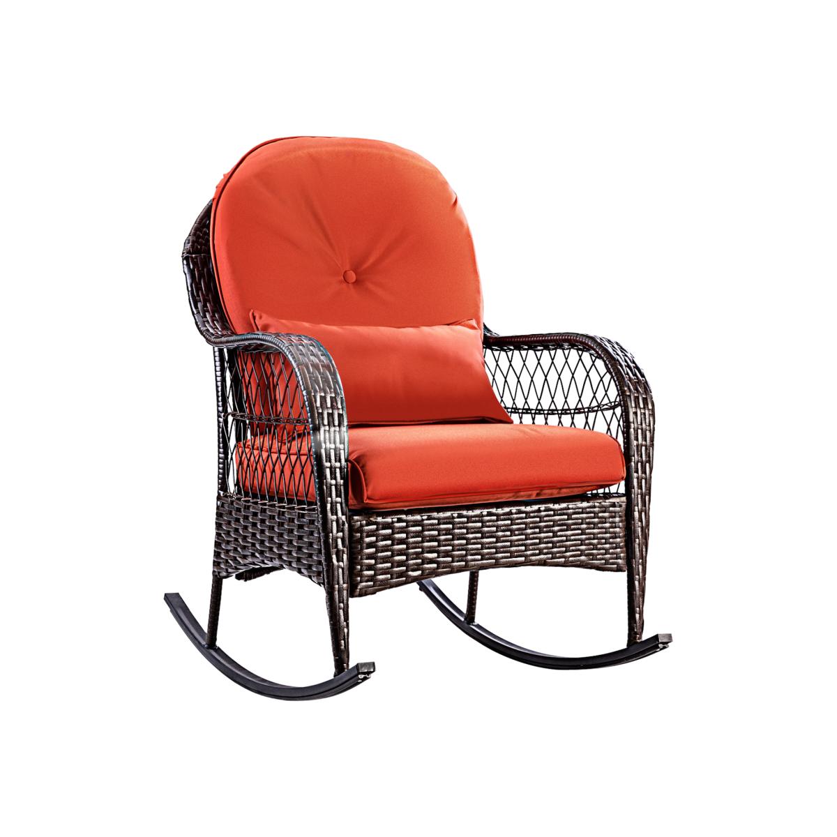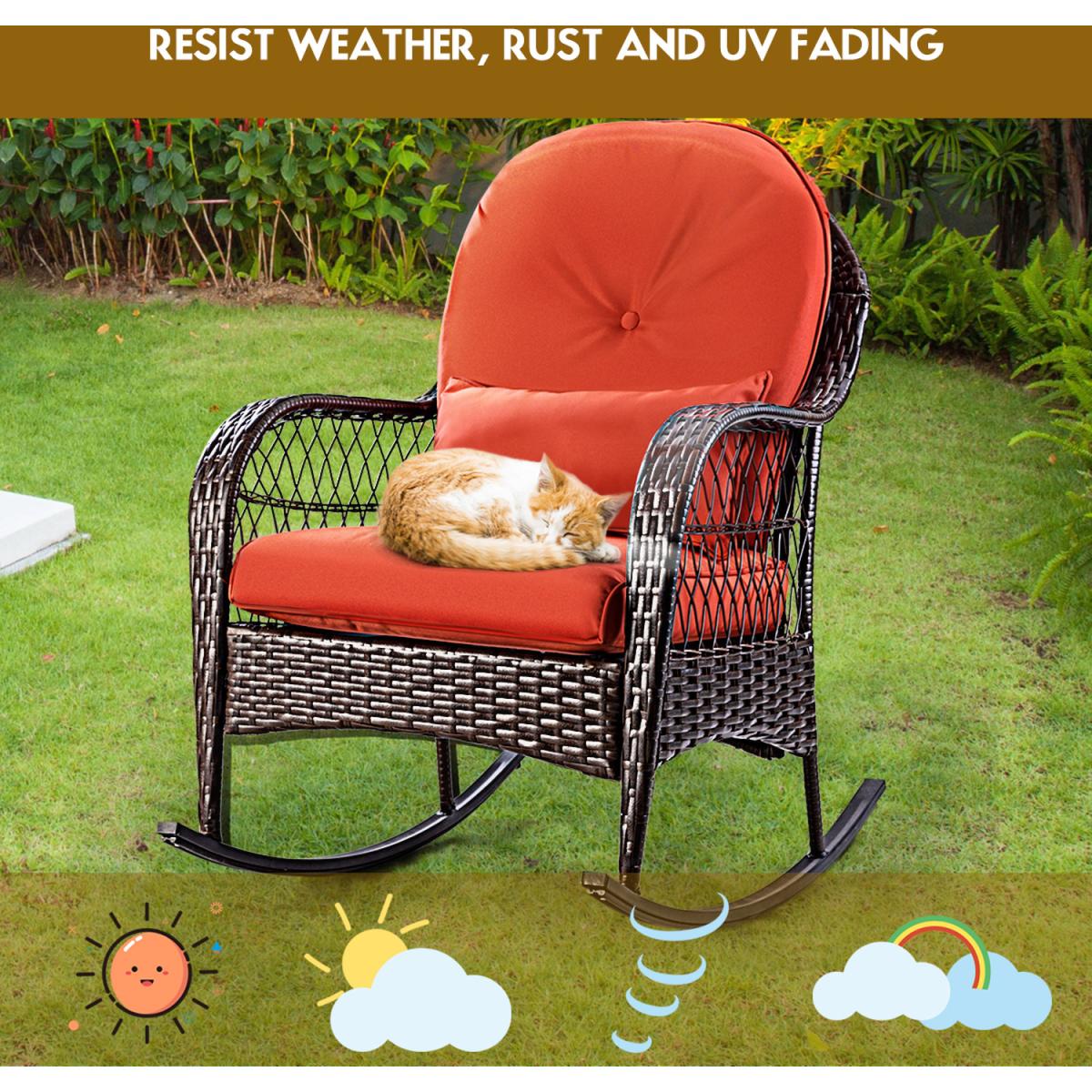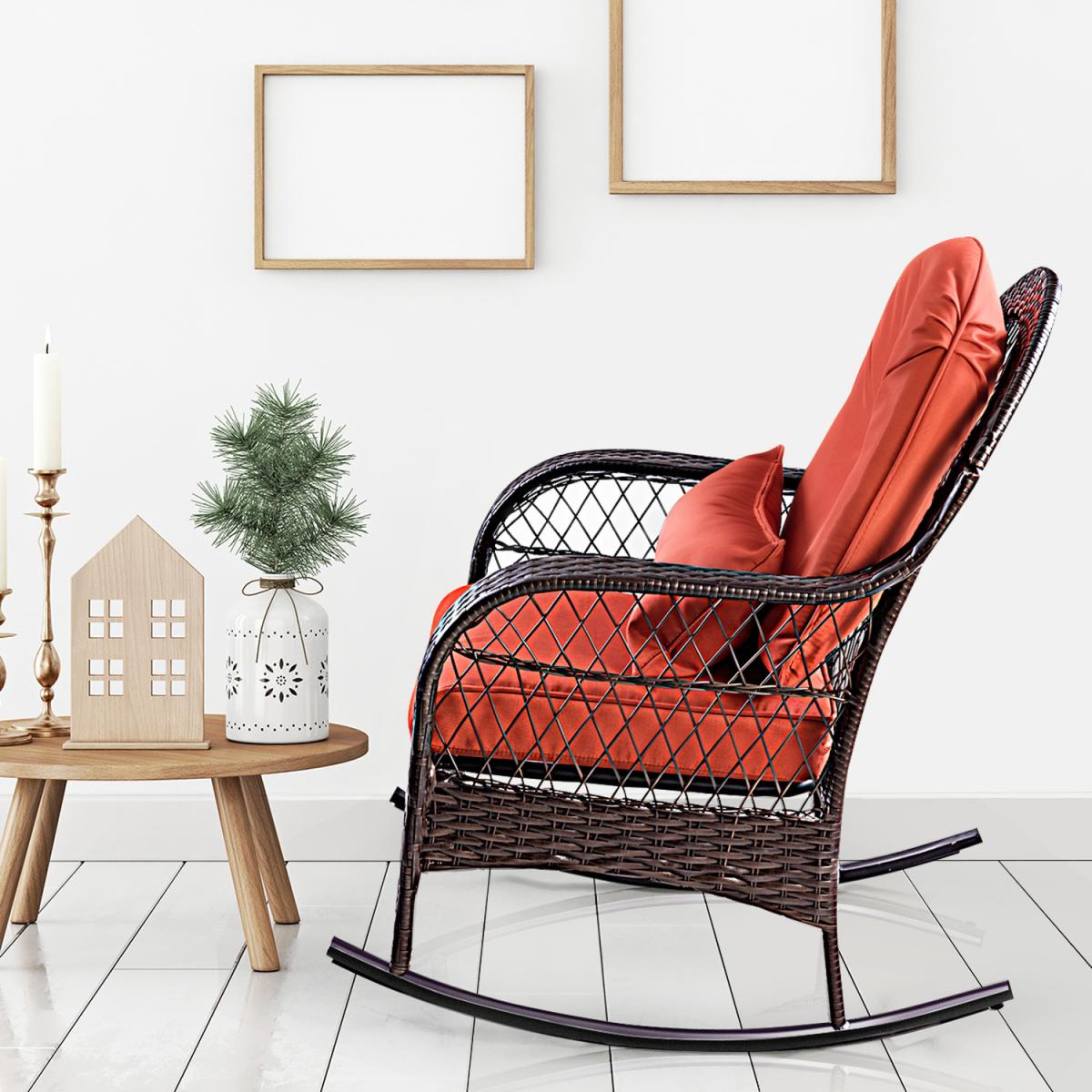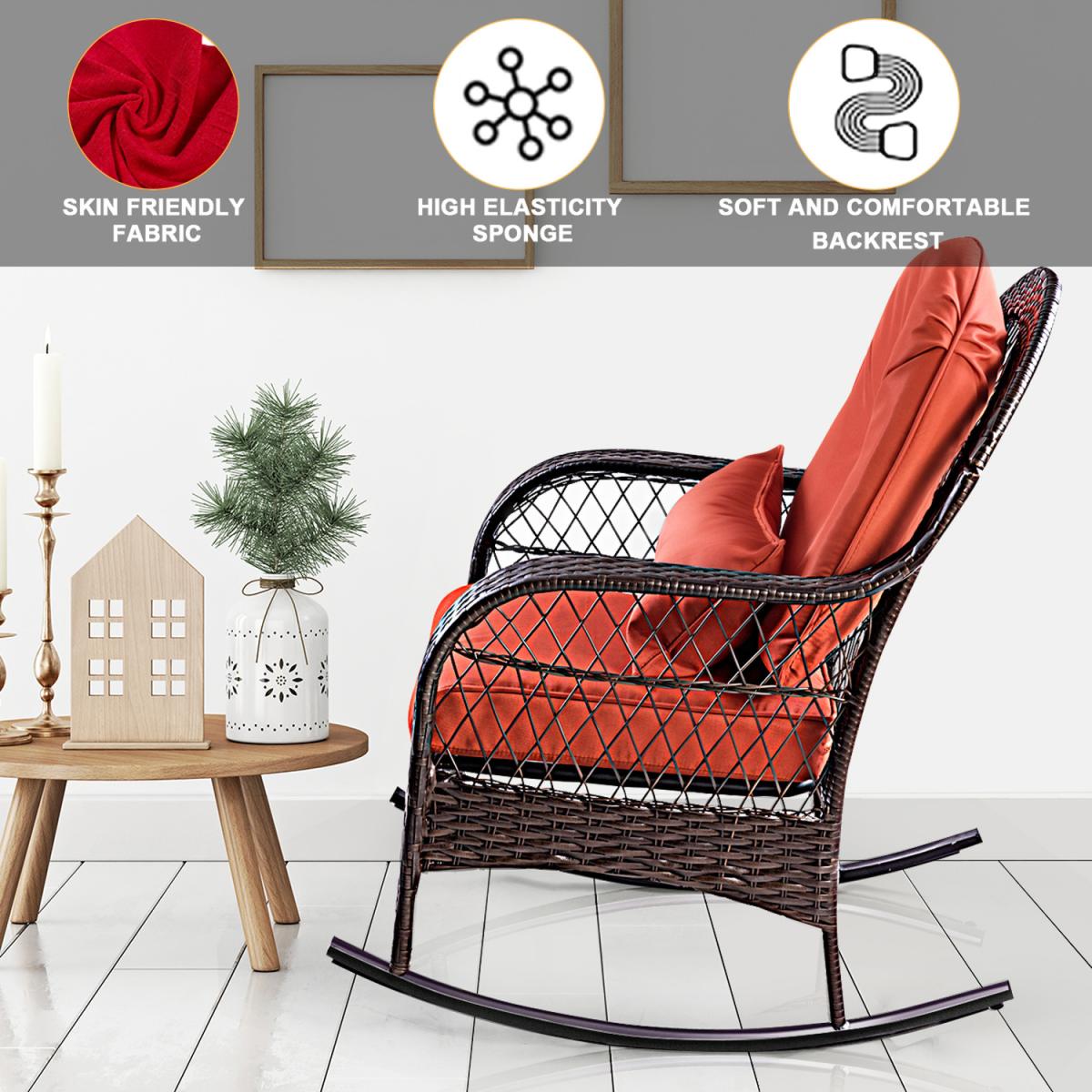 Our wicker rocking chair enjoys ergonomic streaming and soft cushioned back that appalled comfort. There's nothing more relaxing than kicking back on an ingeniously designed and ultra-comfortable rocking chair after a hard day's work. The specialized back angle construction designed at a prime degree for optimal rocking, which allowing for unassisted smooth and balanced deep or light rocking without the need for constant pushing. The 8cm thicken cushion and PP backrest are comfortable that will offer excellent sitting experience to you. All materials are treated to resist weather, rust and UV fading. It is an ideal choice for outdoor spaces, such as the garden, porch or yard. Don't hesitate to buy it home.