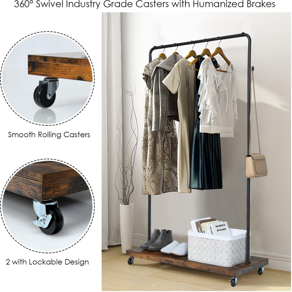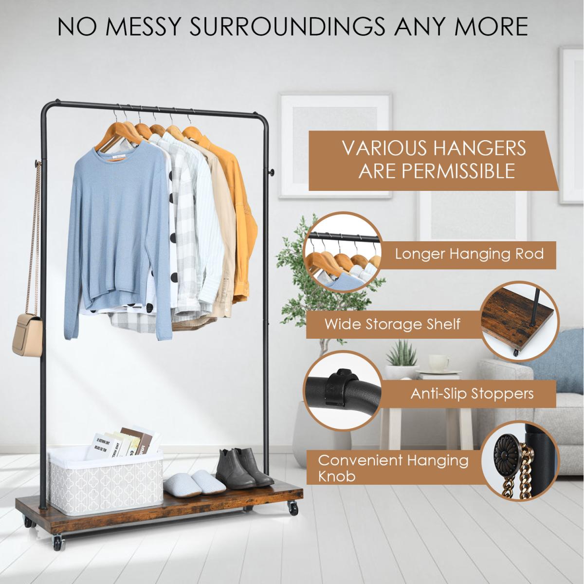 Still be frustrated with scattered clothes all around your room? This rolling garment rack with large capacity will help a lot. It features ultra sturdy hanging rod which enables you to hang as many as possible clothes. The shoes, handbags and other items will find a good storage space as well, since it is designed with a wide wooden storage shelf. Its 2 in 1 design definitely brings much more convenience to your daily life. The smooth rolling casters make it easy to move the rack from living room to bedroom, from laundry room to entryway. And 2 of them are equipped with brakes. In this way, you can keep the rack in a position as per your preference. Besides home use, it is also perfect for commercial occasions, which shall fulfill the retailers requirement. Other humanized details such as anti slip stoppers, hanging knobs on each side and more are waiting for you to discover.