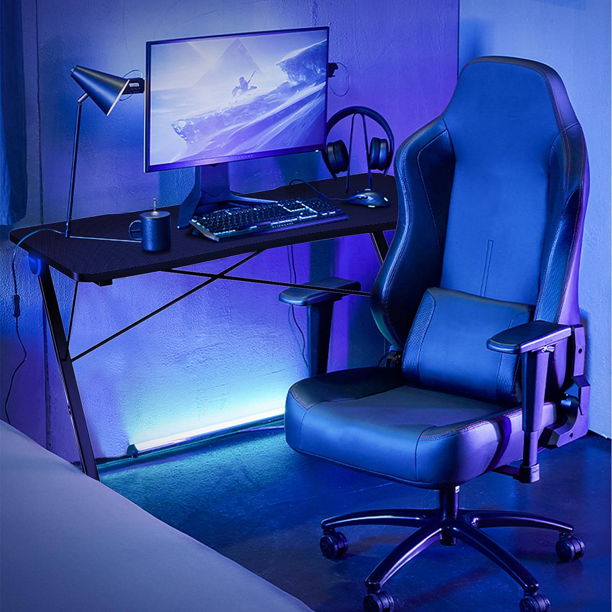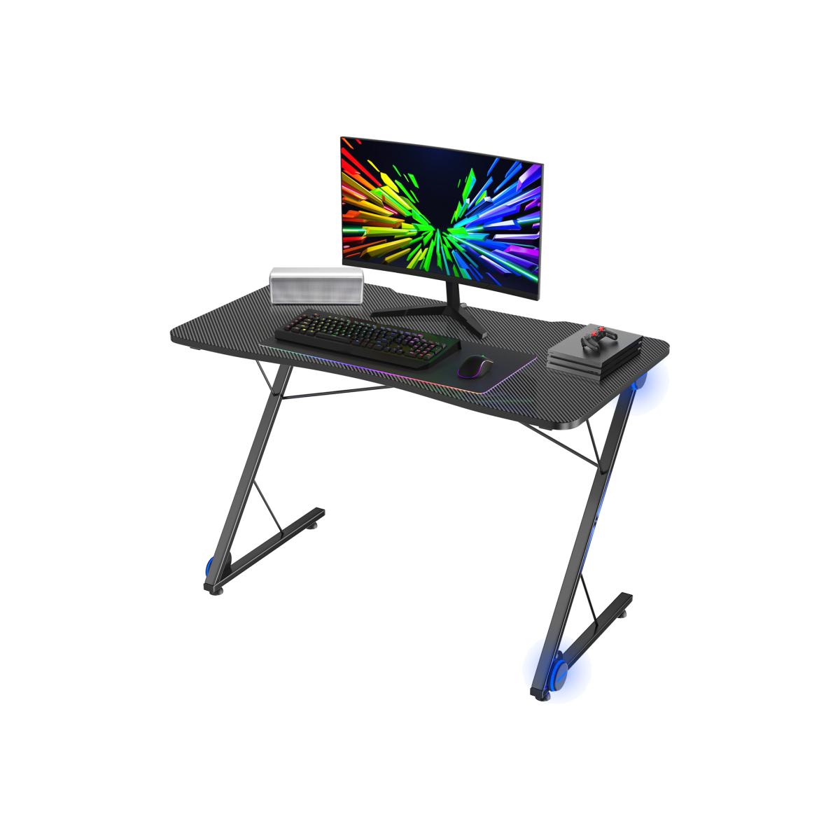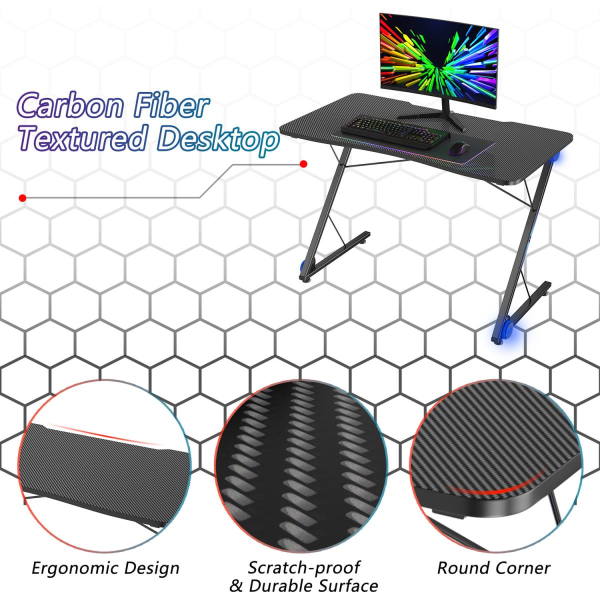 Our gaming desk is the best choice for your exciting game playing!The gaming desk is constructed of premium engineered wood and heavy-duty Z-shaped frame for extra durability with high load capacity. The wide fiber textured desktop provides a large space for holding all your gaming gear. It also comes with 2 cable management grommets, which can perfectly keep cables in order. In addition, it is worth mentioning that this gaming table is designed with 4 LED lights, which can increase the game atmosphere and allow you to enter the battle in a better state. Start enjoying your wonderful gaming time with our functional desk!