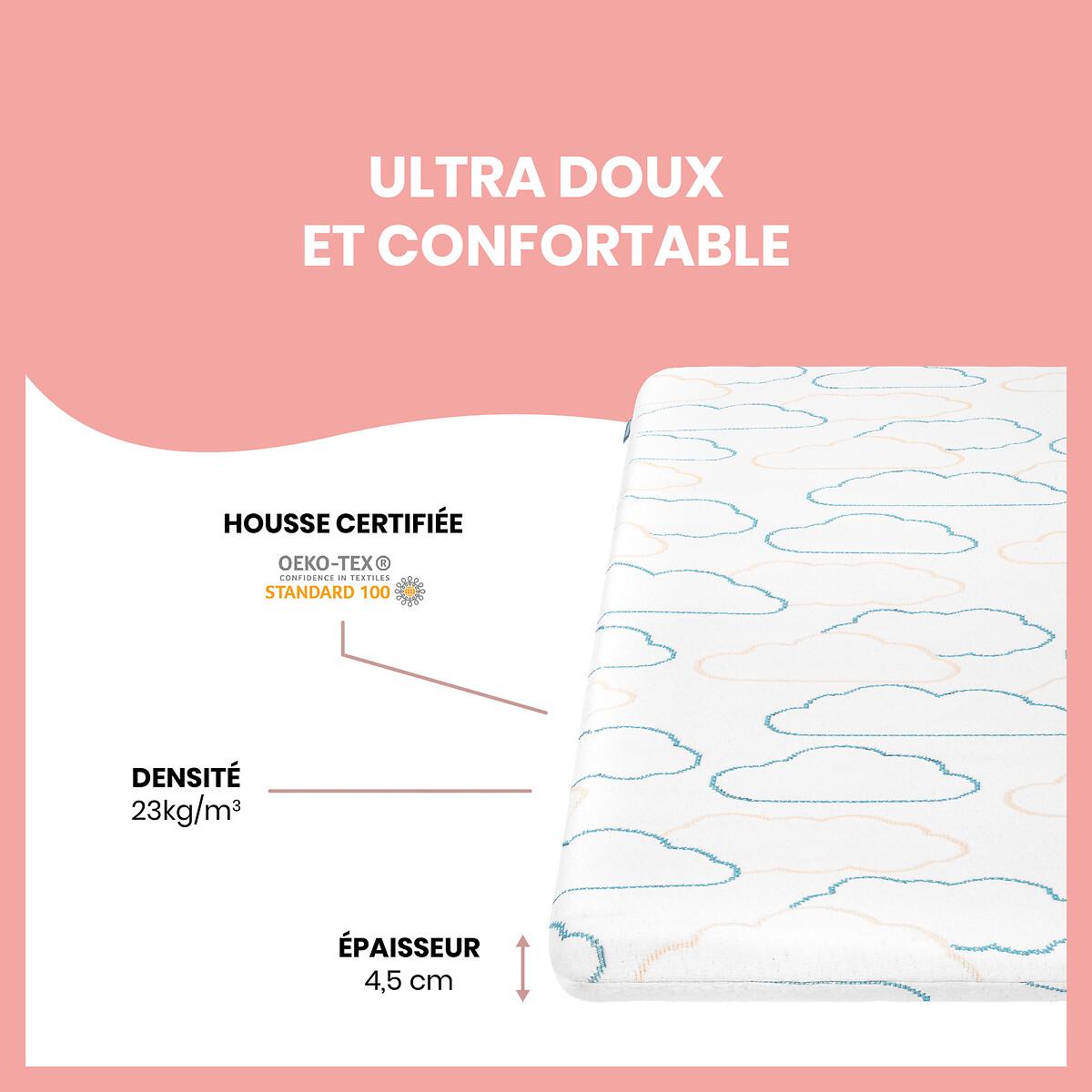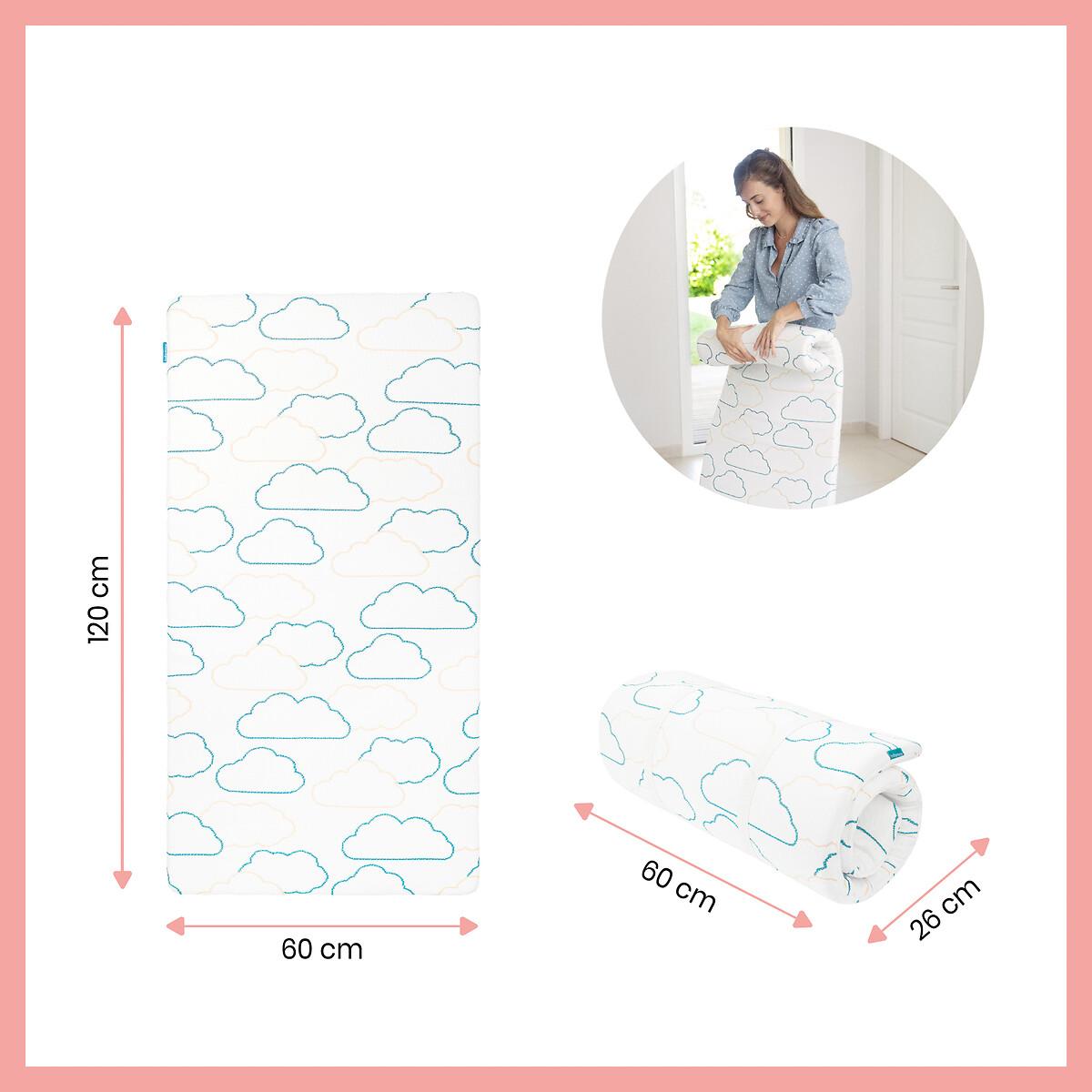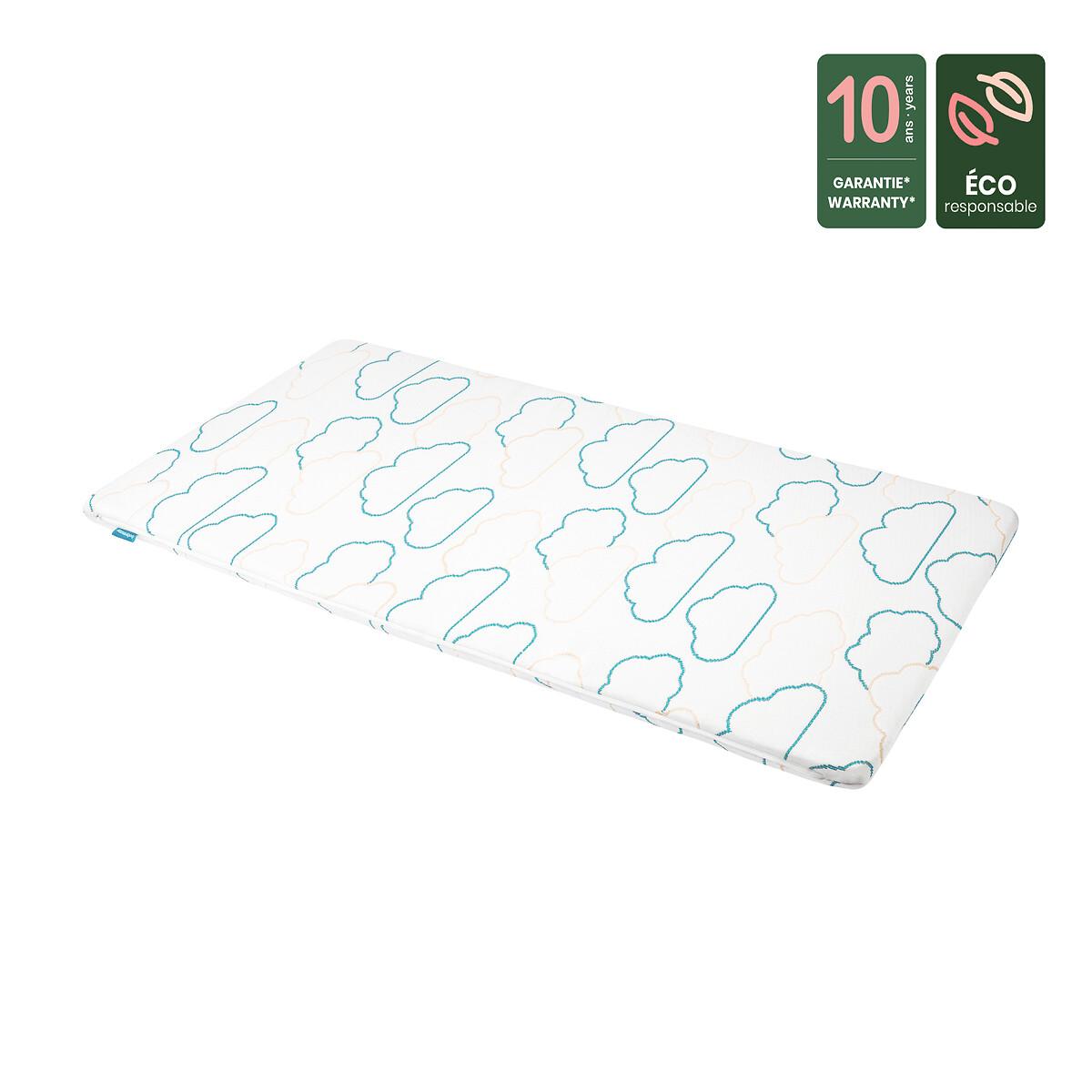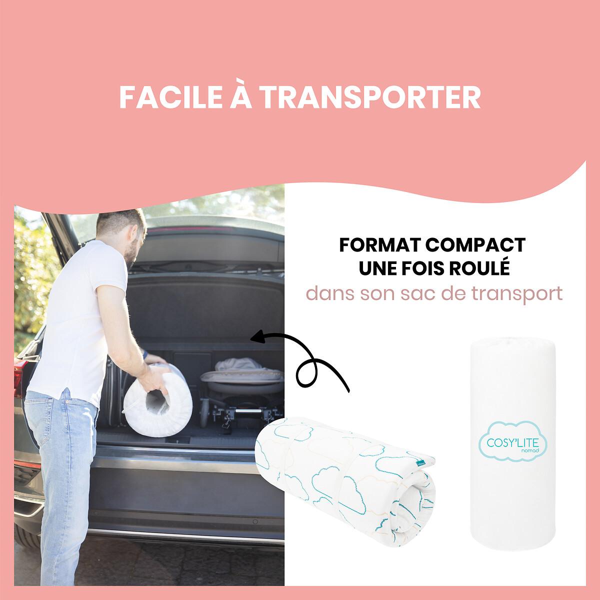 The soft travel mattress you can take anywhere ! Product Details. When you go away for the weekend to visit friends or grandparents, you have a lot of things to pack for your child and space can quickly run out. ! The Cosy'Lite Nomad travel mattress from Babymoov will be your ally in guaranteeing your baby a soft night's sleep. Compact and very comfortable, it follows you wherever you go to keep your child happy. This Mattress is made from polyurethane foam with a density of 23kg/m3 for optimum support. The soft, quilted Cushion Cover is suitable for your baby's sensitive skin. This 120 x 60 cm extra mattress is a universal size mattress. Suitable for all umbrella beds and cots of the same size. For ease of transport, the Mattress rolls up easily and is stored in its recyclable carry bag (included). It takes up a minimum of space when stored (60 x 26 cm), so you can simply slip it into the boot of your car. The practical Nomad Mattress has removable covers and a cover that can be machine-washed at 30°. For added safety, the fastening tab has been deliberately removed from the product. To open and close the fastening, you'll need to insert a paperclip into the slider, for example. Don't forget to remove it as soon as the Mattress is installed. ! And because our actions today determine our children's future, Babymoov is committed to reducing its environmental footprint. To look after future generations, we are changing our production and consumption patterns step by step and moving forward together towards more environmentally-friendly practices, while protecting their fragile skin: • The Cushion Cover is eco-designed with 100% recycled NEWLIFE polyester thread from plastic waste collection. 8 plastic bottles were recycled to make 1 mattress cover. • The Cosy'Lite Nomad is made in Portugal, minimising the carbon footprint associated with its manufacture. Comfortable and nomadic, the Cosy'Lite Nomad mattress is your baby's dream travel companion. ! #GreenMoov. Why will you love it? • Soft and comfortable Mattress certified OEKO-Tex 100 • Firm foam with a density of 23kg/m3 • Soft-touch Cushion Cover for babies' sensitive skin • Cushion Cover eco-designed with NEWLIFE recycled polyester thread (1 cover = 8 recycled bottles) • Compact with its optimised rolled shape (4.5 cm thick) • Nomad with carry bag included (folded) : 60x26cm) • Removable & machine washable (30°) Cushion Cover • For use in all 60x120cm beds • Made in Portugal Material: • Polyurethane foam • 100% recycled polyester Cushion Cover Technical Information: • Thickness: 4.5cm/2" • Density: 23kg/m3 • Mattress weight : 1.08kg / Carrying bag weight : 0.06kg. Care instructions: Cushion Cover machine washable at 30° • Dimensions • 120cm x 60cm x 4.5cm • Made in Europe.