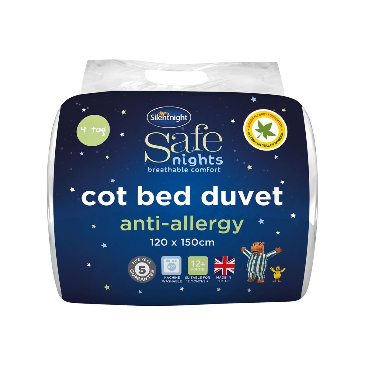 The Silentnight Cot Bed Duvet makes a great first duvet for your little one. The snuggly duvet has been specially designed for children, it’s important that small children don’t overheat in bed, so the light and soft duvet comes in a 4 tog weight rating. Made from a smooth polycotton cover offering breathable comfort. The products are filled with anti-bacterial anti-allergy hollowfibre that actively defends against the bacteria and dust mites that can cause allergies providing a cleaner, fresher and altogether a safer option for a good night's sleep. Our anti-allergy fibres are approved by the British Allergy Foundation, which means they have the ultimate seal of approval. Our fibres have been scientifically tested and are proven to reduce or remove allergens from the indoor environment. BACTERIA BLOCKER: Filled with soft anti- bacteria anti-allergy hollowfibre that will protected your little one from bacteria and dust mites that may cause allergies, leaving your duvet fresh and hygienic. CERTIFIED SAFETY: Produced in Oeko-Tex certified factories this range has the ultimate seal of approval for safety standards. ALL YEAR ROUND: This light weight 4 tog duvet keeps your little one warm and snuggly in the winter, whilst being light weight enough for a peaceful night’s sleep during the warmer summer nights. MACHINE WASHABLE: Easy to care for, machine washable to keep fresh and tumble dried on a low heat, made in the UK. AWARD WINNING - Part of Silentnight’s award-winning safe night’s collection creating safe and breathable products for your baby. Product Dimensions- L70 x W140cm. Suitable only for children over 12 months. The duvet is fully machine washable, and thanks to the easy care polycotton covers, the products have great recovery and can be washed time and time again. This product will be dispatched by one of our trusted suppliers. You’ll be contacted by their selected courier about your delivery. Goods must be unused and returned in their original packaging. If sealed for health/hygiene reasons they must also be returned unopened with seals, stickers and tags intact.