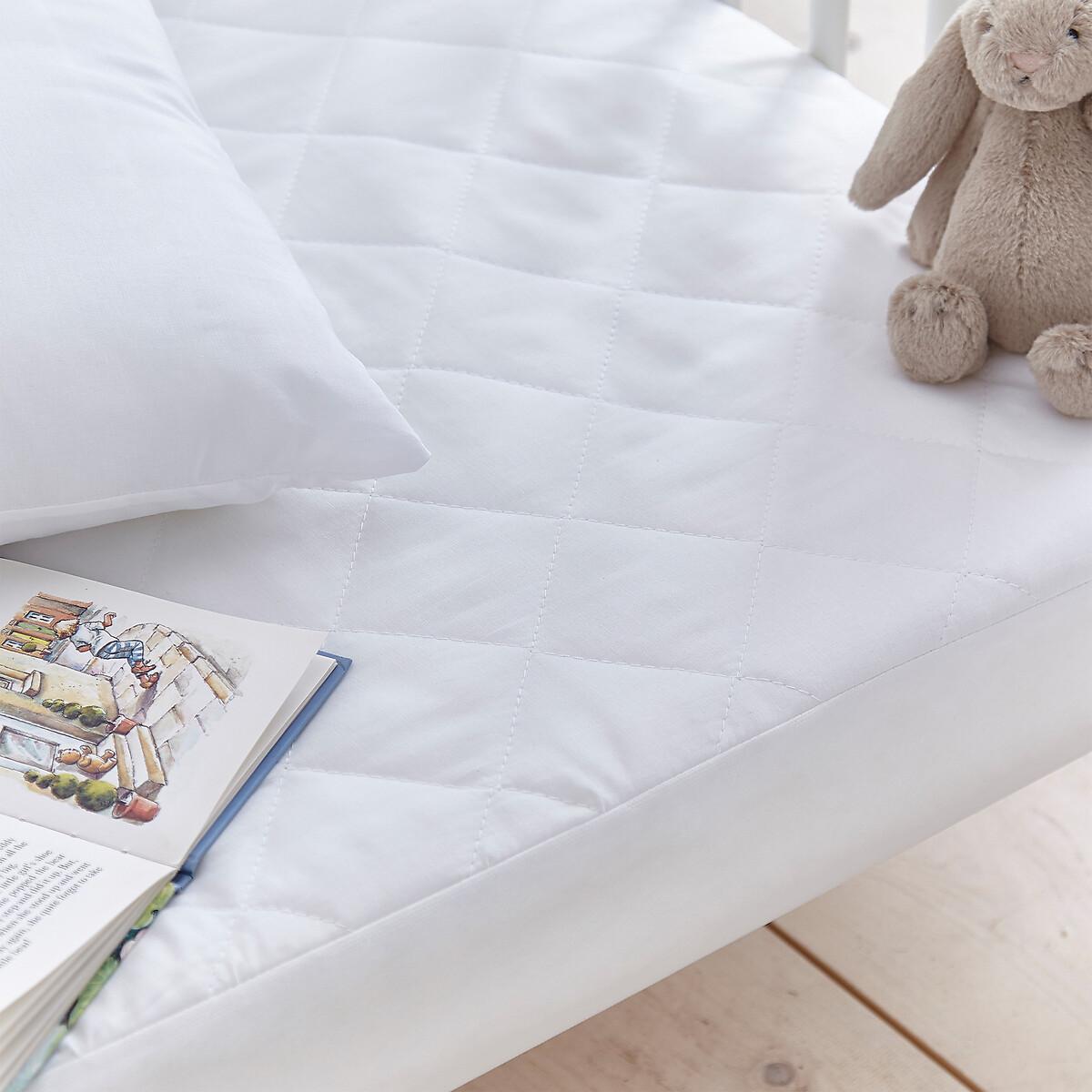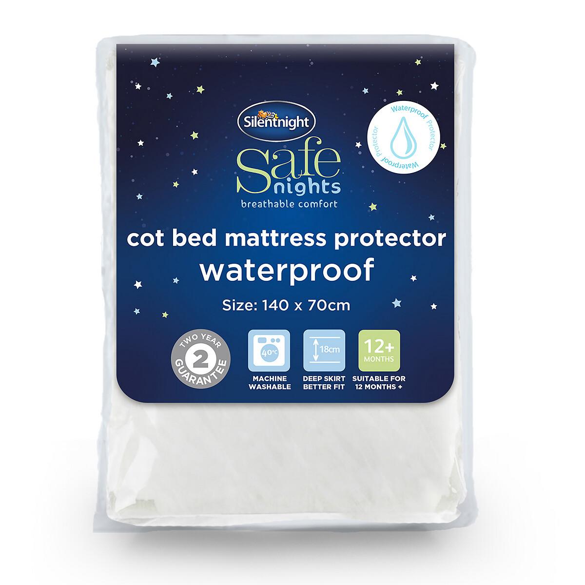 Help shield your little one’s mattress against any night-time accidents and spillages with the Safe Nights Waterproof Cot Bed Mattress protector from Silentnight. Made with soft-touch quilted fabric for comfort, featuring a fitted skirt for extra protection and a secure fit, this protector wraps around the sides of your mattress for complete coverage.• WATERPROOF:Fully waterproof to protect your little one’s mattress from any night-time accidents or spillages, along with protecting from general wear and tear.• SOFT-TOUCH & BREATHABLE:The soft-touch cover is breathable and comfortable and so your baby can enjoy a restful sleep.• COMPLETE COVERAGE:The 18cm fitted skirt hugs around the sides of your cot bed mattress for ultimate protection.• HYPOALLERGENIC:Kind to skin and does not include any contents likely to cause allergies.• AWARD-WINNING: Part of Silentnight’s award-winning Safe Nights collection, tried and tested by mums.• MACHINE WASHABLE:Machine washable at 40 degrees and can be tumble dried on a low heat. Product Dimensions- L70 x140cm. This product will be dispatched by one of our trusted suppliers. You’ll be contacted by their selected courier about your delivery. COMFY01. Goods must be unused and returned in their original packaging. If sealed for health/hygiene reasons they must also be returned unopened with seals, stickers and tags intact.