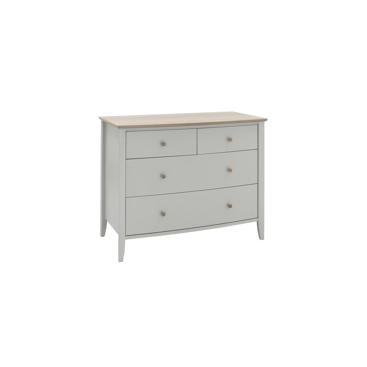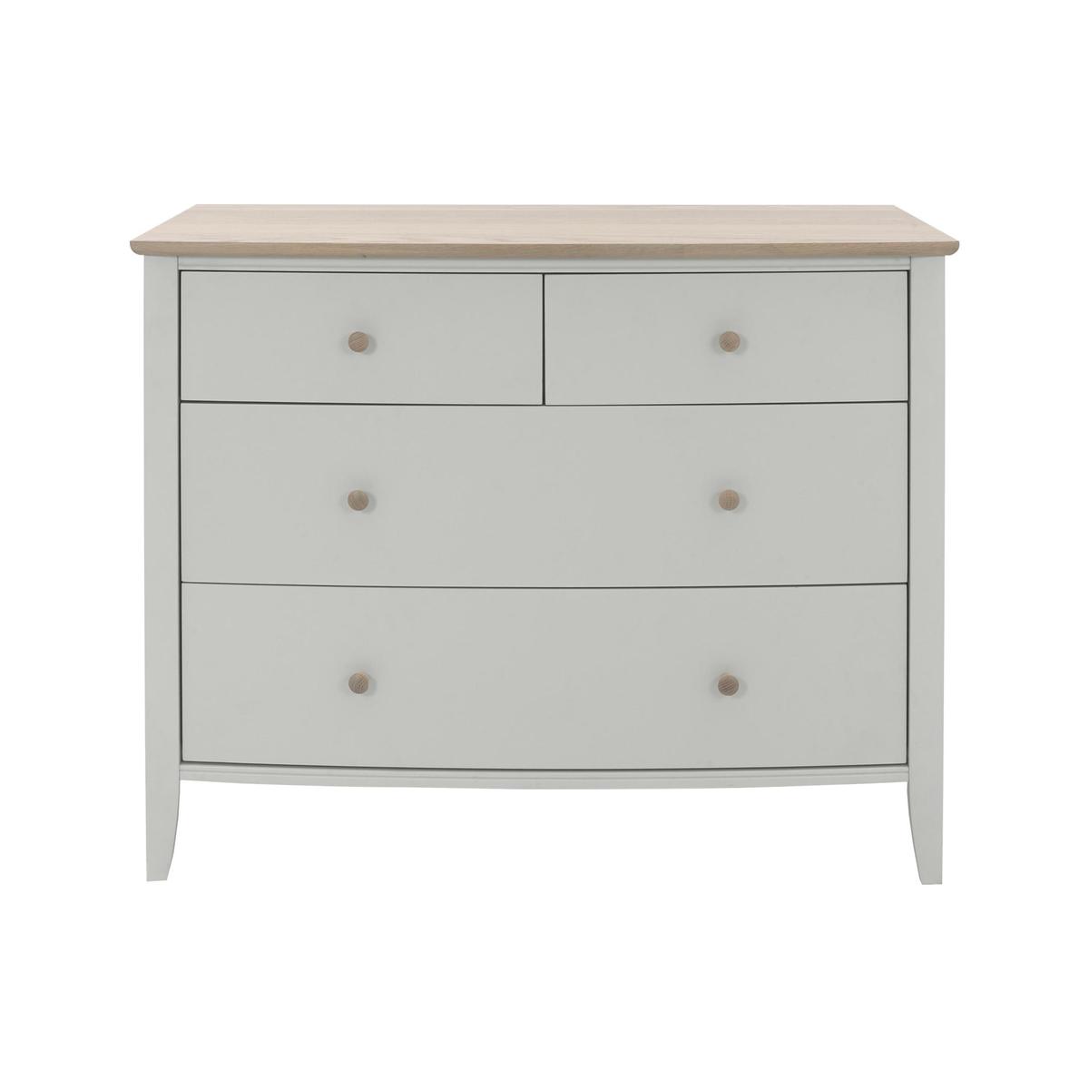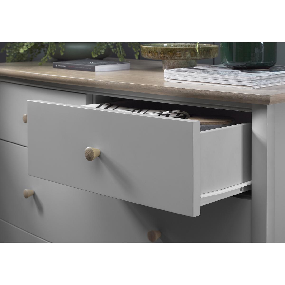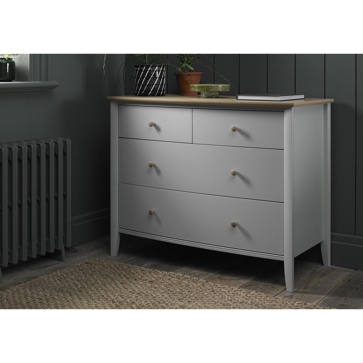 Contemporary elegance inspired by clean-lined Scandinavian design. The carefully curated Cotswold bedroom furniture collection offers a choice of chests of drawers as well as a beautiful bed frame, spacious double wardrobe and charming dressing table, all of which feature the collection’s two-tone natural wood and painted finish. The details are lovely, too, from the turned wooden drawer pulls and gently curved chest tops to the tapered legs and simple grooved detail that completes the look. Beautifully made and perfect for both modern and classic homes. Modern and sophisticated style. Beautiful wood grain effect finish. Exclusive to Furniture Village. Introduce sophisticated contemporary storage to your bedroom with the London Bedrooms Paddington 6 Drawer Wide Chest. This large chest offers you ample storage room, from the biggest items like chunky winter knits to small accessories. With six spacious drawers there’s even space for two people to store their clothes comfortably. Each drawer features a reinforced base, a soft close mechanism and easy-glide metal runners which makes this chest as practical as it is beautiful. Its natural-looking painted wood-effect finish on the drawers comes in two shades – light grey and anthracite grey - to complement all types of décor. The outside is finished in a contrasting sleek, glossy Fired Earth taupe colour, while its clean-lined angles and slimline brushed nickel handles are a stylish finishing touch. Exclusively available at Furniture Village, the London Bedrooms Paddington 6 Drawer Wide Chest is part of the sophisticated London Bedrooms Paddington range. Discover a stylish collection of contemporary bedroom storage furniture made for the modern home. WARNING!. Furniture can tip over unexpectedly and cause injury. This item shall be fixed to a wall using the anti-tip kit provided with the furniture. Be sure to use the correct wall fixings suitable for the walls in your home.