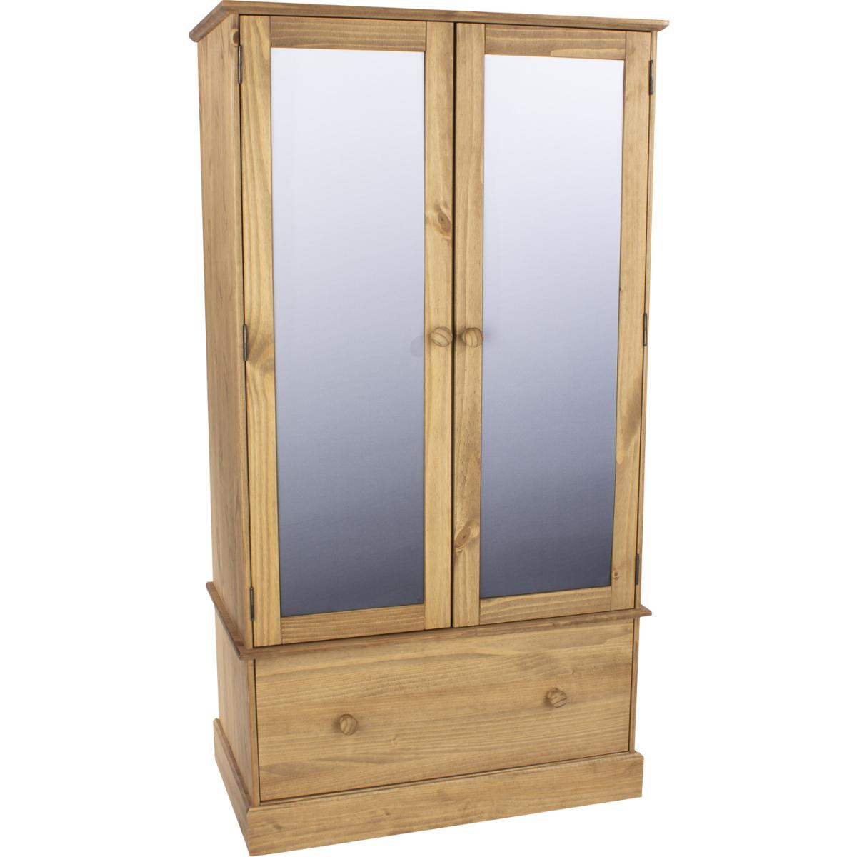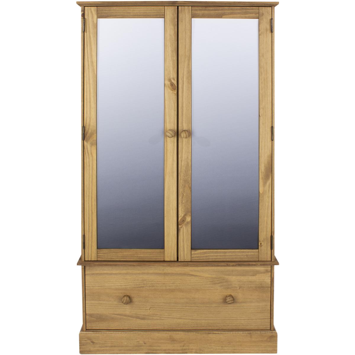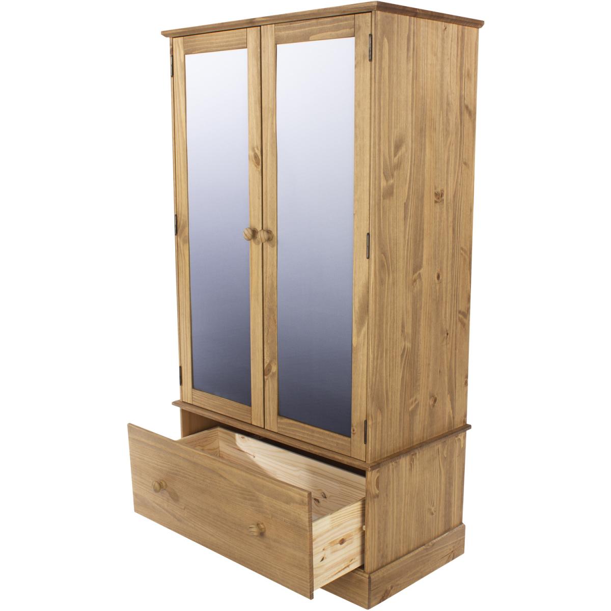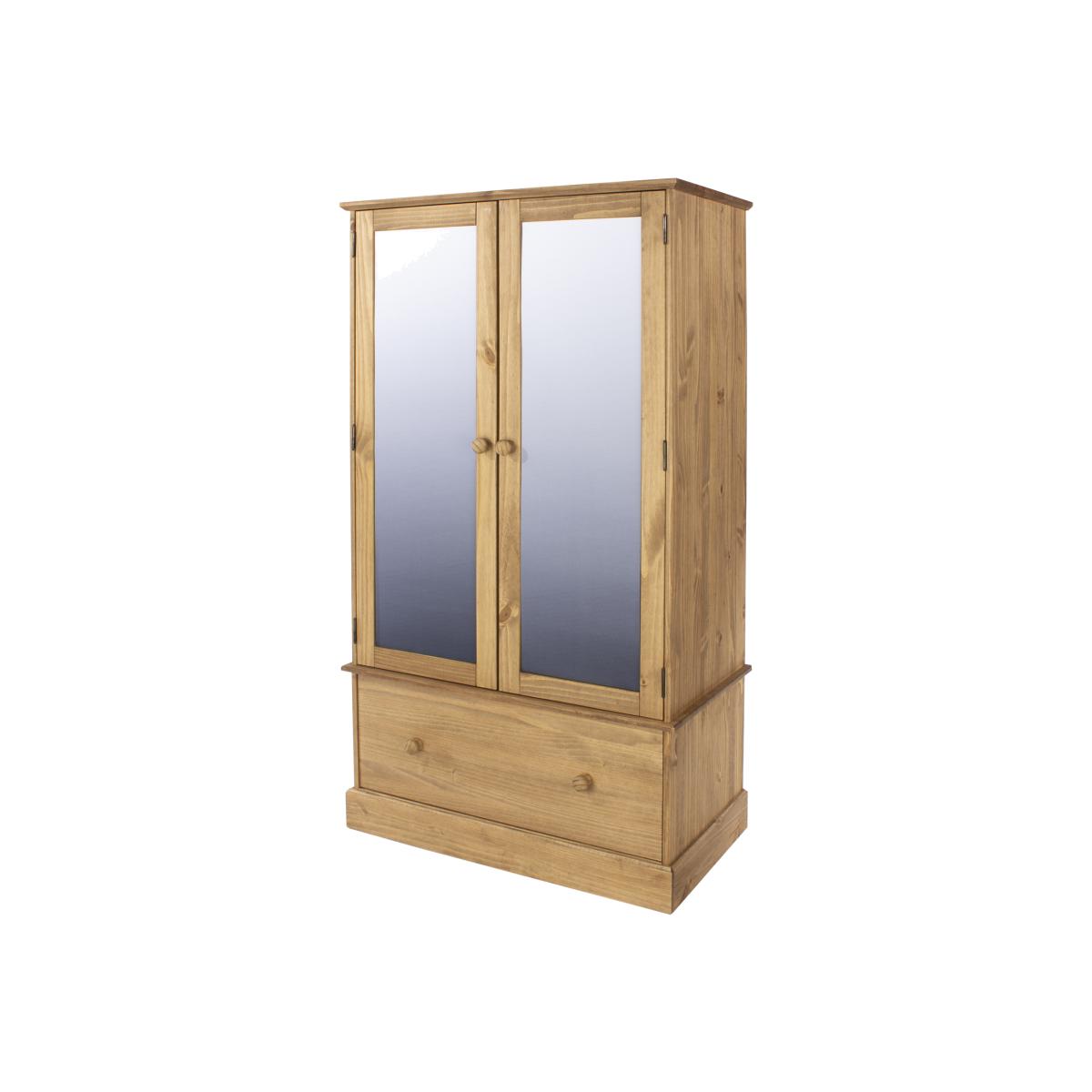 The Cotswold range is a classic country styled collection which will suit most styles of home. This real pine 2 door wardrobe with mirrored doors and a deep drawer underneath is generously proportioned allowing plenty of storage space. The drawer is perfect for bulkier items such as jumpers or bedding. The robe has an internal hanging rail and the mirrored doors are safety backed for your peace of mind. It has a chunky solid pine top with profiled edges for a softer look. The wardrobe is finished in an antique wax with matching wooden handles.