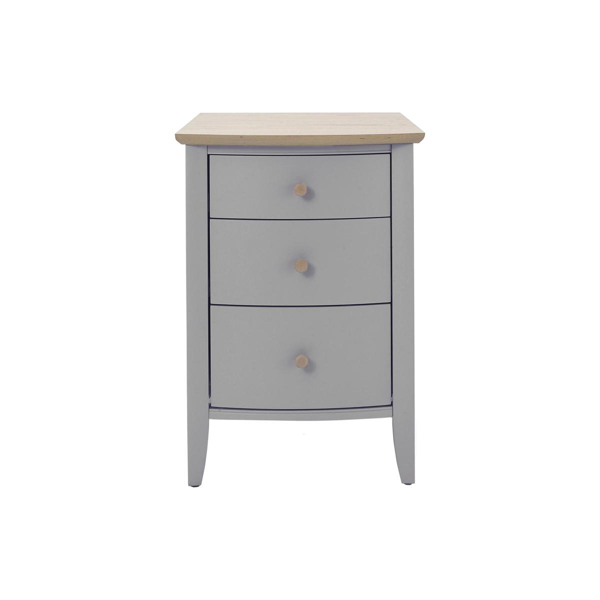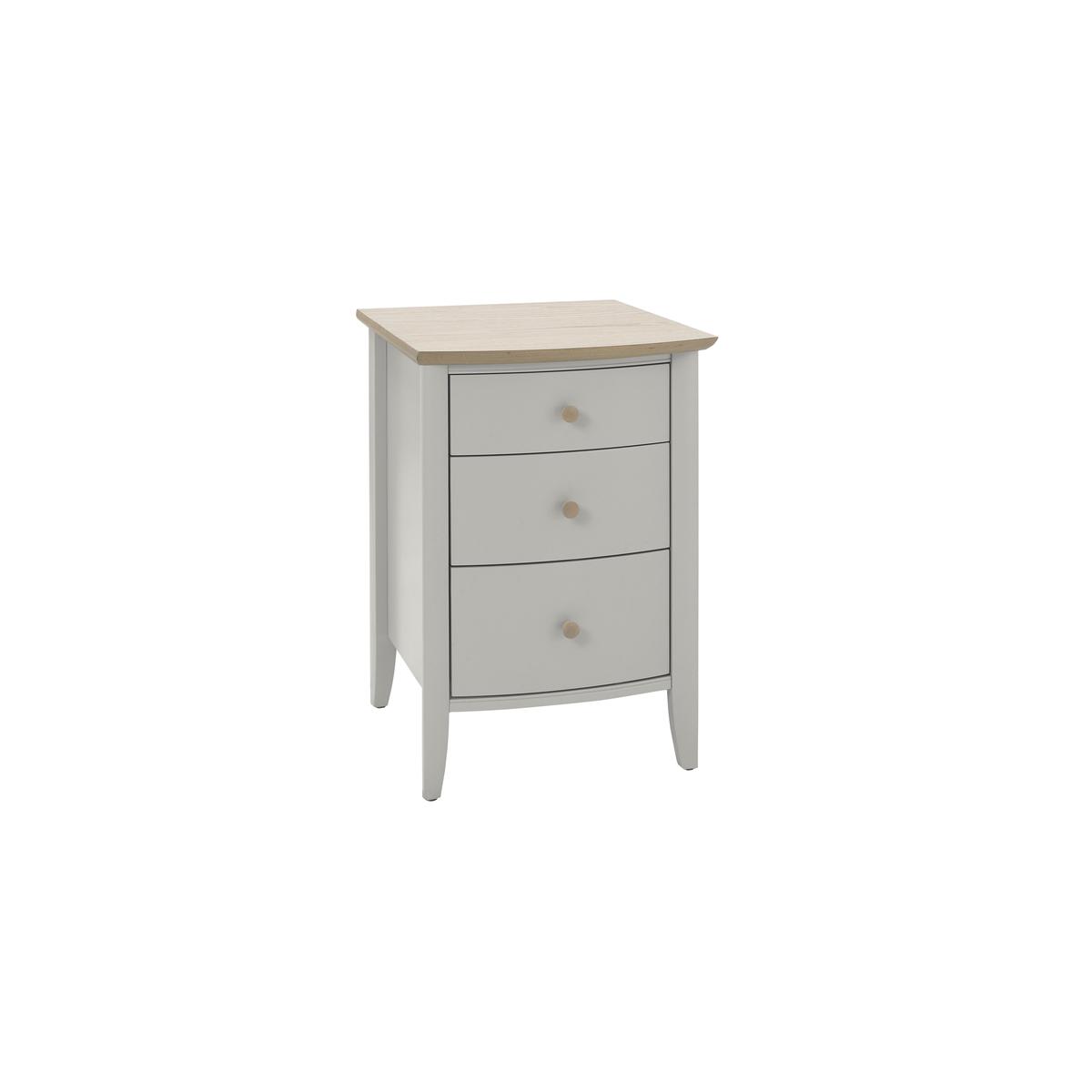 Contemporary elegance inspired by clean-lined Scandinavian design. The carefully curated Cotswold bedroom furniture collection offers a choice of chests of drawers as well as a beautiful bed frame, spacious double wardrobe and charming dressing table, all of which feature the collection’s two-tone natural wood and painted finish. The details are lovely, too, from the turned wooden drawer pulls and gently curved chest tops to the tapered legs and simple grooved detail that completes the look. Beautifully made and perfect for both modern and classic homes. Scandinavian-inspired design with an elegant modern feel. Fine details and a fashionable two-tone wood and painted finish. Available in two colours including Furniture Village-exclusive soft grey. With plenty of room for books, magazines and all your bits and pieces, the Cotswold 3 drawer bedside cabinet is a practical choice. It’s also an extremely stylish one, thanks to the elegant Scandinavian-inspired design and attractive two-tone finish. Crafted from white oak and white oak veneers and set on tapered legs, this roomy bedside cabinet has three spacious drawers framed by attractive grooving at the top and bottom. Drawers are bowed and are finished with turned wood drawer pulls. The outward curving top is made of wood while the painted frame is available in two colours – warm grey, a striking mid-toned grey, and Furniture Village-exclusive soft grey, a lighter more delicate grey. The Cotswold 3 drawer bedside cabinet is part of the Cotswold bedroom furniture collection at Furniture Village. The range makes it easy to redesign your whole bedroom in elegant style as it offers a wide choice of chests of drawers and bedside cabinets as well as a bed frame and a wardrobe. Please note. The grain of the wood and other natural markings may be visible through the painted finish. WARNING!. Furniture can tip over unexpectedly and cause injury. This item shall be fixed to a wall using the anti-tip kit provided with the furniture. Be sure to use the correct wall fixings suitable for the walls in your home.