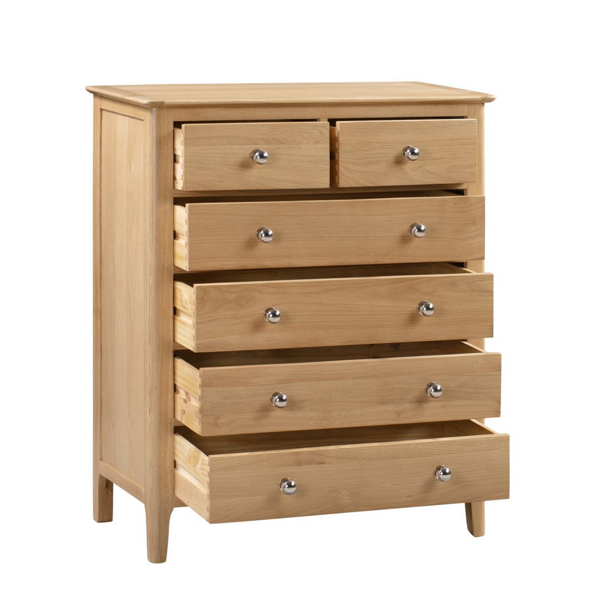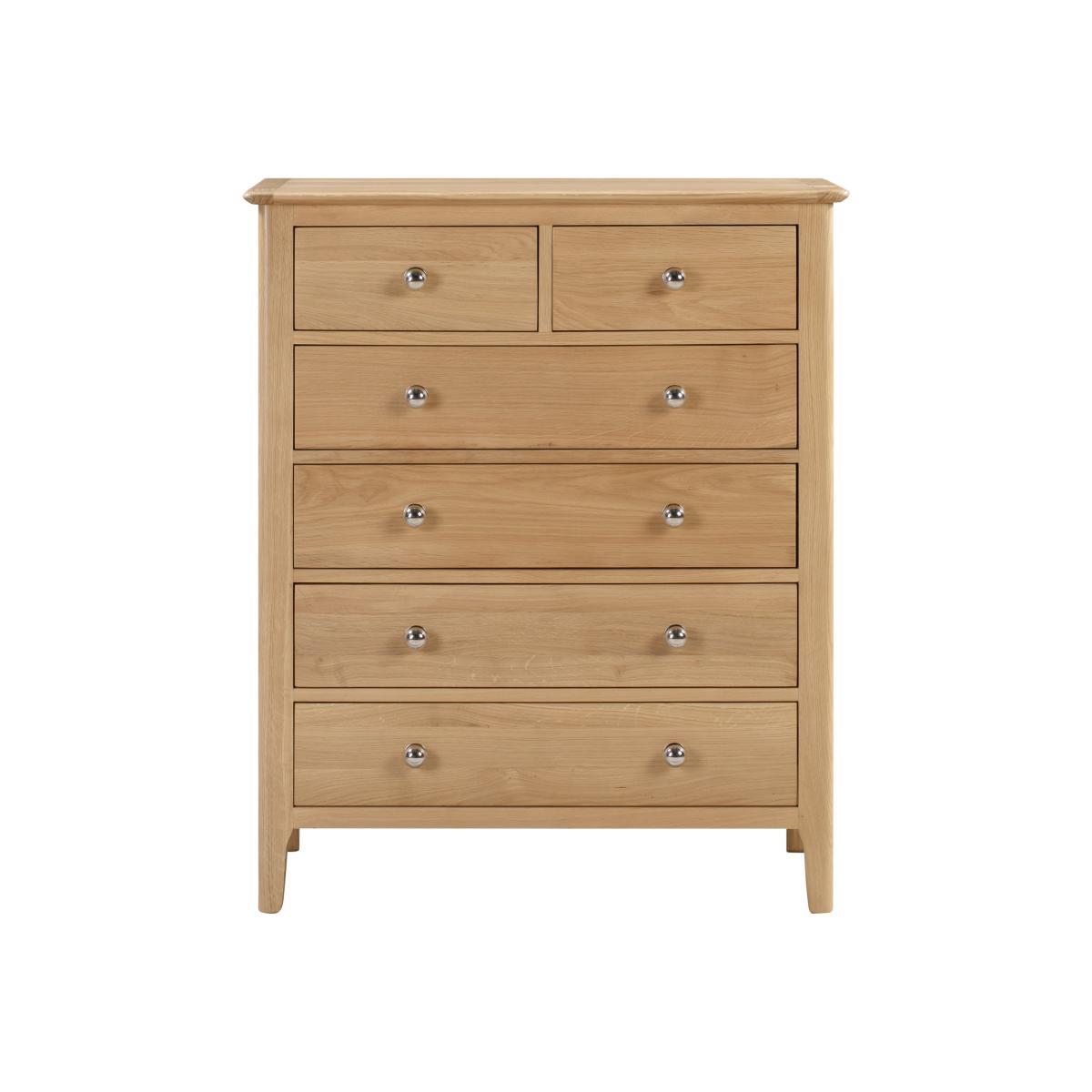 Crafted from solid oak and oak veneers, the Cotswold chest of drawers boasts long lasting durability and a timeless design. Complete with two small and four large drawers decorated with silver handles, this fully assembled chest would make a great addition to any bedroom.