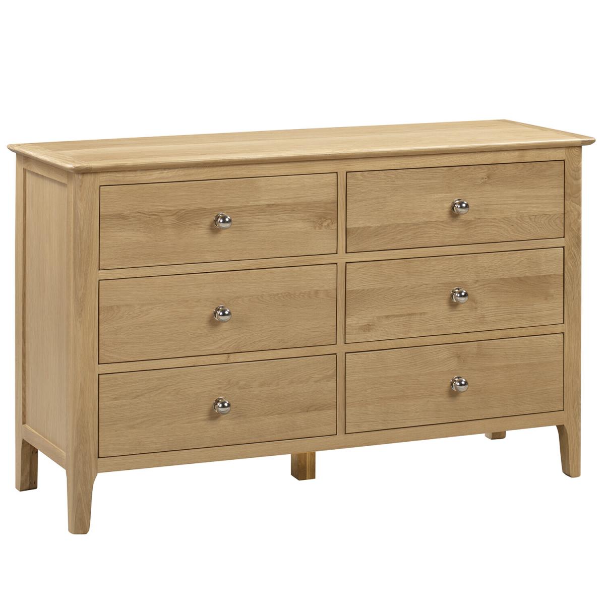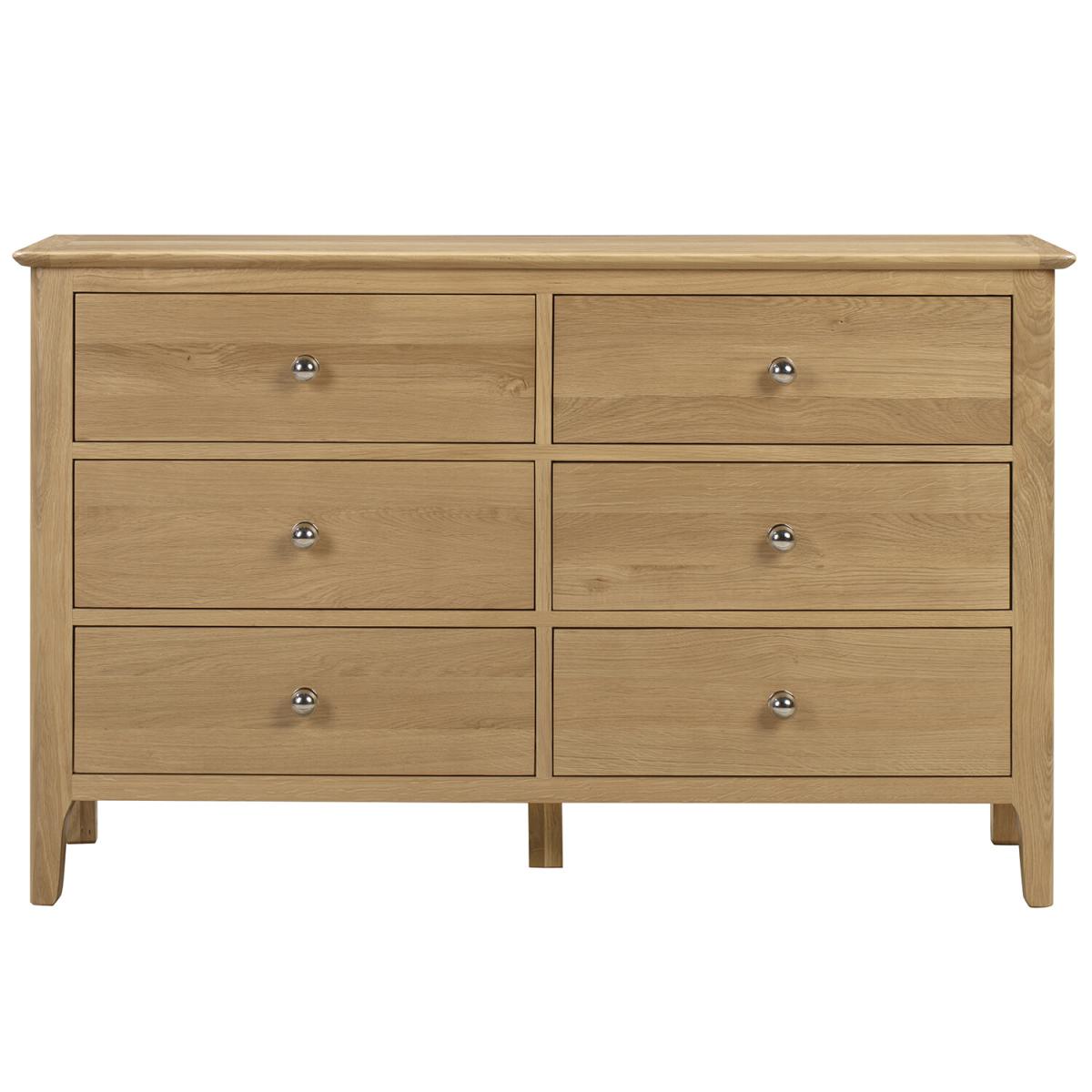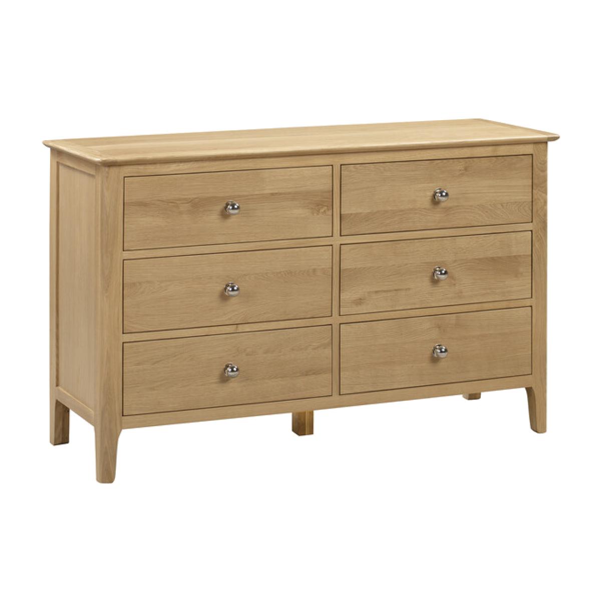 Crafted from solid oak and oak veneers, the Cotswold 6 Drawer Wide Chest ensures lasting durability with its robust structure. Featuring six large deep drawers, providing copious amounts of space to organise your belongings. This simple, yet elegant design is finished with a round silver knob, perfect for any traditional bedroom.