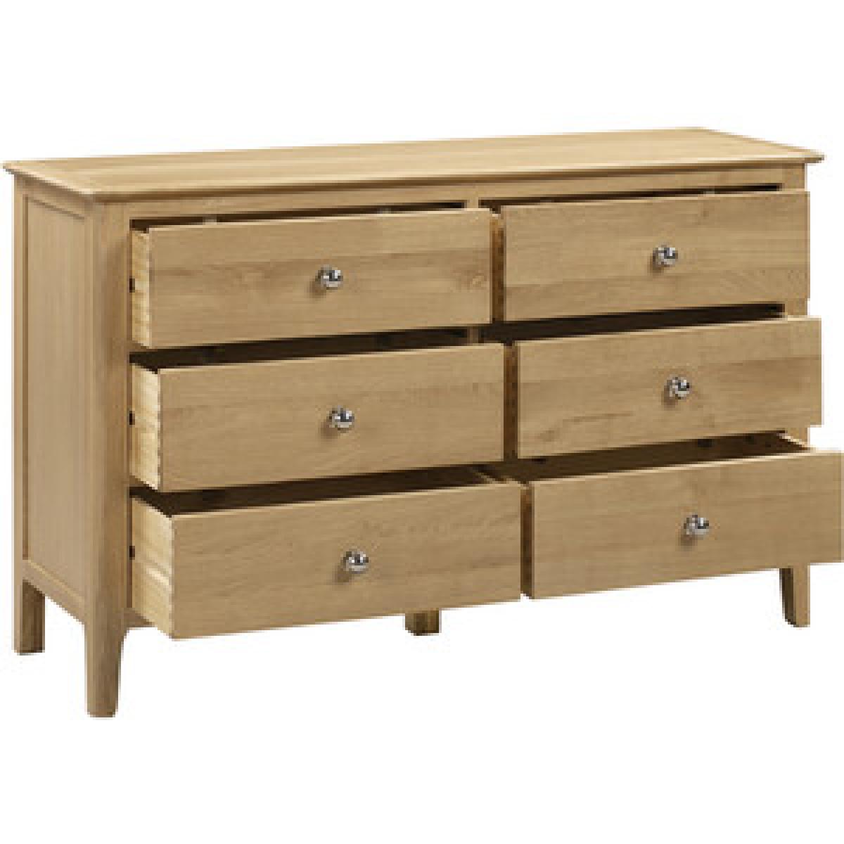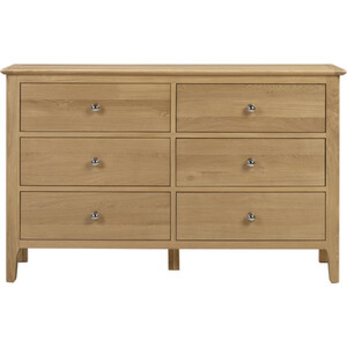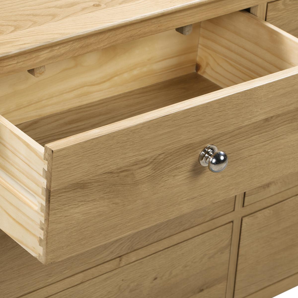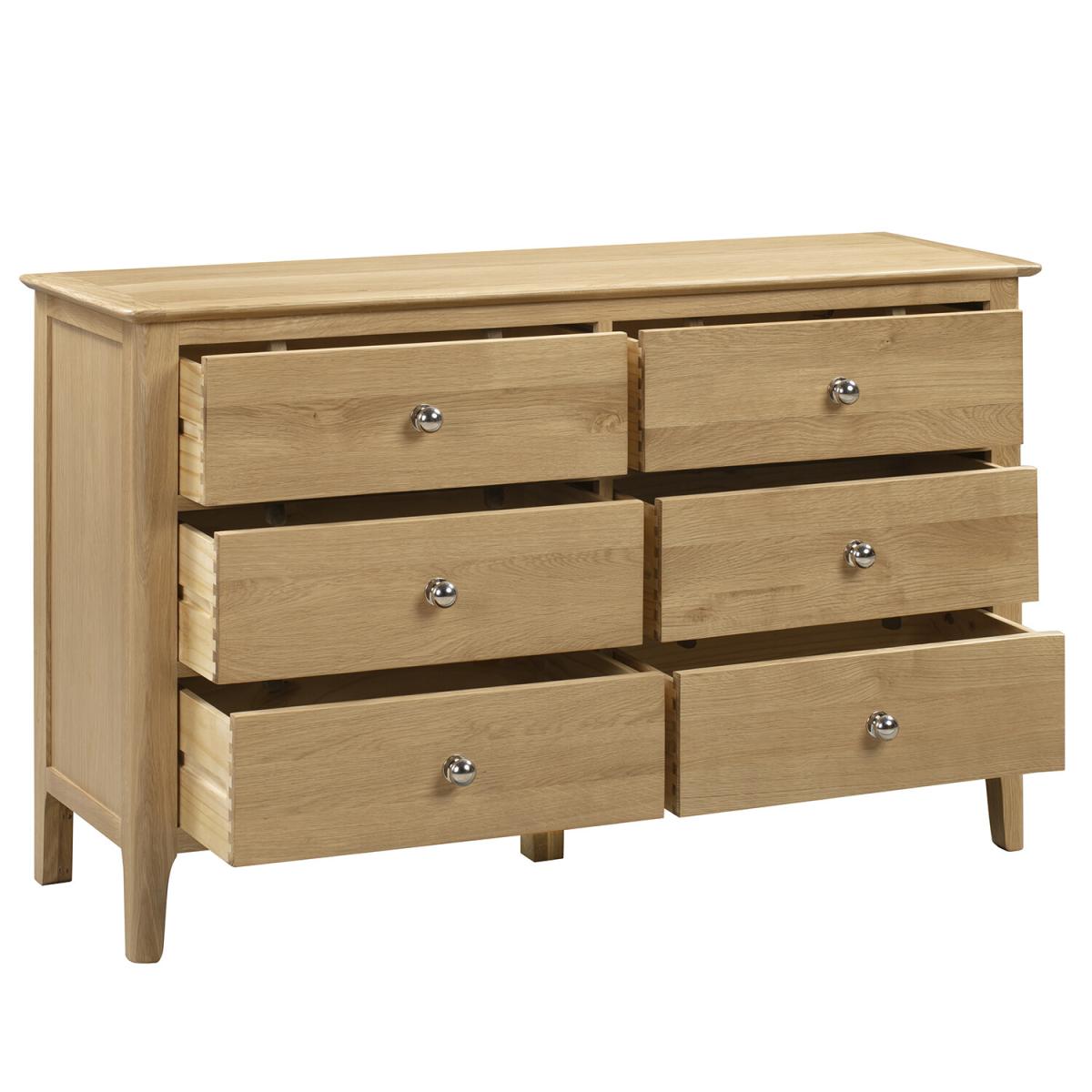 Crafted from solid oak and oak veneers, the Cotswold 6 Drawer Wide Chest ensures lasting durability with its robust structure. Featuring six large deep drawers, providing copious amounts of space to organise your belongings. This simple, yet elegant design is finished with a round silver knob, perfect for any traditional bedroom.