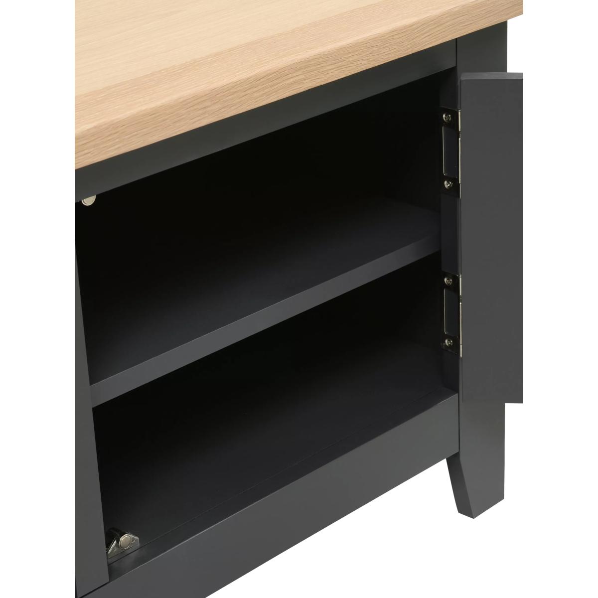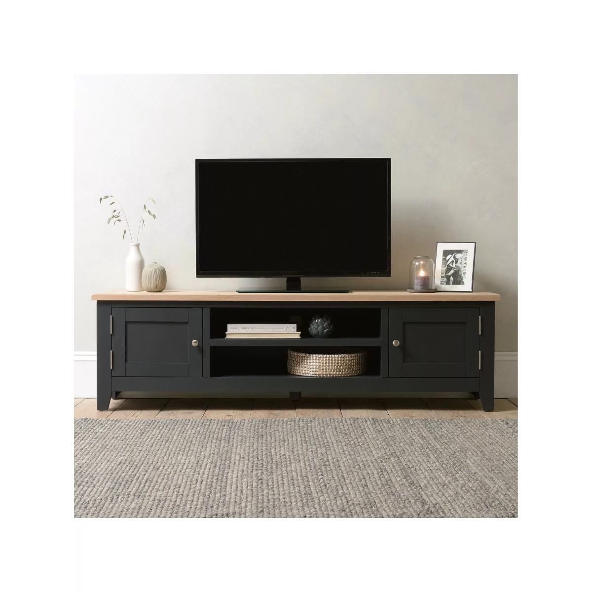 I’m a fan of how this Cotswold TV unit pairs a painted base with an oak-veneer top, so it brings warmth to both modern farmhouse and more pared-back Scandi or contemporary living rooms. Its low, extra-wide profile easily accommodates screens up to 80″ while still leaving space for soundbars or decorative accents at either end. Styling-wise, use the central shelves for neatly matched baskets or boxes to hide remotes and games consoles, and feed cables through the back cut-outs to keep everything looking tidy. On the surface, balance screen height with low lamps or a couple of slim picture frames, then soften the straight lines with a trailing plant or a small stack of coffee-table books for a relaxed, lived-in feel.
