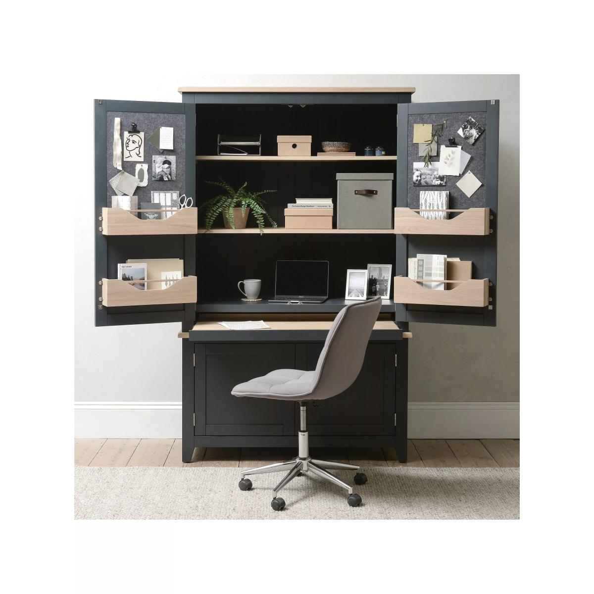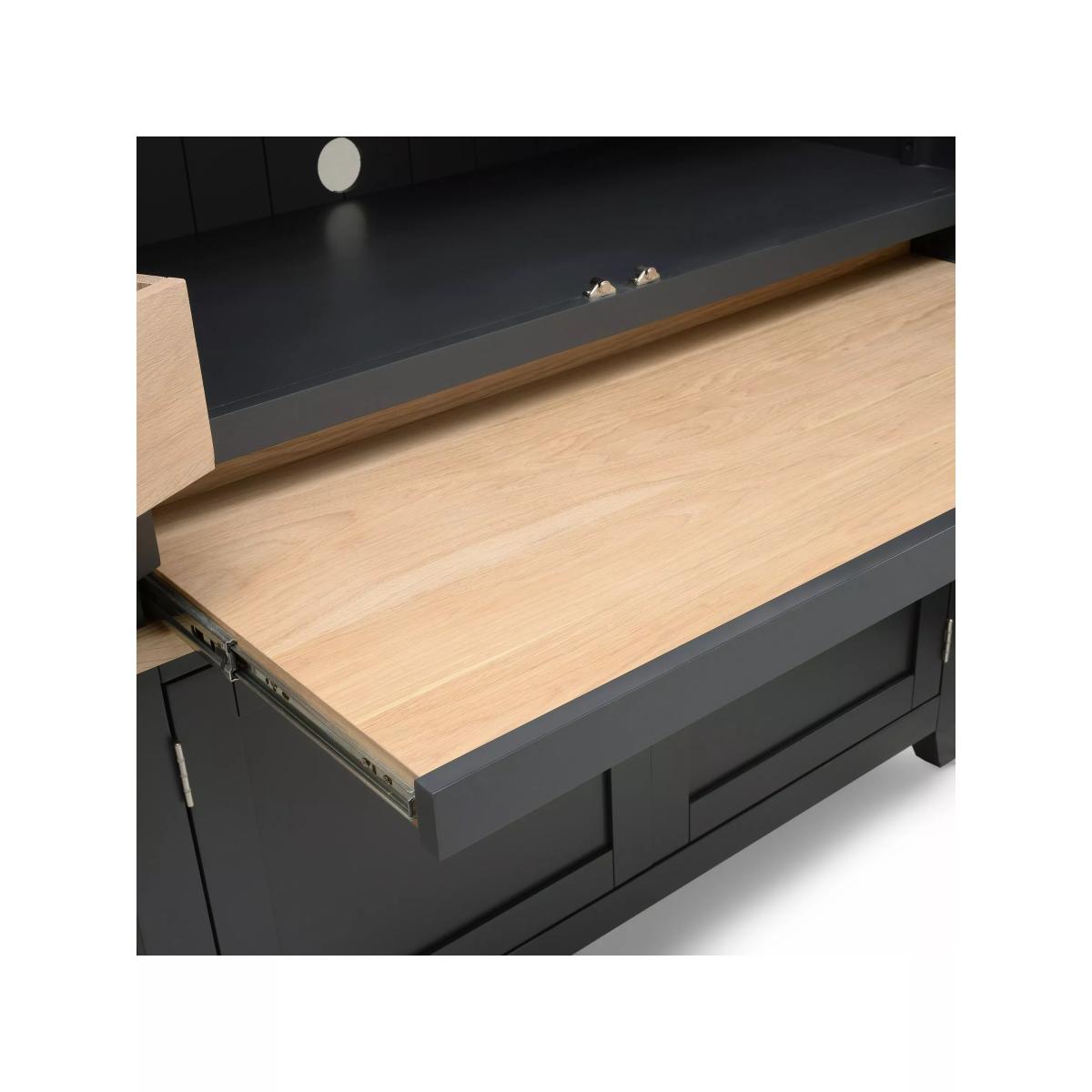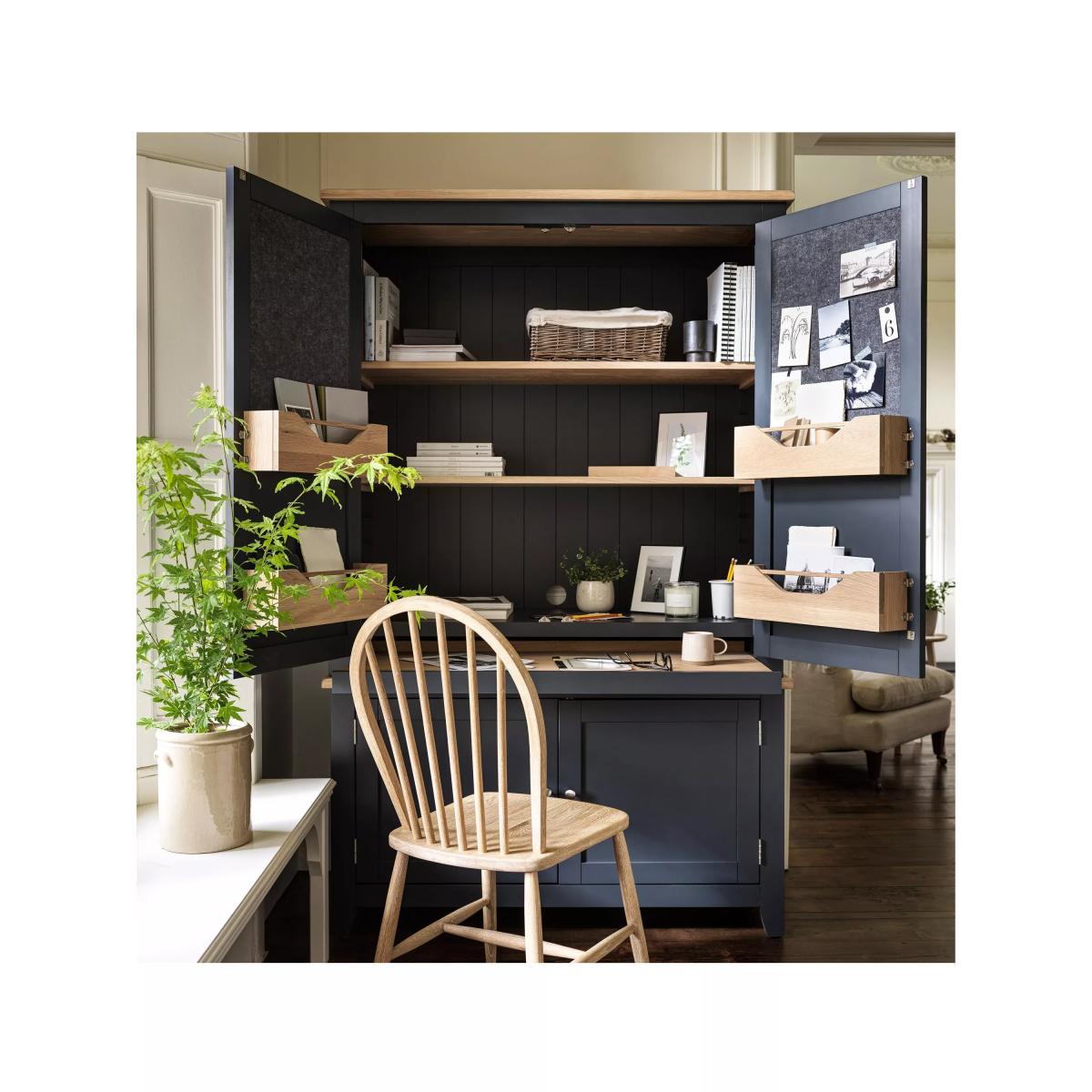 Cotswold's Chester hideaway home office is the perfect combination of function and style. Softly painted and with contrasting oak and oak veneer white wash details; this versatile item comes complete with two fully adjustable shelves, handy door mounted storage and a sliding desk surface. All of this sits neatly above more storage space, complete with a sliding tray to house your printer. Please note: owing to the size and weight of this item, we apply a specialised delivery service. Customers ordering this item will therefore be contacted to arrange delivery by Cotswold's bespoke team.