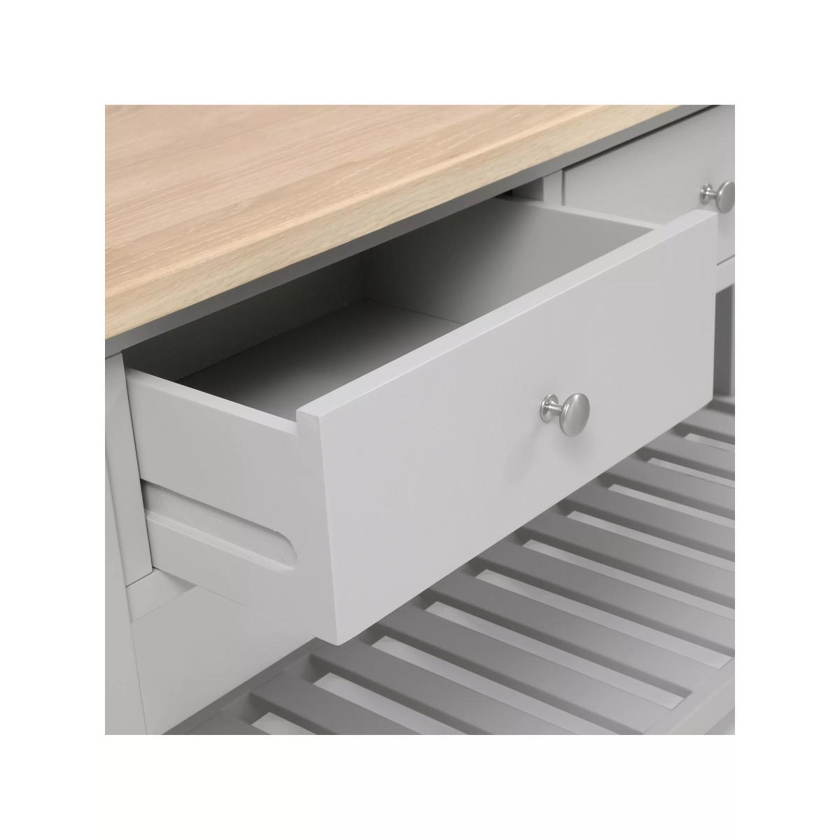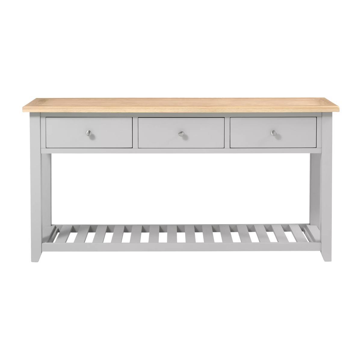 The sturdy top of this console table has been waxed and lacquered to bring out its characterful grain and contrasts beautifully with the grey paint finish on the frame and handy lower shelf. The three drawers will keep all your essentials easy to find and you get both smart polished handles and painted wooden handles, so its final appearance is up to you. Want to see it first? You may want to see and get a feel for the furniture in one of our shops before ordering. We'll be able to tell you where the range you'd like to view is on display.