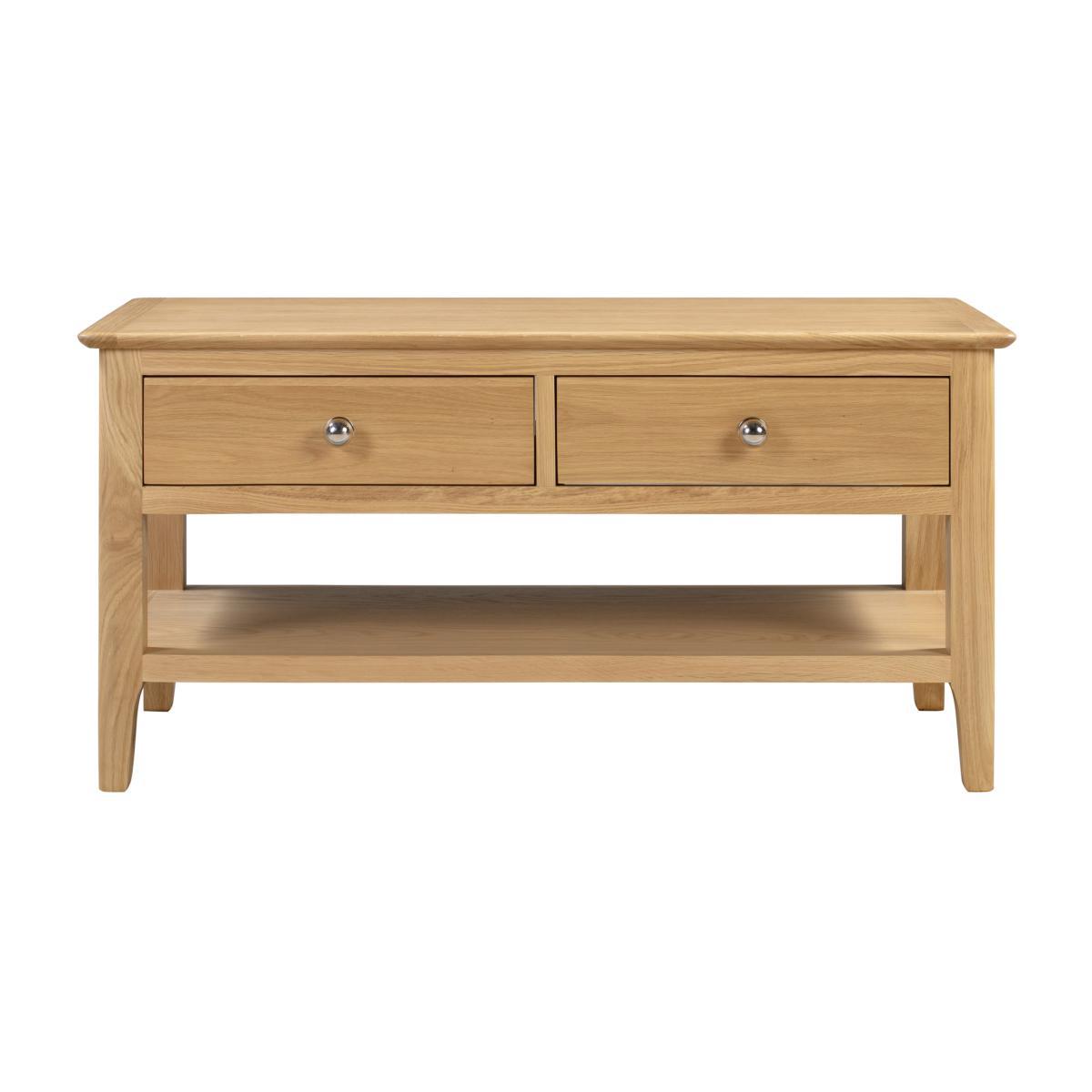 Crafted from solid oak and oak veneers, the Cotswold Coffee table boasts long lasting durability and a timeless design. Complete with silver handles, two spacious drawers and a large open shelf this fully assembled coffee table offers plenty of storage space and would make a great addition to any living room.