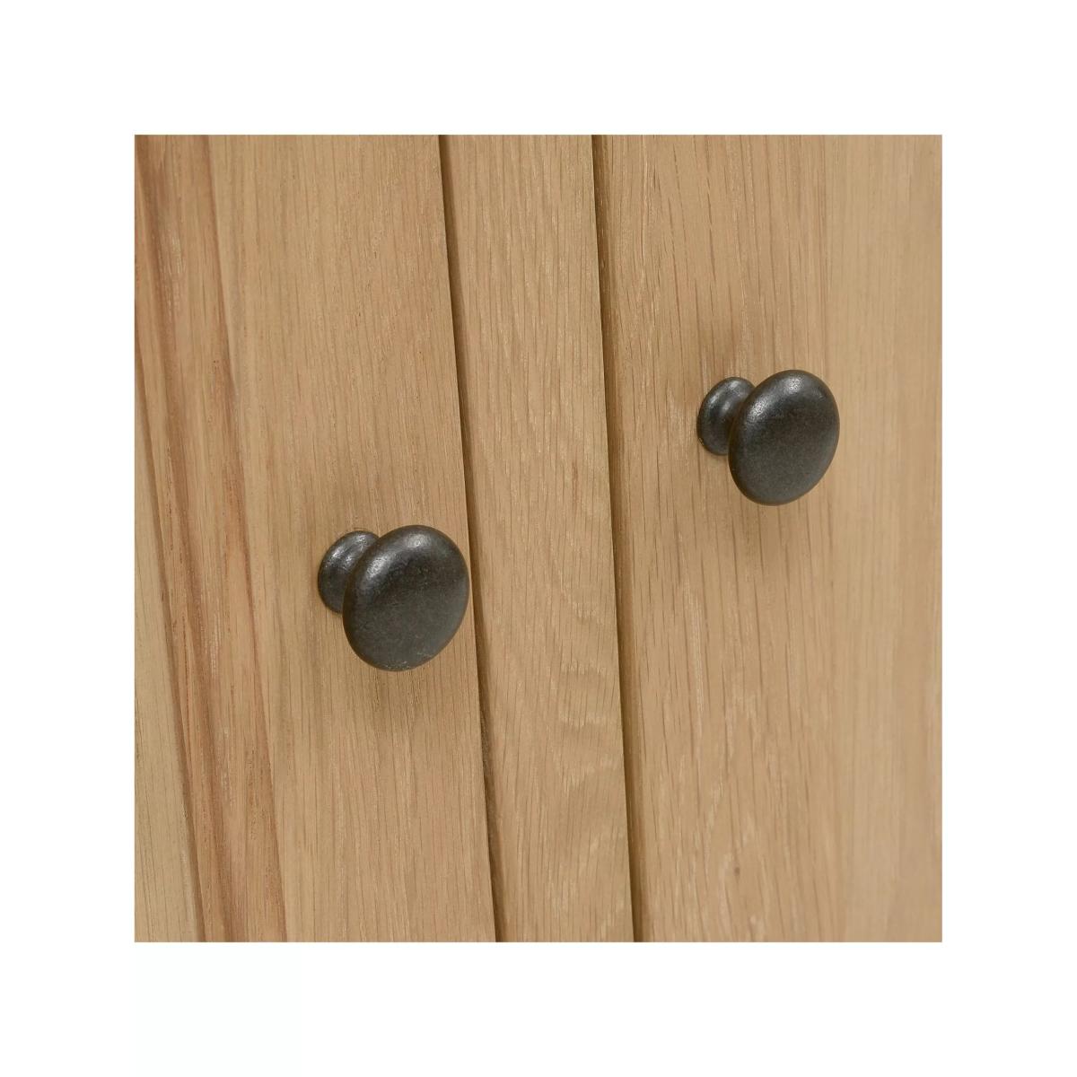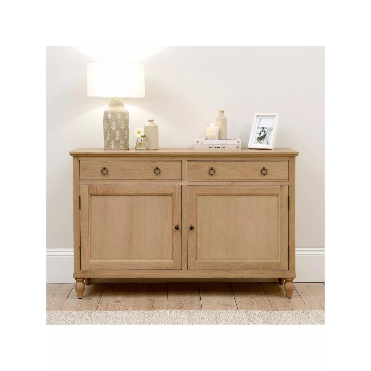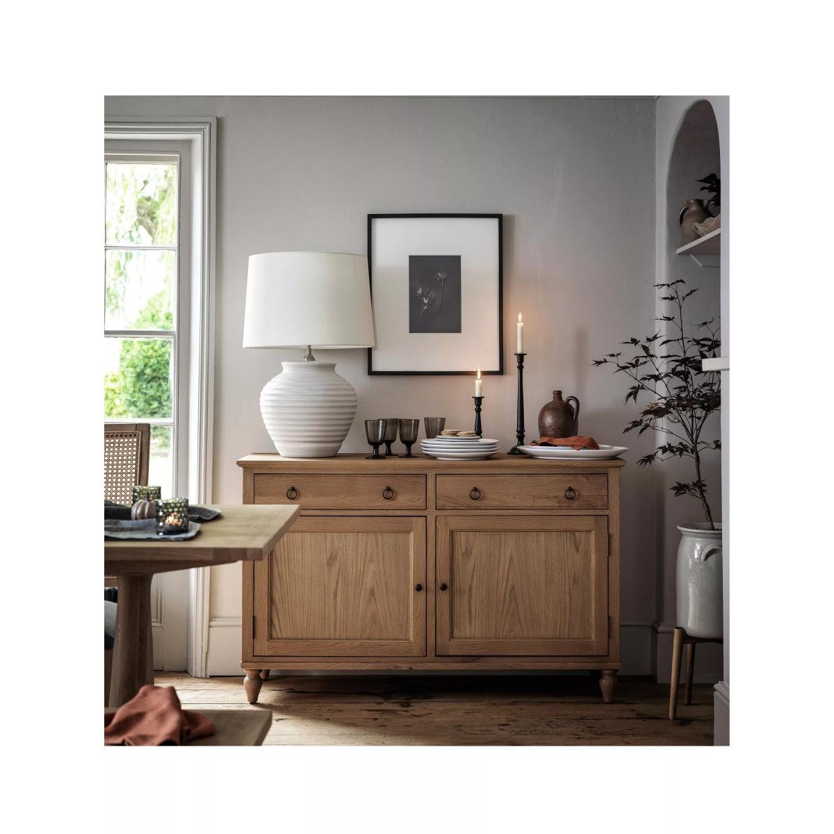 I’m a fan of this mellow oak sideboard for its warm, natural grain and solid construction - the turned legs and simple ring-pull handles give just enough character without overwhelming a room. It works particularly well in Scandi-inspired, modern farmhouse or coastal schemes, where its light hue keeps the palette fresh. Styling tip: balance height by pairing a low-profile lamp on one side with a small sculptural vase or framed print on the other, and tuck storage baskets behind the doors to keep surfaces clutter-free. A neat stack of coffee-table books or a shallow tray for keys and mail adds daily practicality.