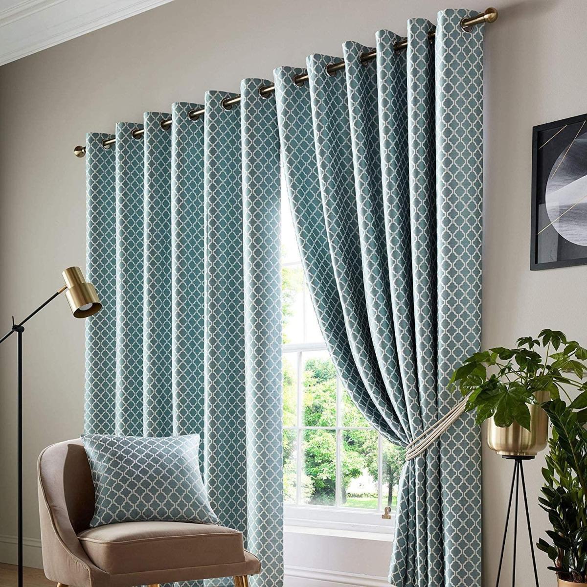 Cotswold eyelet curtains have a beautiful and contemporary geometric jacquard design in a modern on-trend colourway with contrasting white colourway. Classic quatrefoil style woven jacquard curtains that are fully lined and fitted with an eyelet ring top header suitable for a pole. Available in a range of sizes and colours. Eyelet ring top heading.