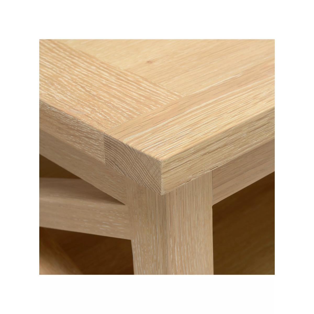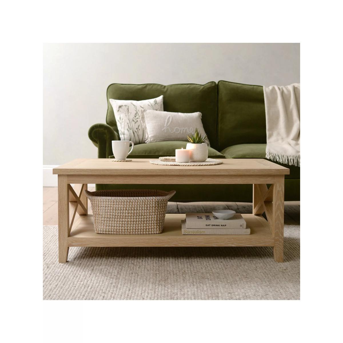 I’m a fan of this oak table for its clean, straightforward lines and pale white-wash that brightens a room without looking bulky. It works especially well in Scandinavian, coastal or modern farmhouse schemes where you want a touch of natural warmth. For styling, keep the top simple - perhaps a low ceramic vase with fresh blooms or a small potted plant on a neat tray - and use a woven basket or a couple of coffee-table books on the lower shelf to add texture and keep clutter in check.